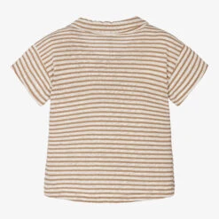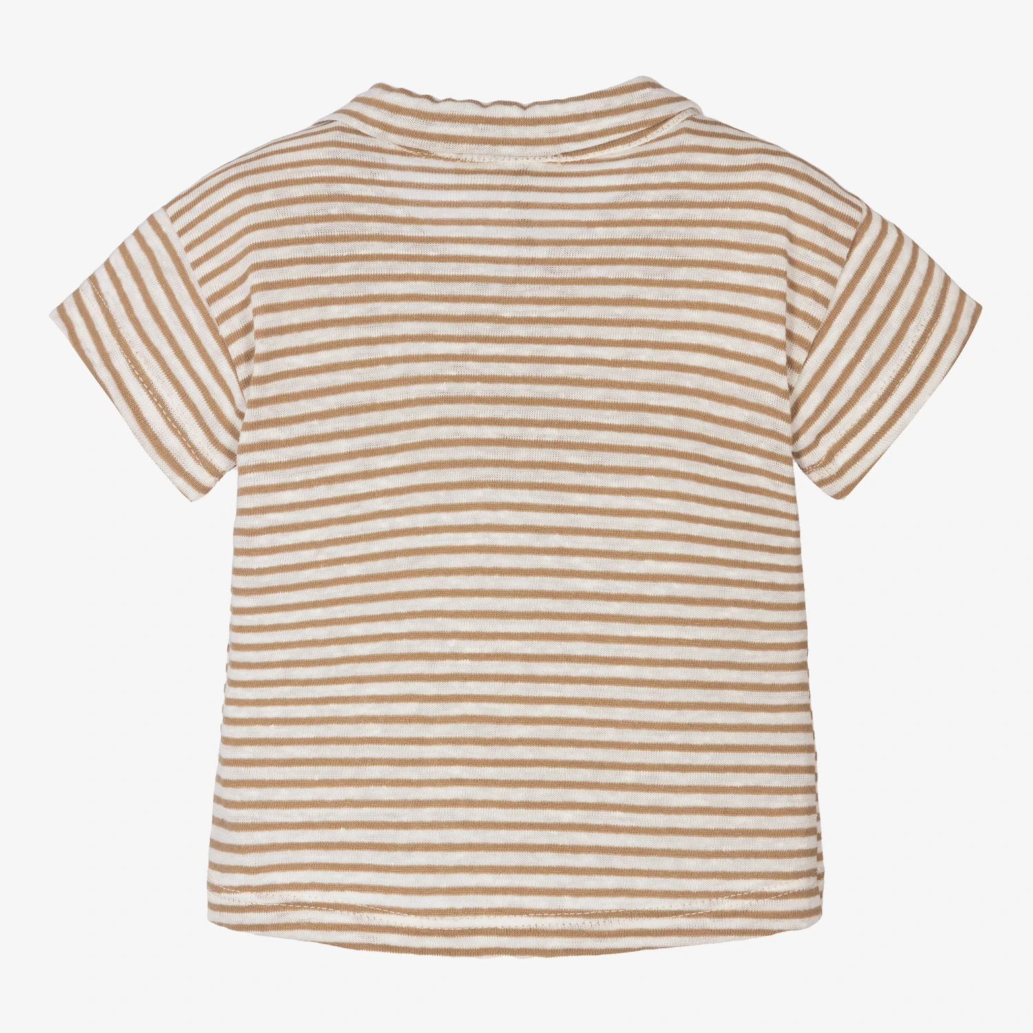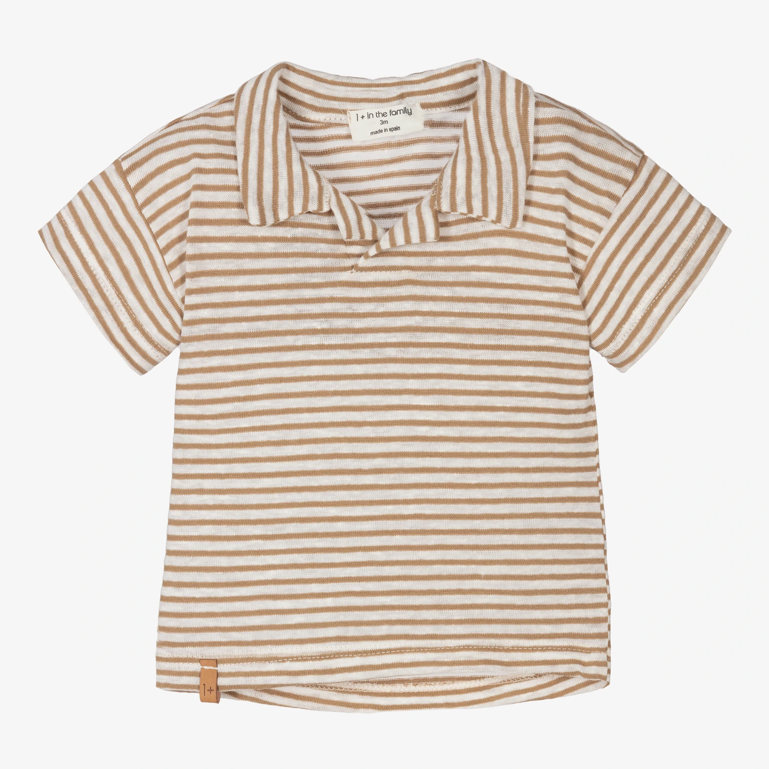 Classically stylish beige and ivory striped top for little boys and girls from 1 + in the family. Made in a linen and cotton blend it is lightweight and breathable. It has a sweet collar for a relaxed look.
