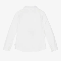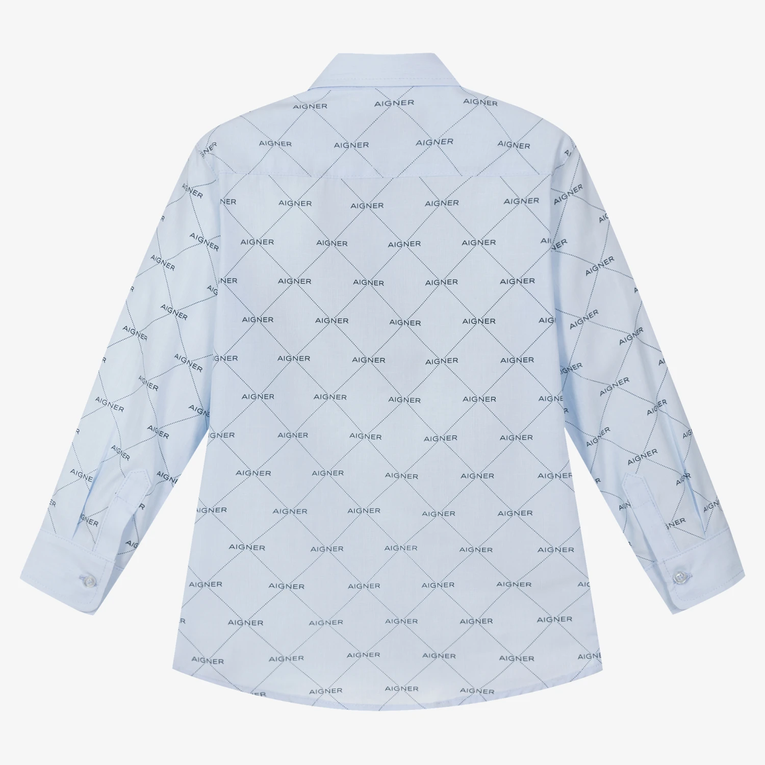 Pale blue shirt for boys by AIGNER, woven in lightweight cotton. It has a smart diamond-shaped logo pattern in navy blue, with the designer’s signature ‘A’ horseshoe embroidered on the chest pocket in matching blue. It fastens with branded buttons on the front and cuffs.