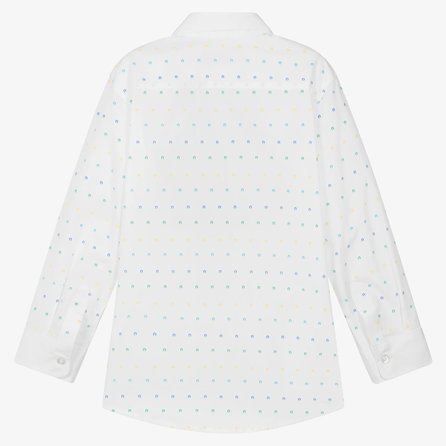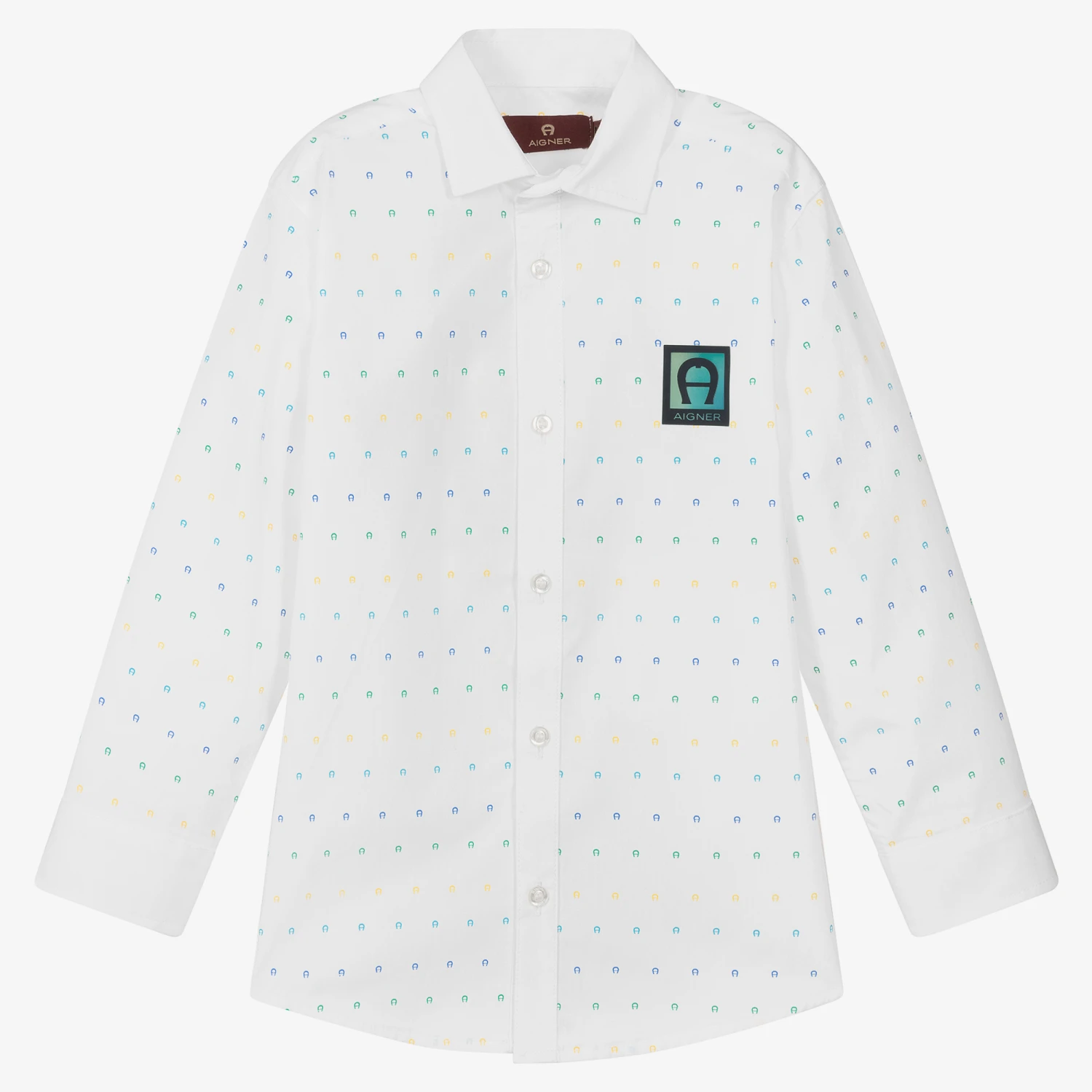 White shirt for boys by AIGNER, made in smooth cotton poplin. Patterned in small signature ‘A’ horseshoe logos in blue, yellow and green, it has a larger rubberised iridescent ‘A’ logo on the chest. It fastens with branded buttons on the front and cuffs.
