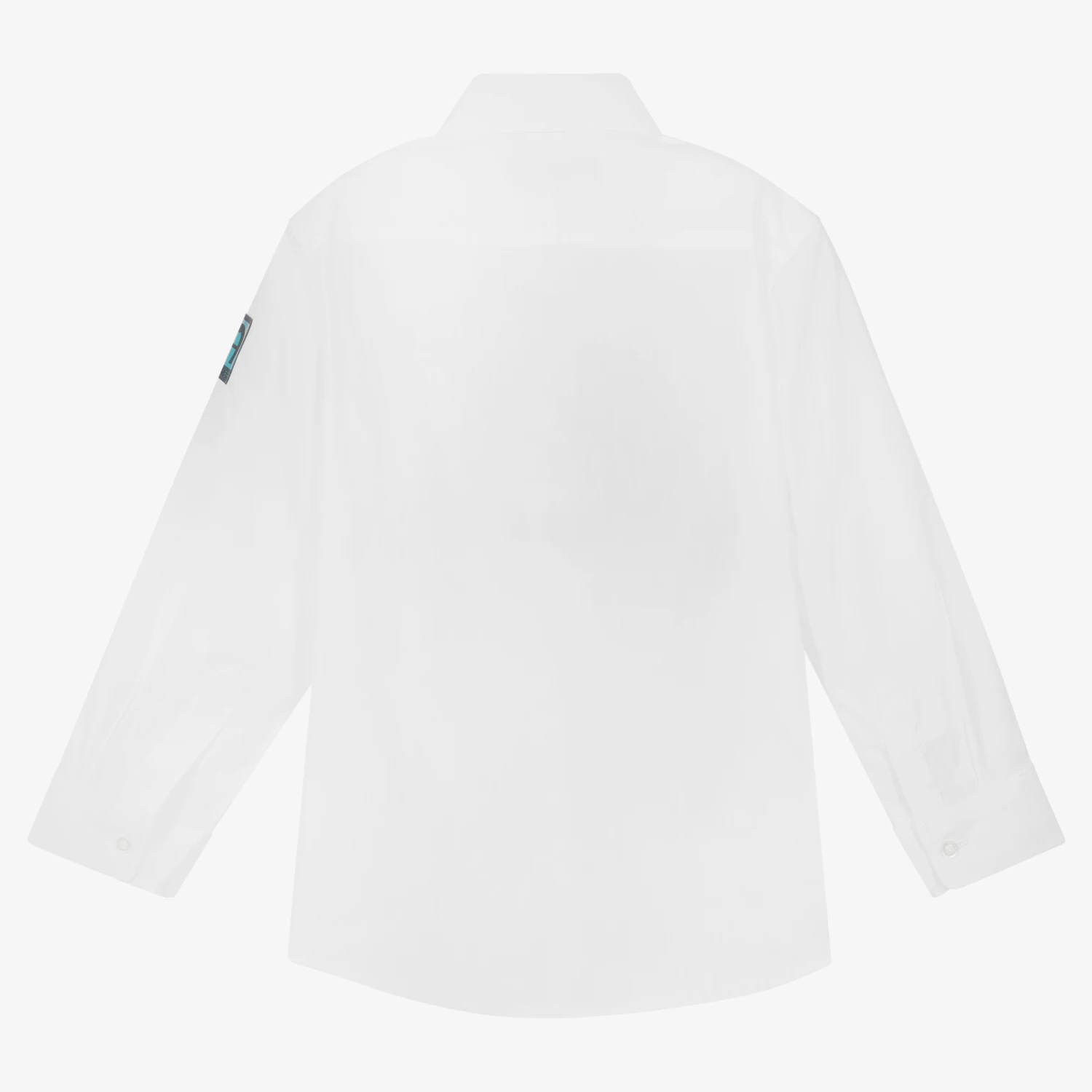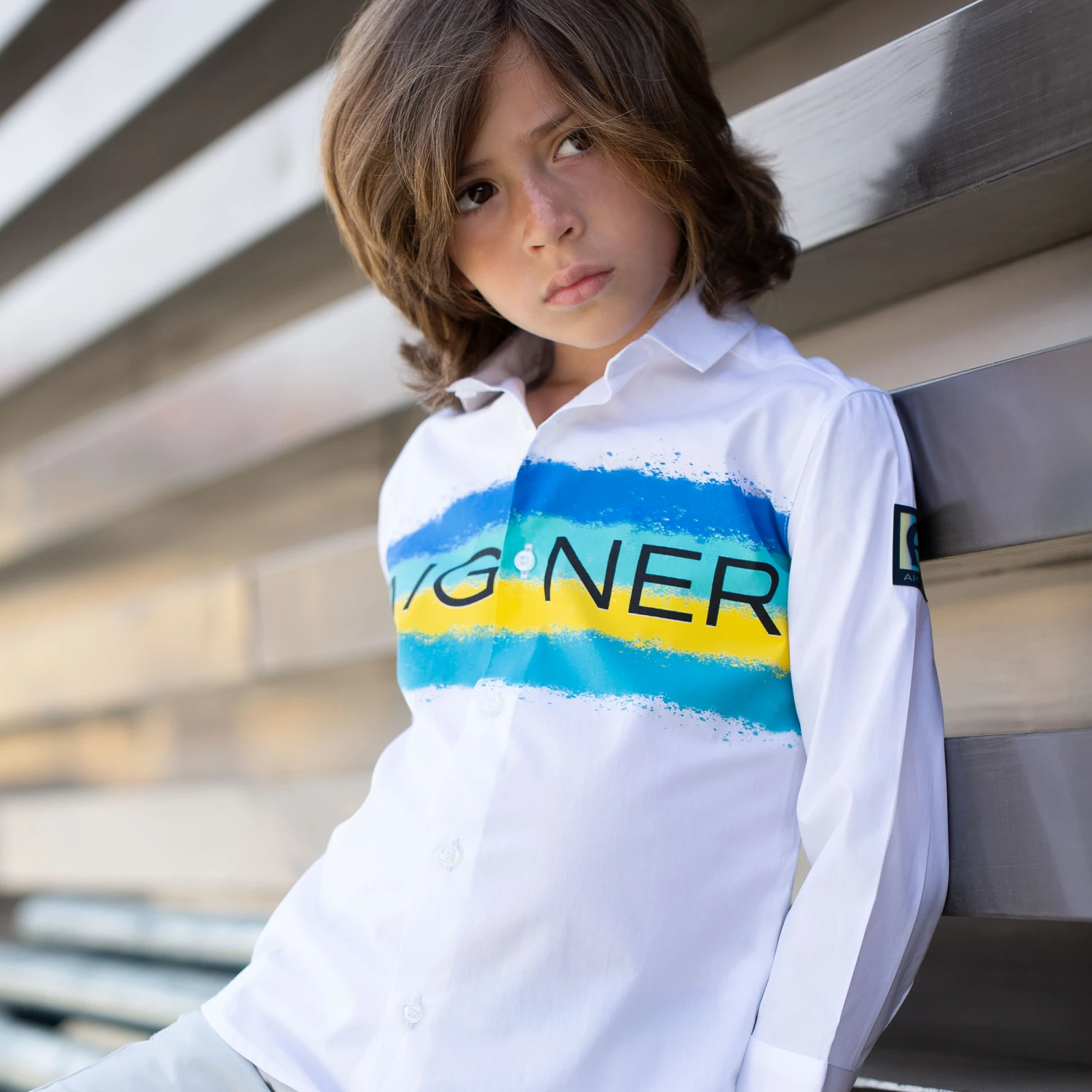 White shirt for boys by AIGNER, made in smooth cotton poplin. The front has spray paint stripes in blue, green and yellow, with the designer’s name in bold black letters. The signature ‘A’ horseshoe logo is on one sleeve, in a rubberised iridescent print. It fastens with branded buttons on the front and cuffs.