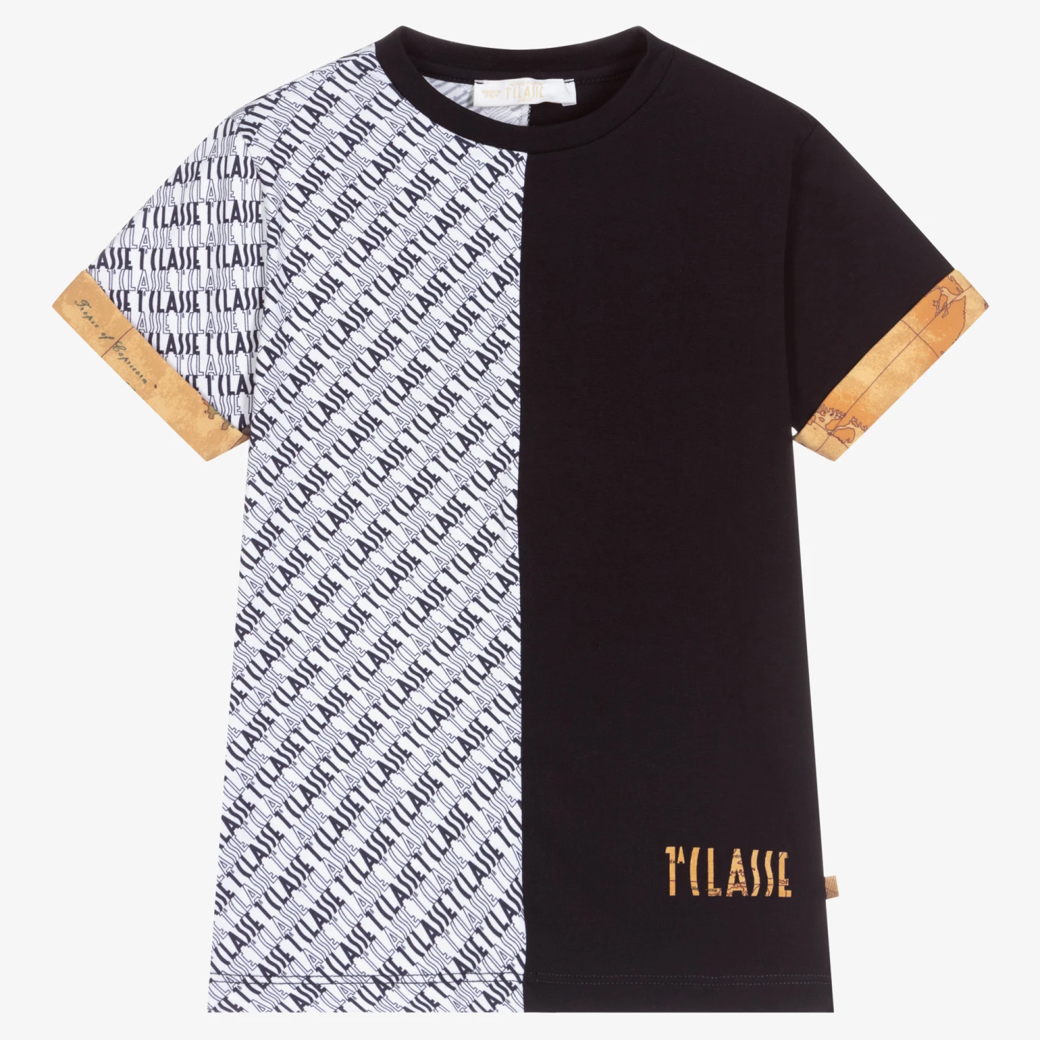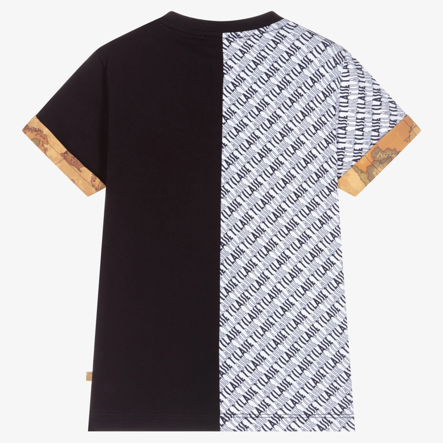 Smart-casual T-shirt for boys by luxury Italian brand Alviero Martini, made in soft cotton jersey. One side of the top is navy blue, whilst the other side is white and patterned in a navy blue 1a Classe logo print. The turn-up cuffs are in a dark beige Geo map print, with a matching 1a classe logo on the front.