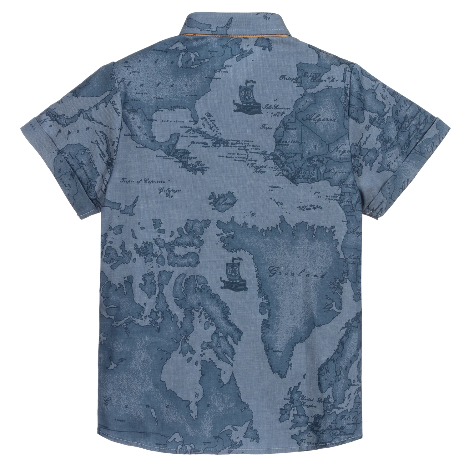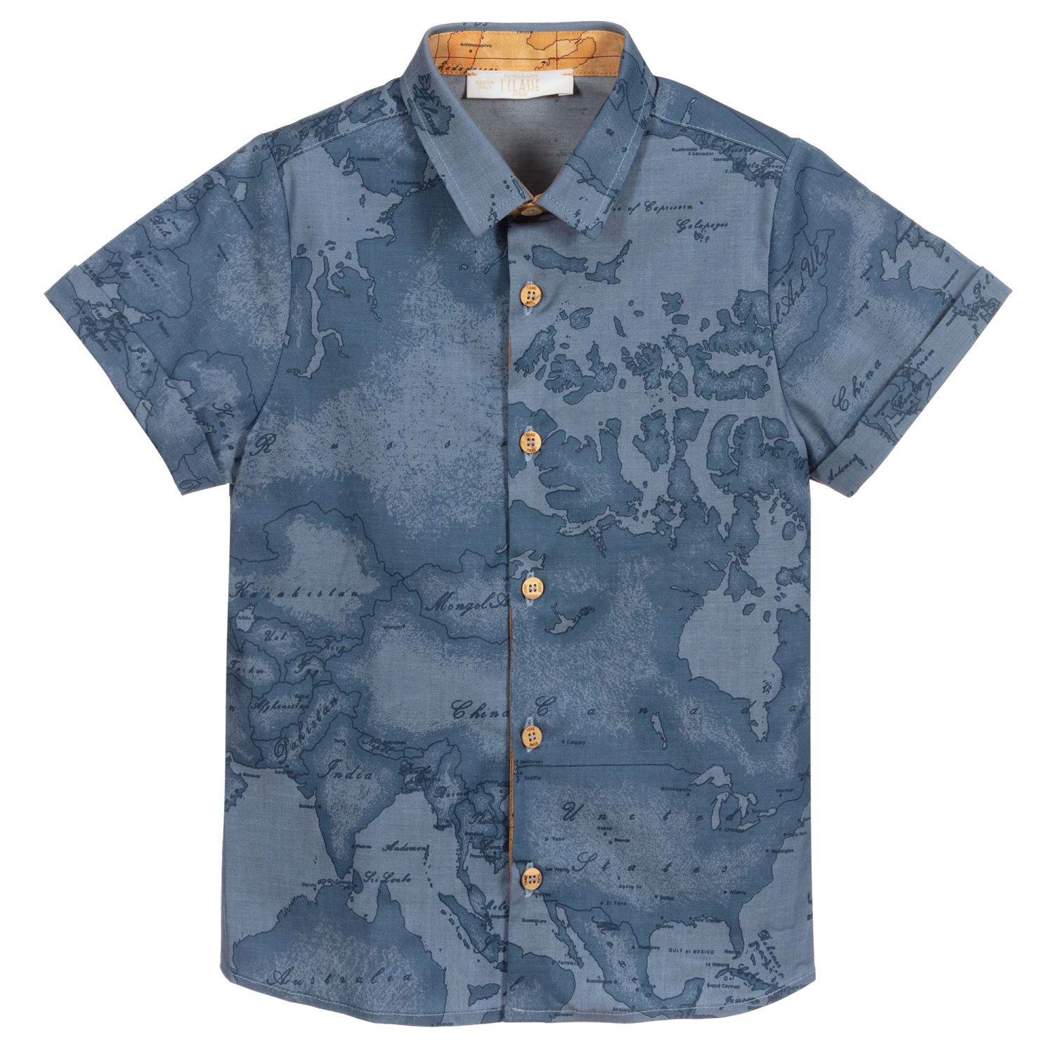 Blue Geo Map shirt for boys by Alviero Martini made in soft and lightweight cotton. It has contrasting dark beige details inside the collar and placket, and it comes with a detachable bow tie