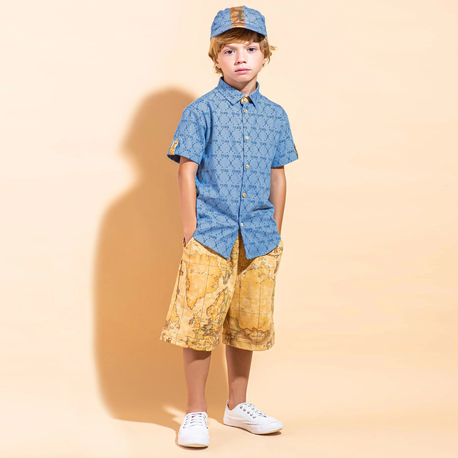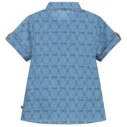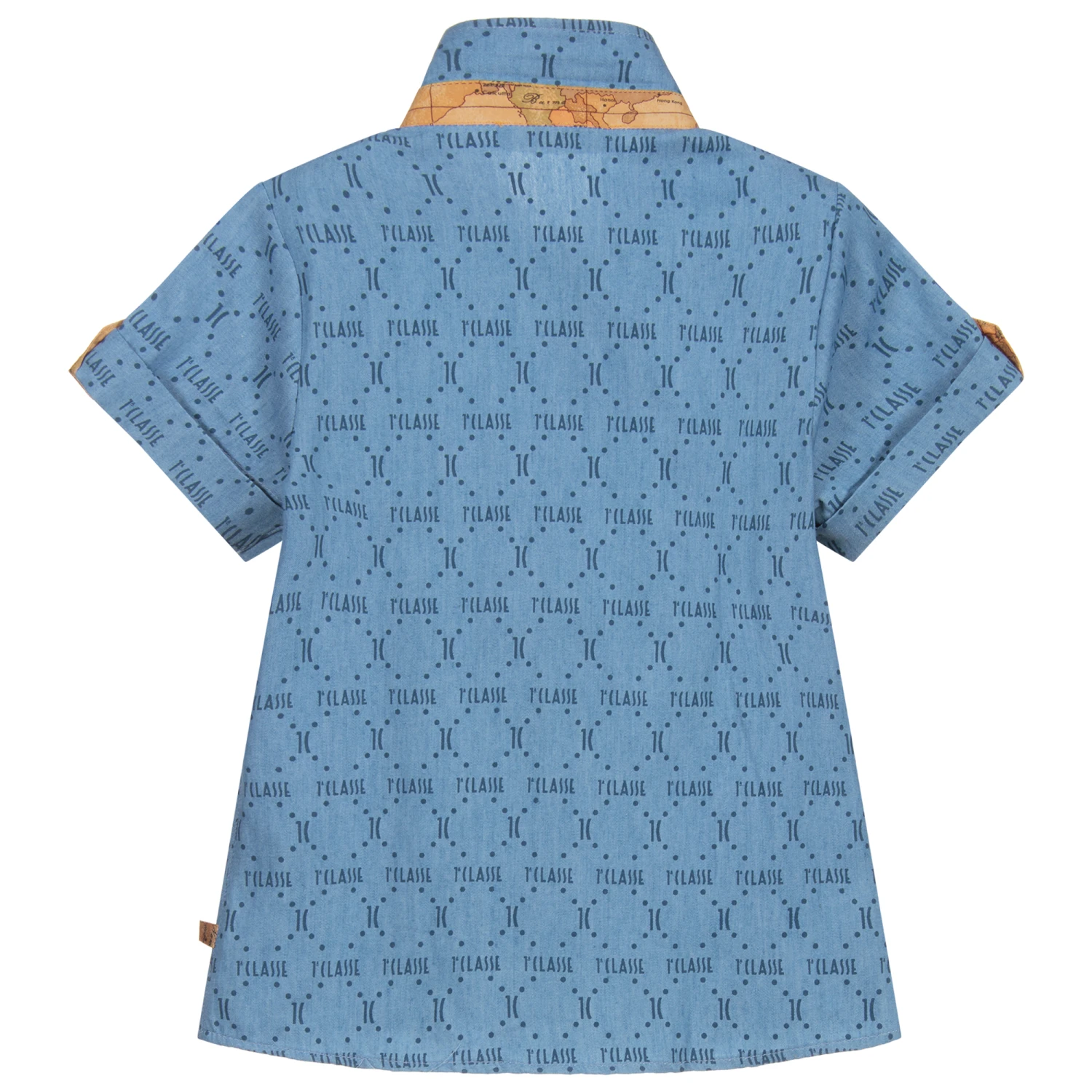 Blue chambray shirt for boys by Alviero Martini, with the brand’s 1a Class logo pattern in dark blue. Made in soft cotton, it has dark beige Geo map trim on the sleeve tabs and collar, and branded wooden buttons.