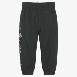 Black joggers for boys by American brand Calvin Klein Jeans, with a bold white logo and monogram logo printed on one leg. They are made in sweatshirt cotton jersey with concealed side pockets and one back pocket. They have a useful drawstring waistband and ribbed trims.