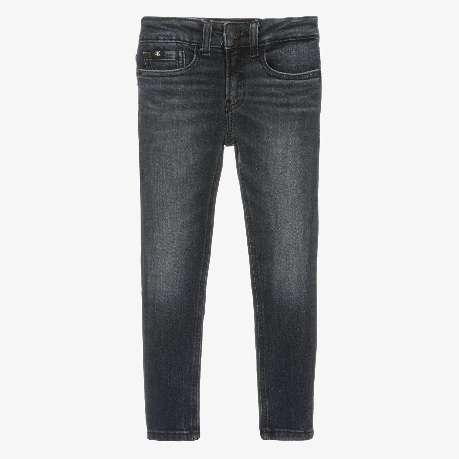 Faded blue-black skinny jeans for boys by American brand Calvin Klein Jeans. There are logo details on the button fastenings, coin pocket, and back waistline. This classic five-pocket style fastens with a zip and popper and has a useful adjustable waist. They are slim through the hip and thigh, with a skinny leg.