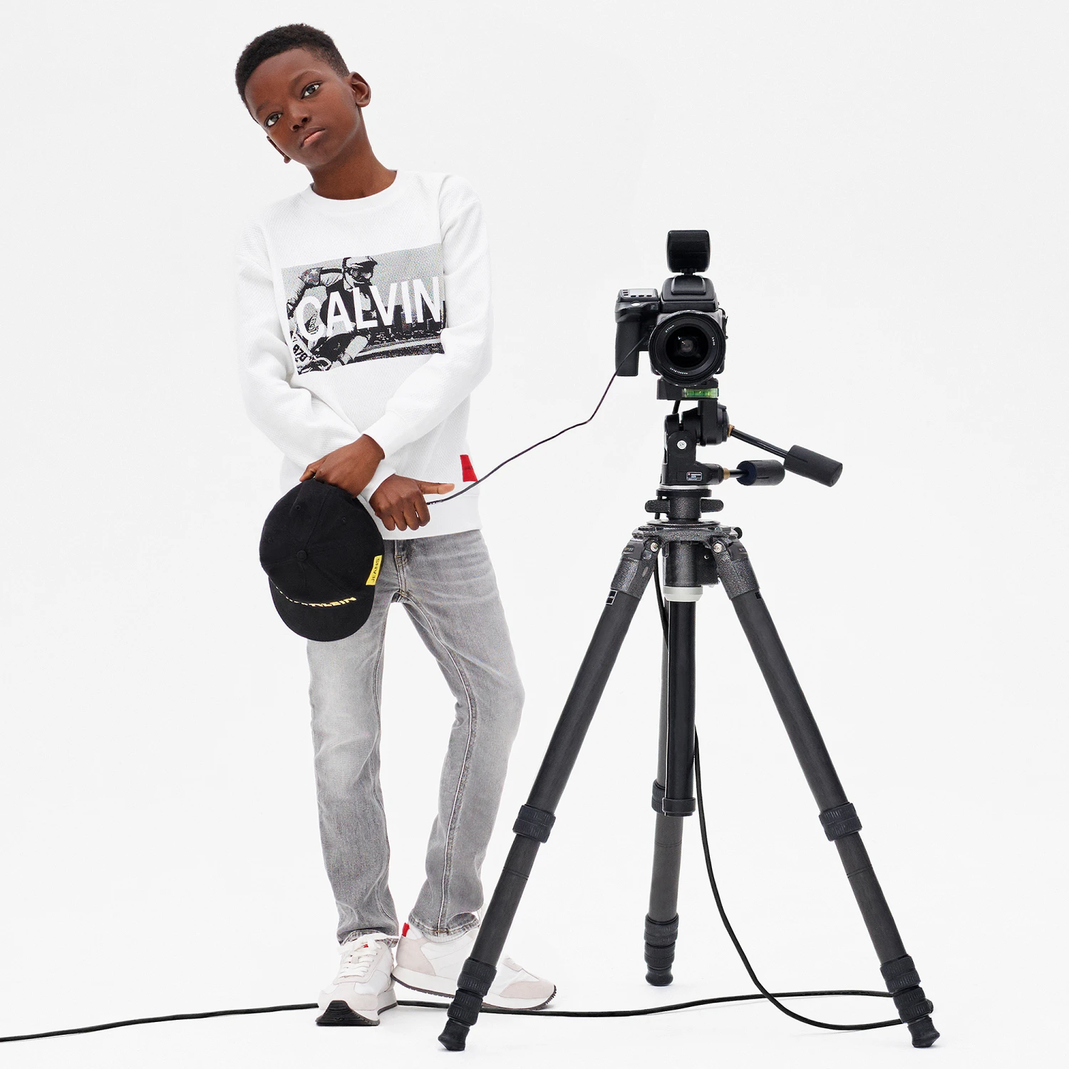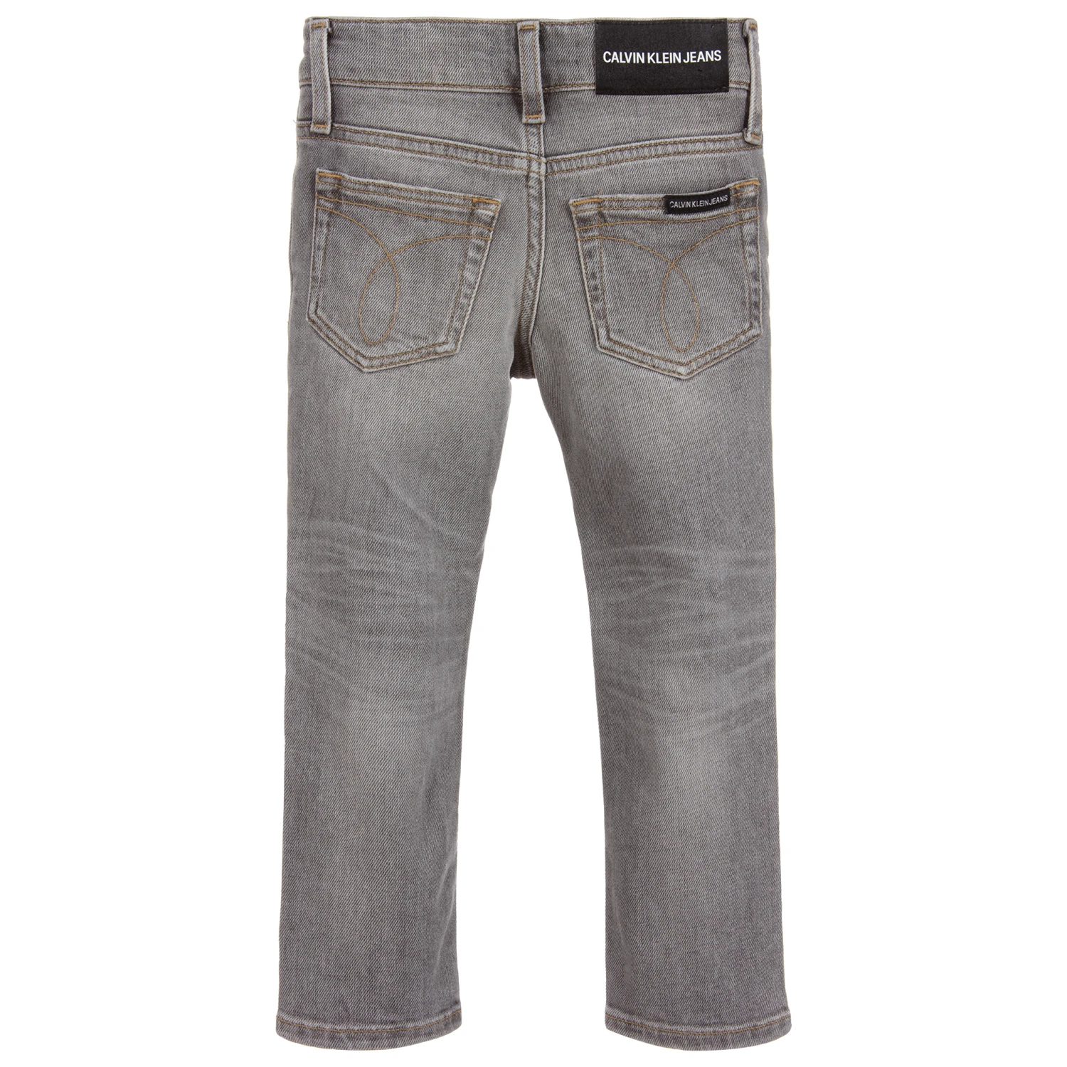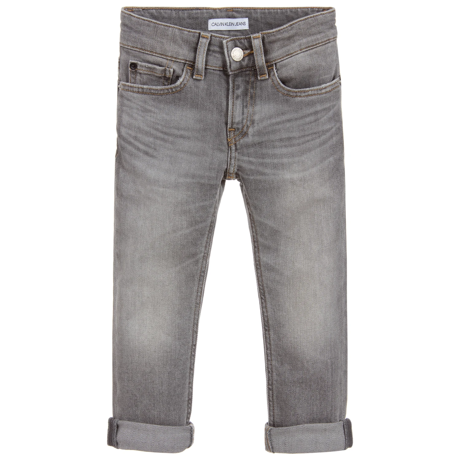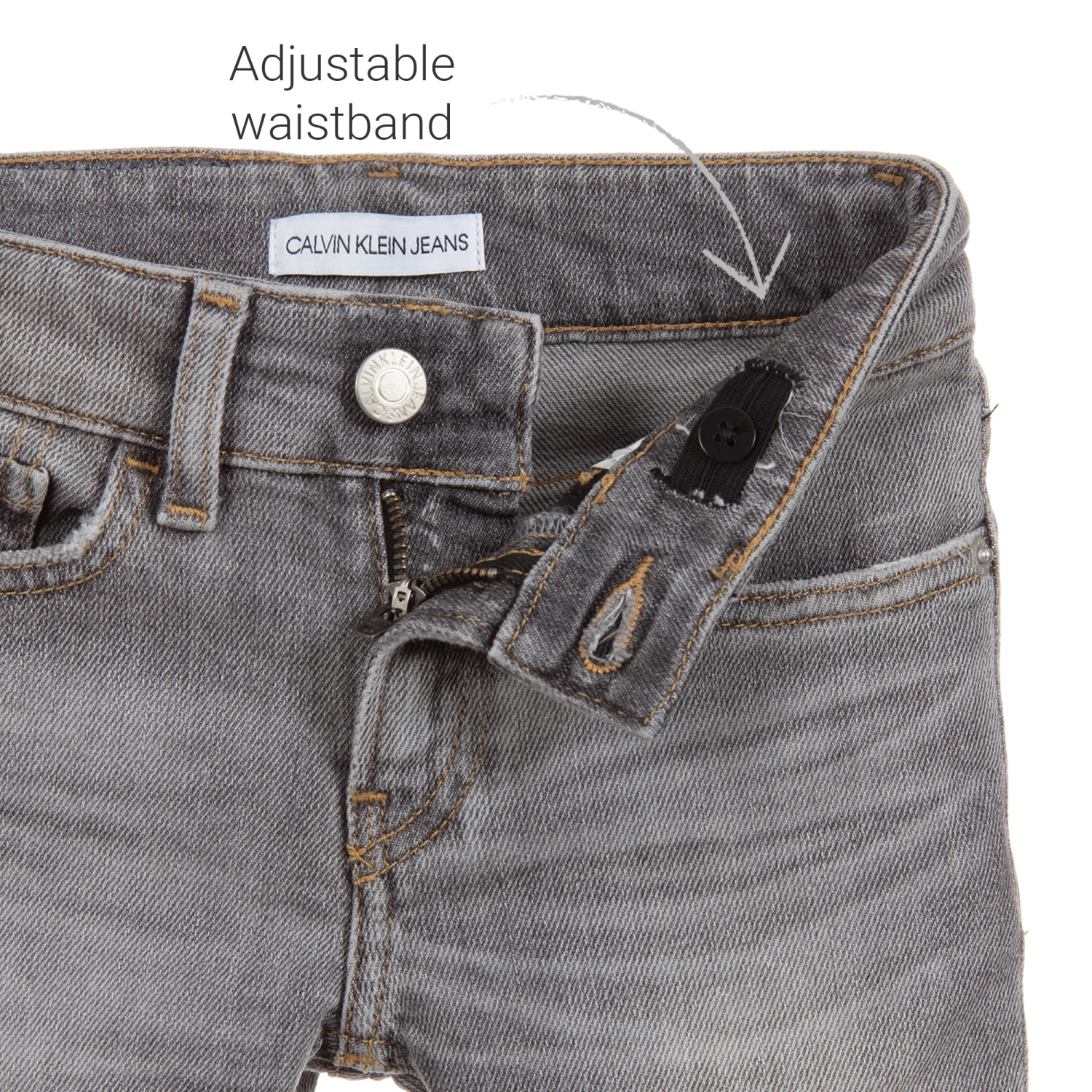 Made in slightly stretchy, grey cotton denim, these jeans by Calvin Klein Jeans have a washed and worn look. They are slim-fitting and have a useful, adjustable waistband, with logo branding on the button, rivets, waistband and back pocket.