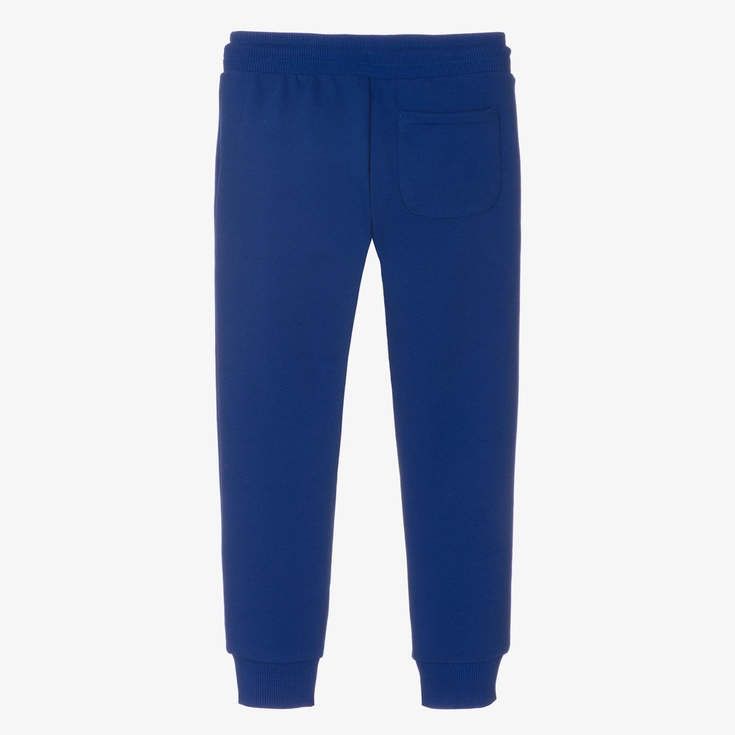 Boys royal blue cotton joggers from American brand Calvin Klein Jeans. Ideal for lounging, these comfortable mid-weight jersey bottoms have an elasticated drawstring waist and three handy pockets. There is a raised white logo print on one leg, with a small white CK monogram print below the waist. They are made with at least 40% organic cotton and 10% recycled polyester.