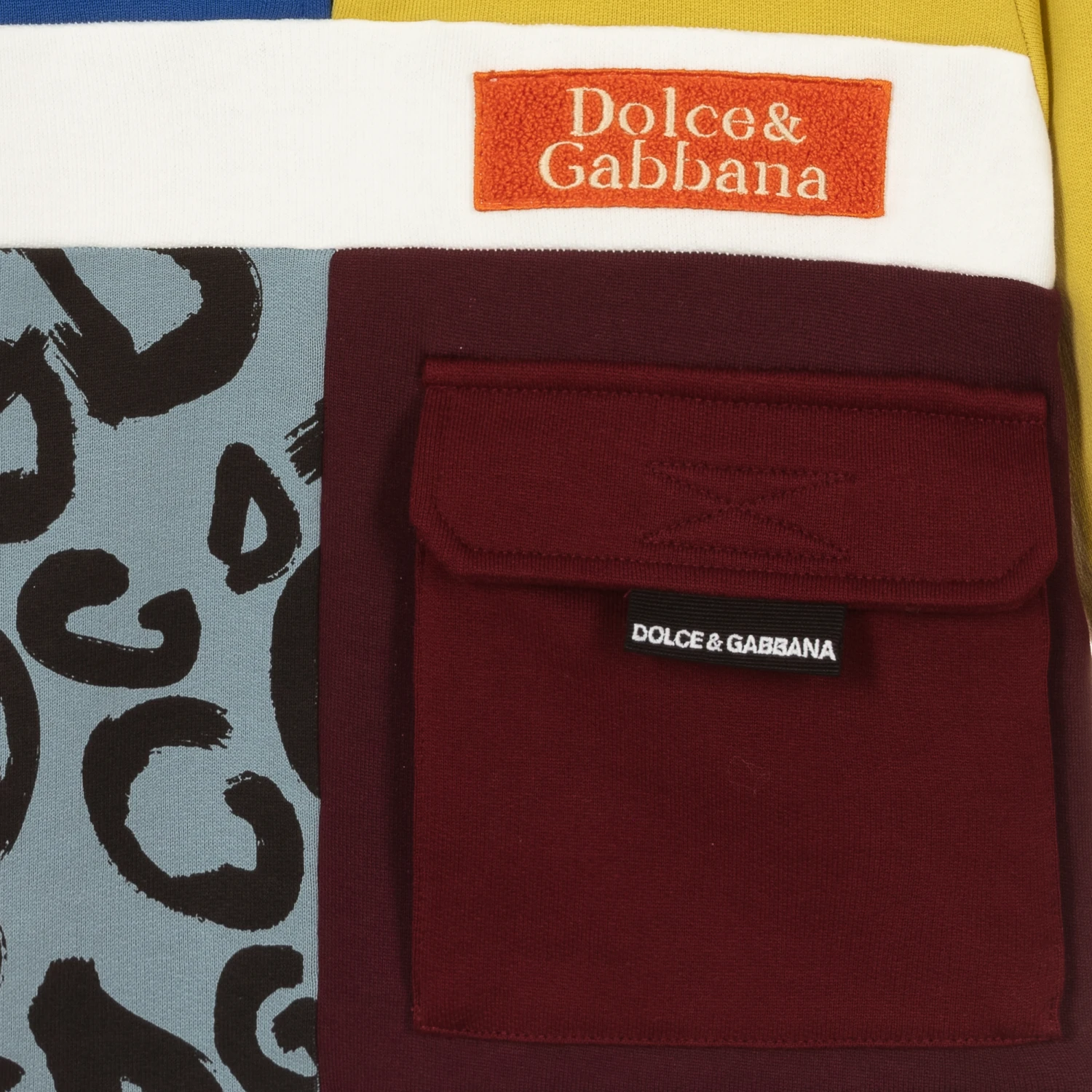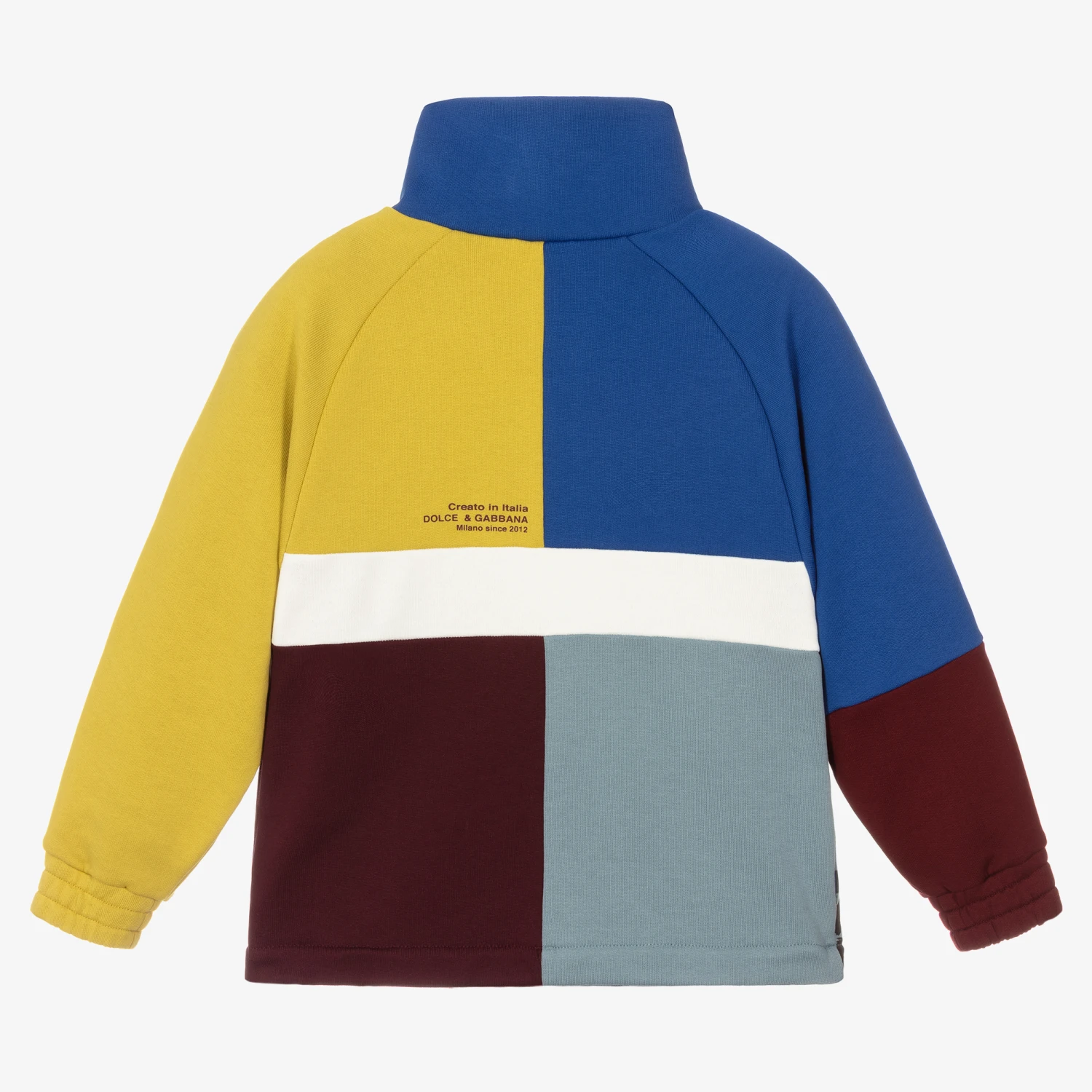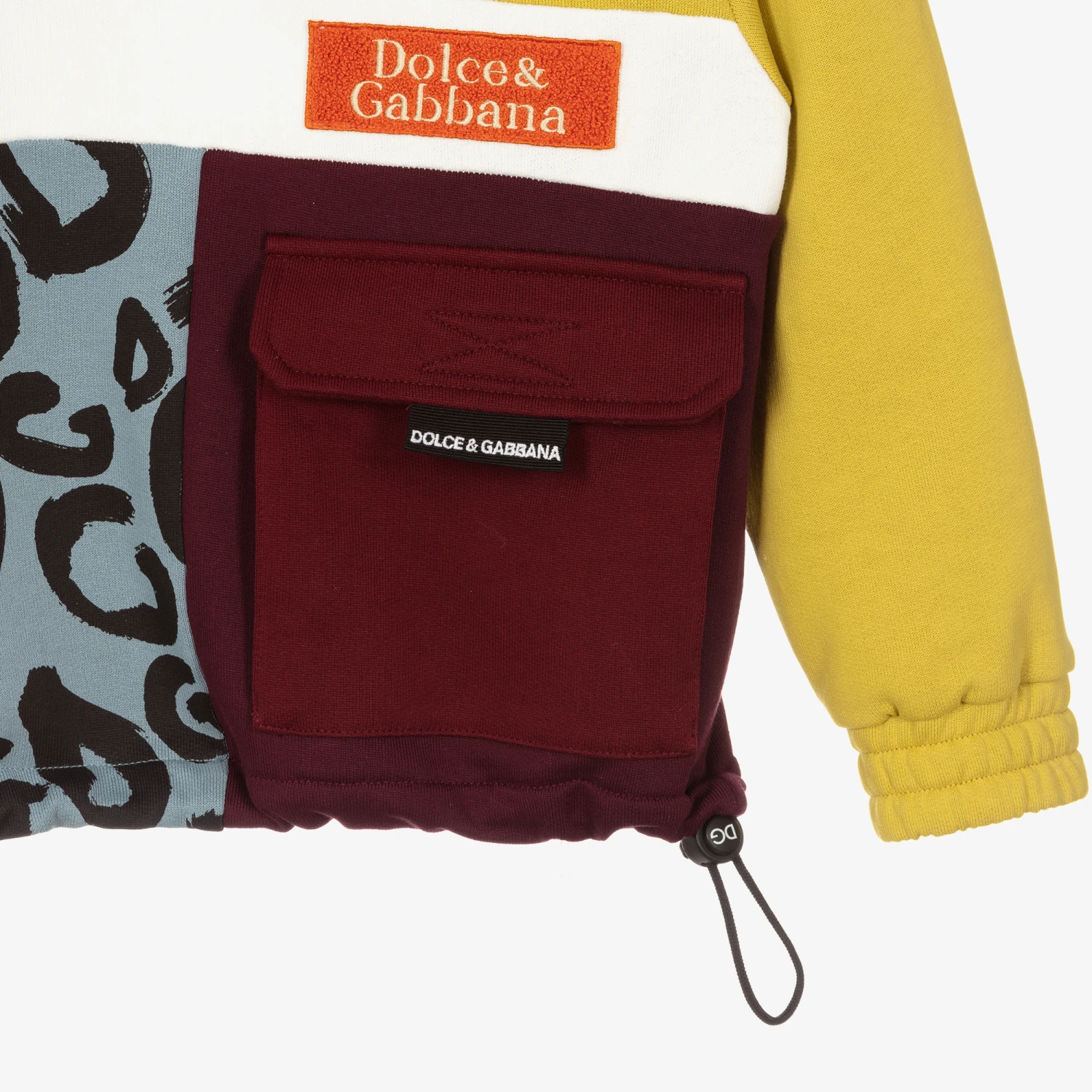 Boys Mini-me patchwork sweatshirt with half zip by luxury designer Dolce & Gabbana, made with soft cotton loopback sweatshirt jersey. There are panels of blue, dark red, white and lime green, with logo prints on the front and back. Oversized in fit, there is a patch pocket with velcro-fastening flap and an orange towelling logo patch. The drawstring hem has toggle fastenings.