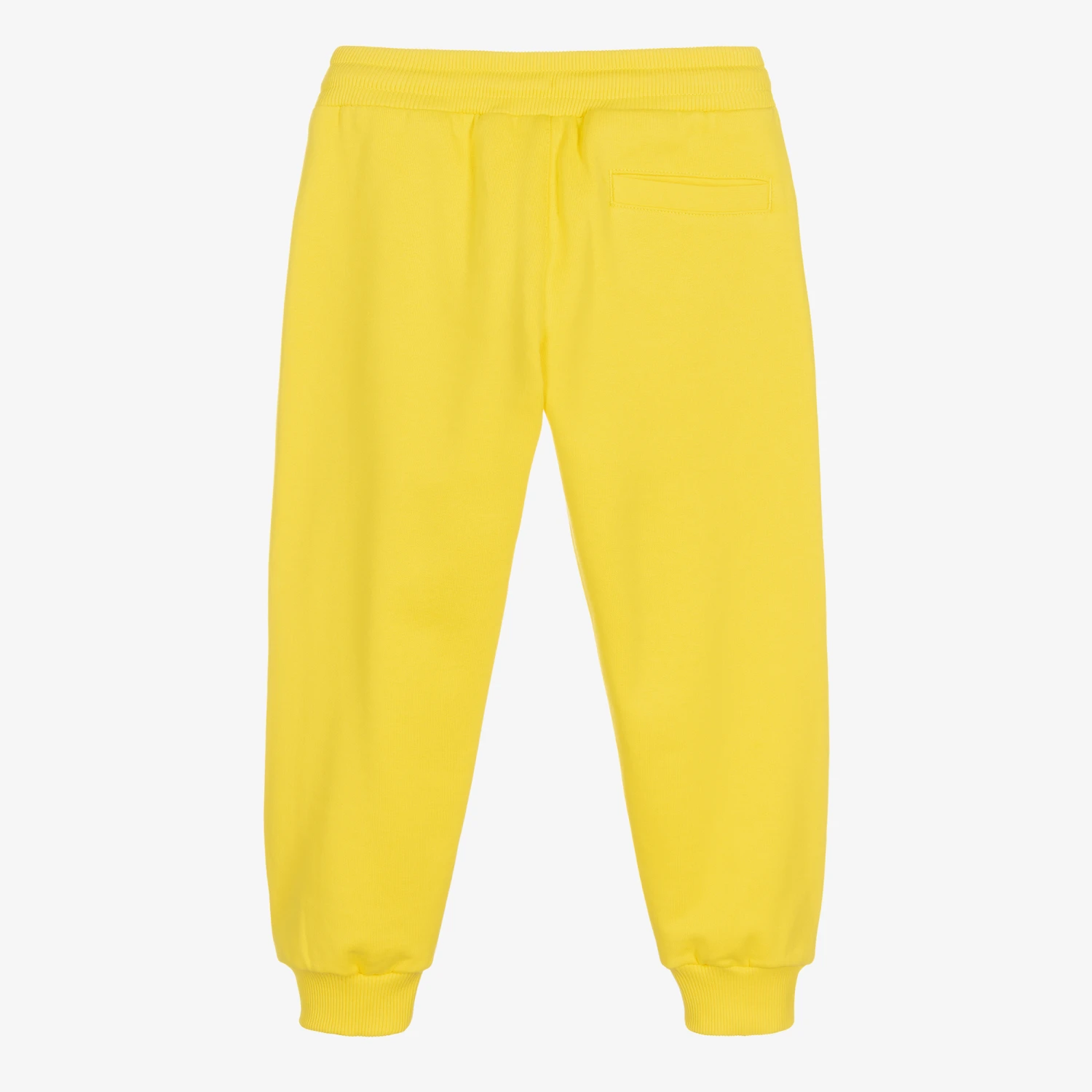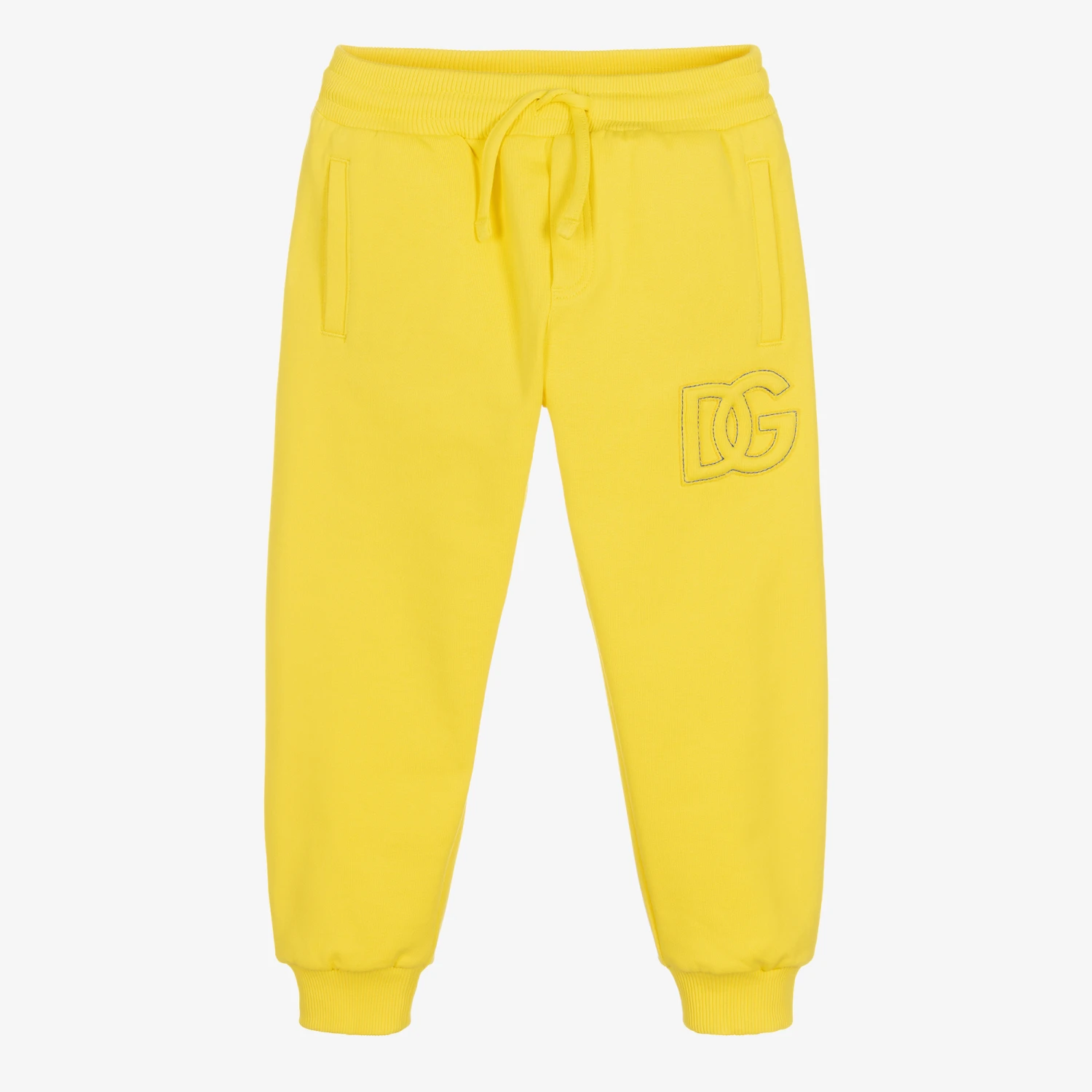 This pair of bright yellow joggers for boys from Dolce & Gabbana exemplify comfort-meets-contemporary style. The cotton sweatshirt jersey fabric is enhanced by an embossed Crossover DG appliqué with contrast blue stitching, adding an interesting tactile element to these vibrant trousers. The elasticated waist is adjustable with a drawstring ensuring the best fit.