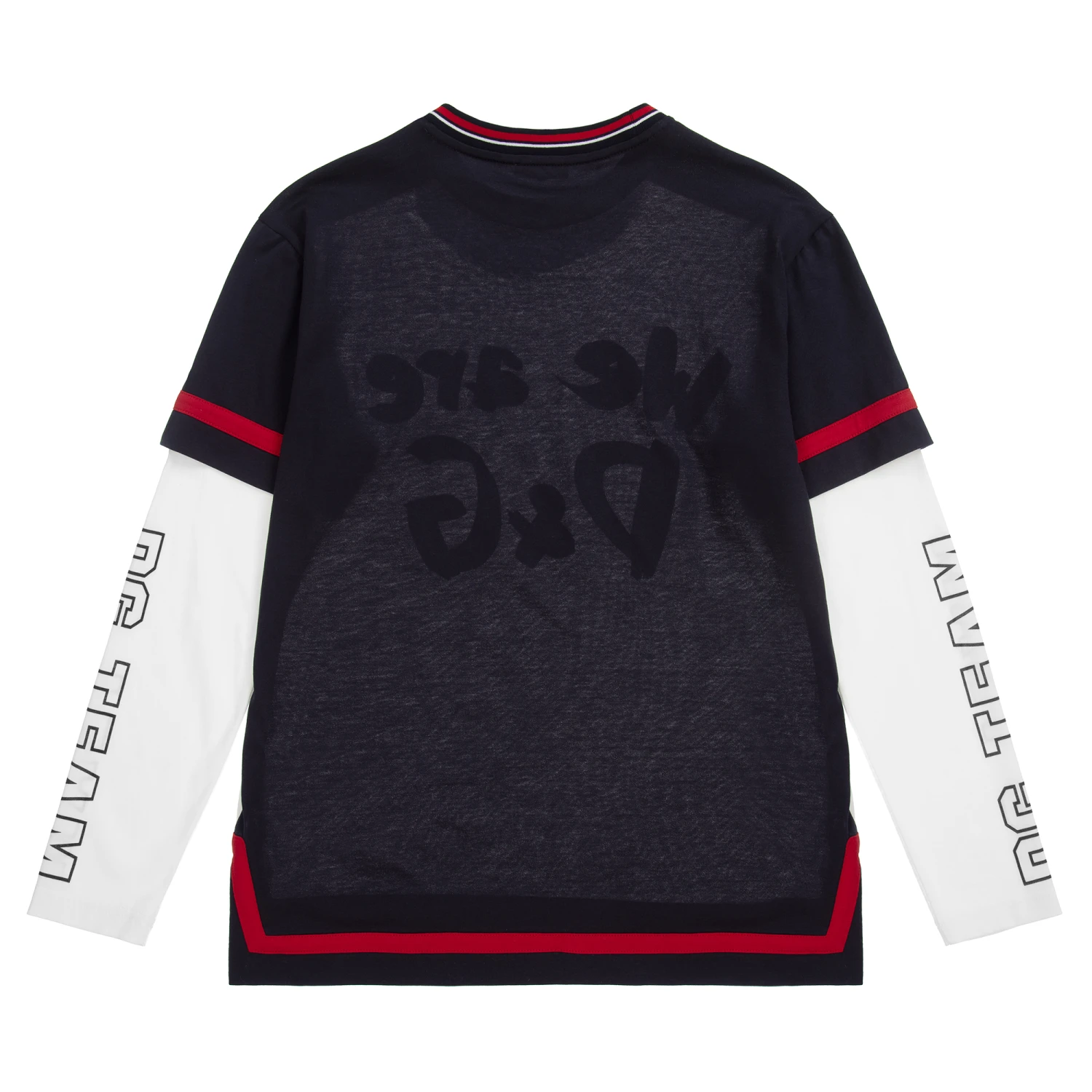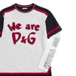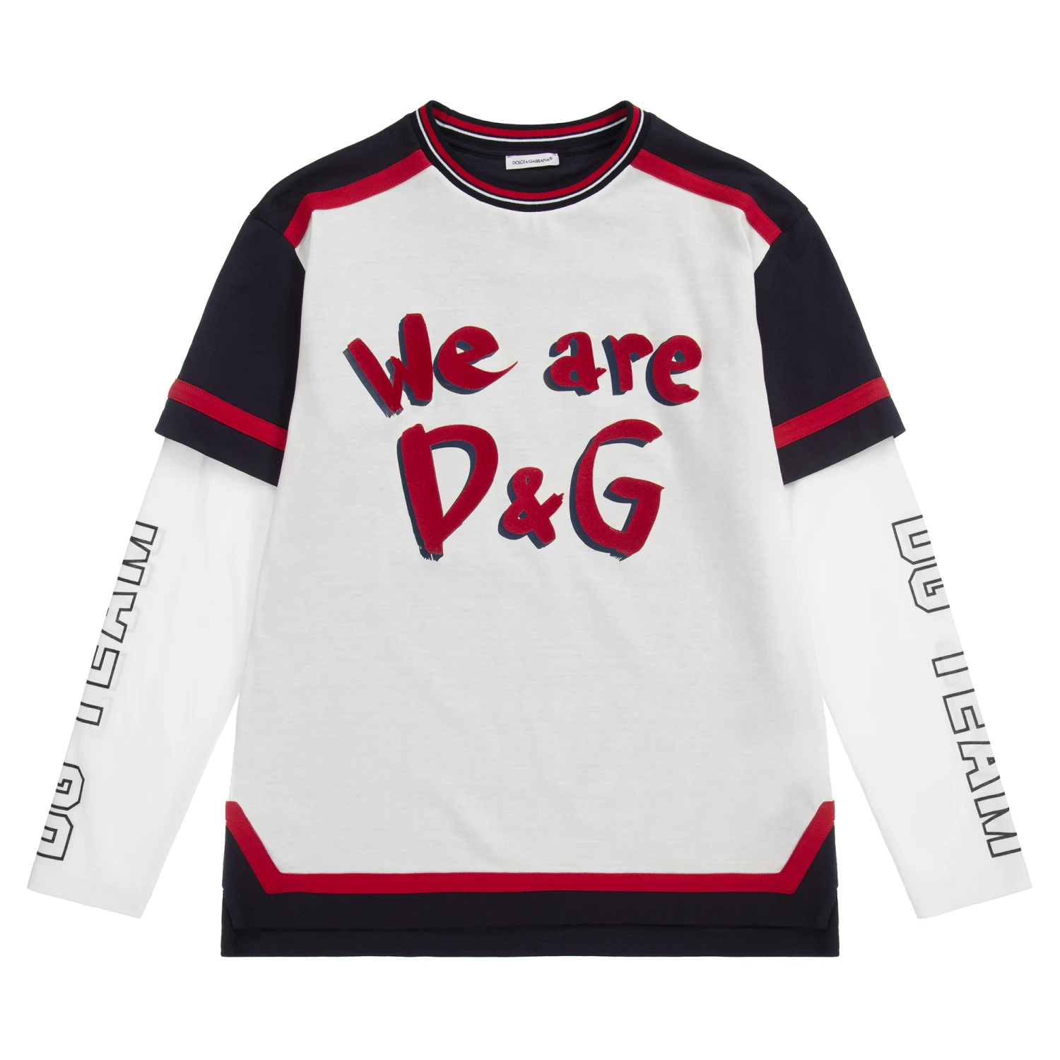 White and navy blue top for teen boys by luxury Italian brand Dolce & Gabbana, made in soft cotton jersey. It has red trims and a red and grey flocked logo on the front. The long sleeves have a navy blue ‘DG TEAM’ print.