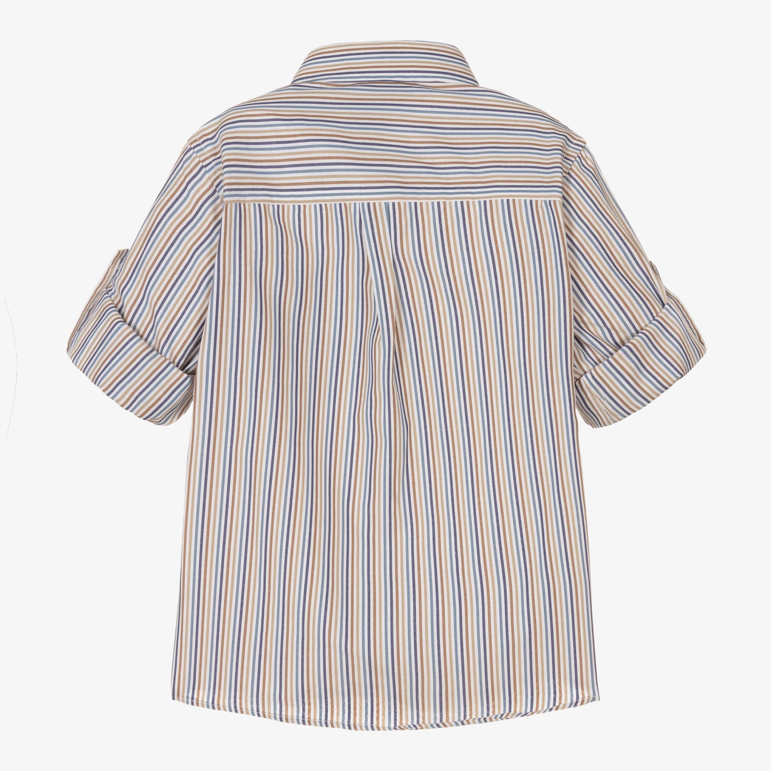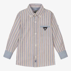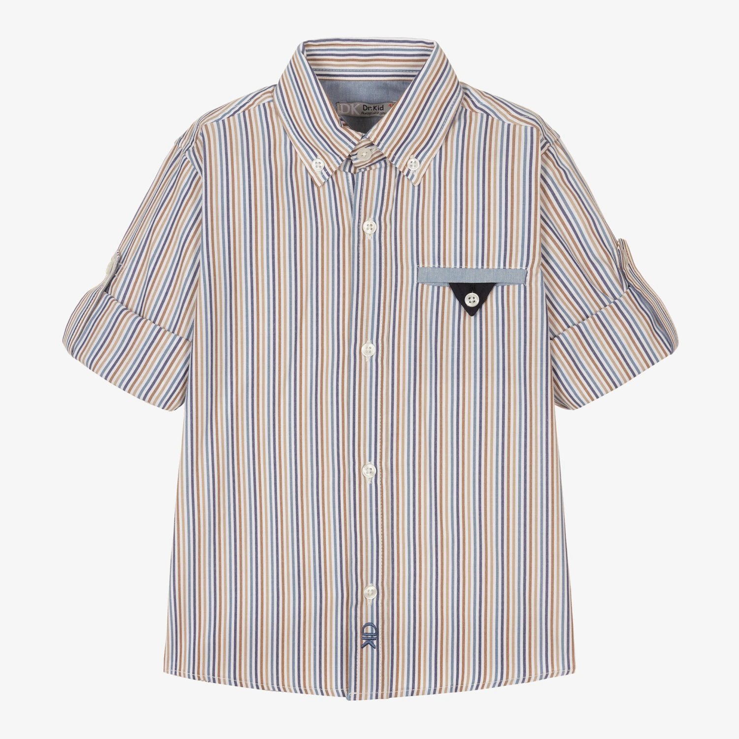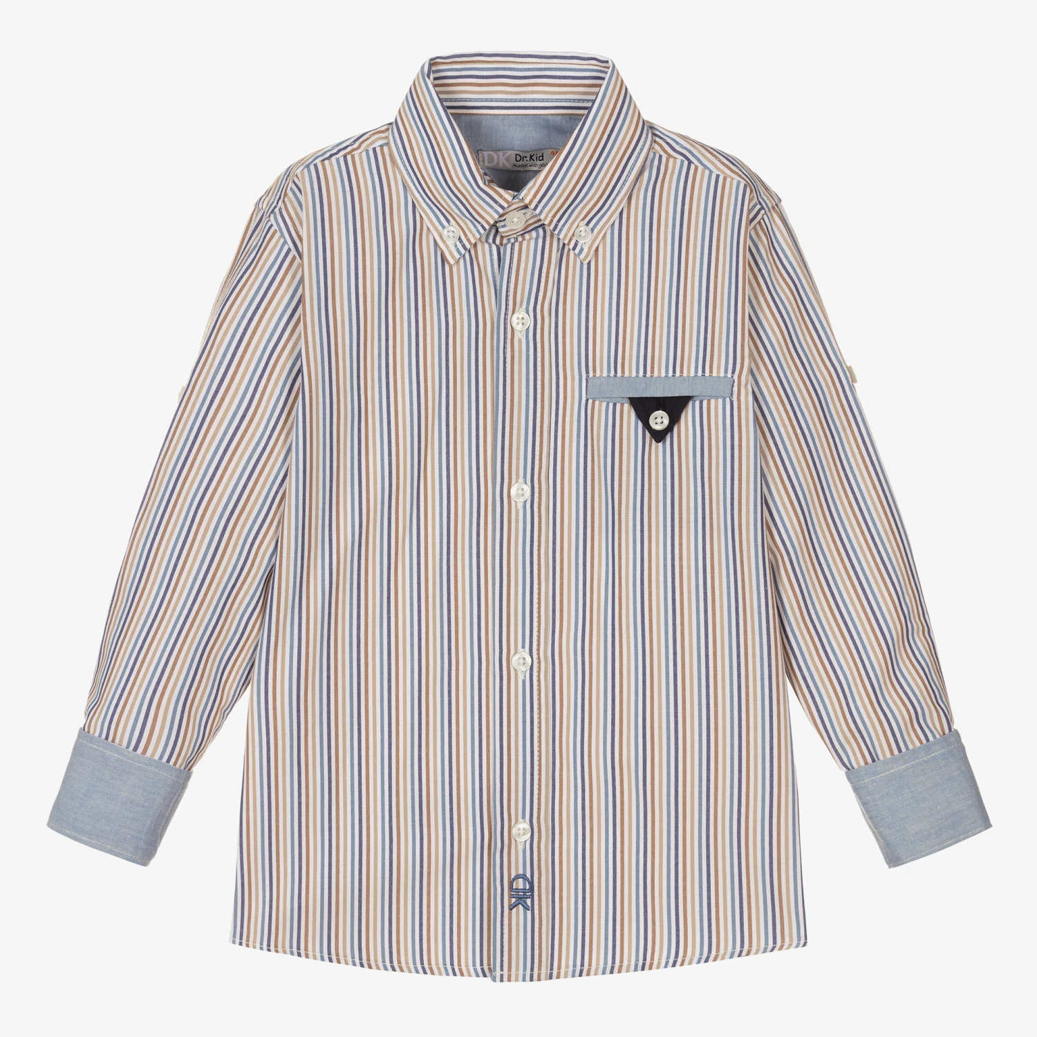 Stripe shirt for boys by Dr. Kid, in hues of beige and blue. Made in comfortable lightweight cotton, this classic-style shirt has a pointed collar, front button fastenings and barrel cuffs. It has a button-fastening chest pocket, and for a laid-back, casual look, the sleeves can be rolled up and secured with a button. The brand’s monogram is embroidered on the placket for a subtle designer touch.