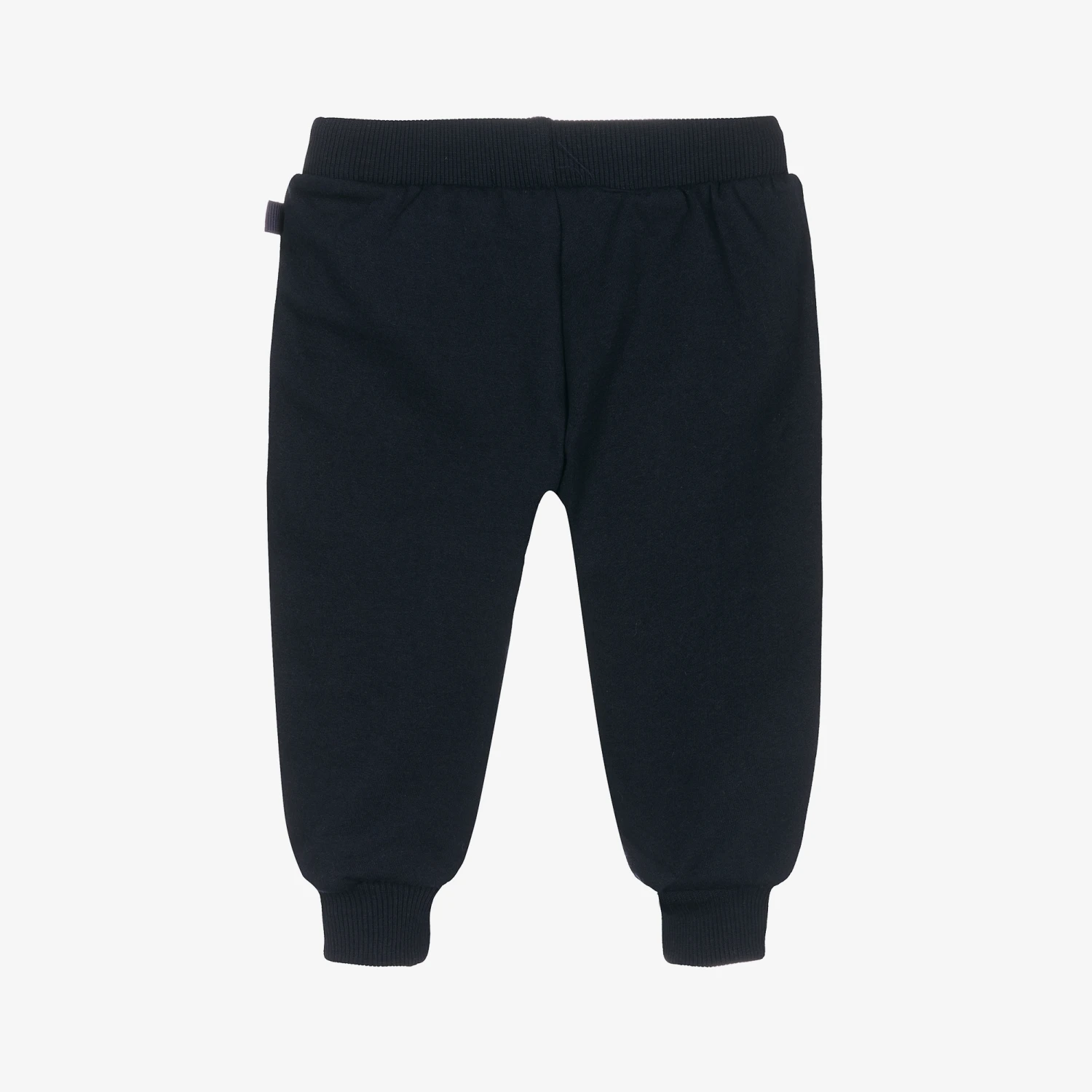 Navy blue joggers for little boys by Portuguese brand Dr. Kid. Made in stretchy cotton jersey, they have side pockets, patches on the knees for durability and a useful drawstring waistband.