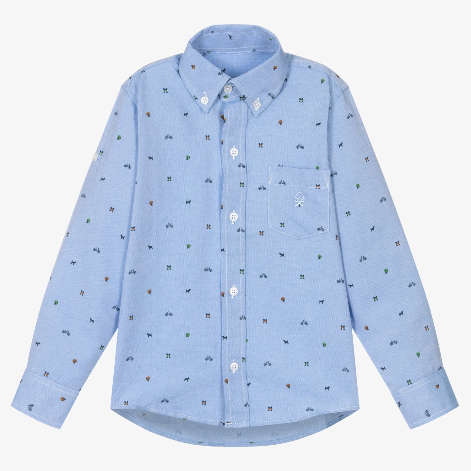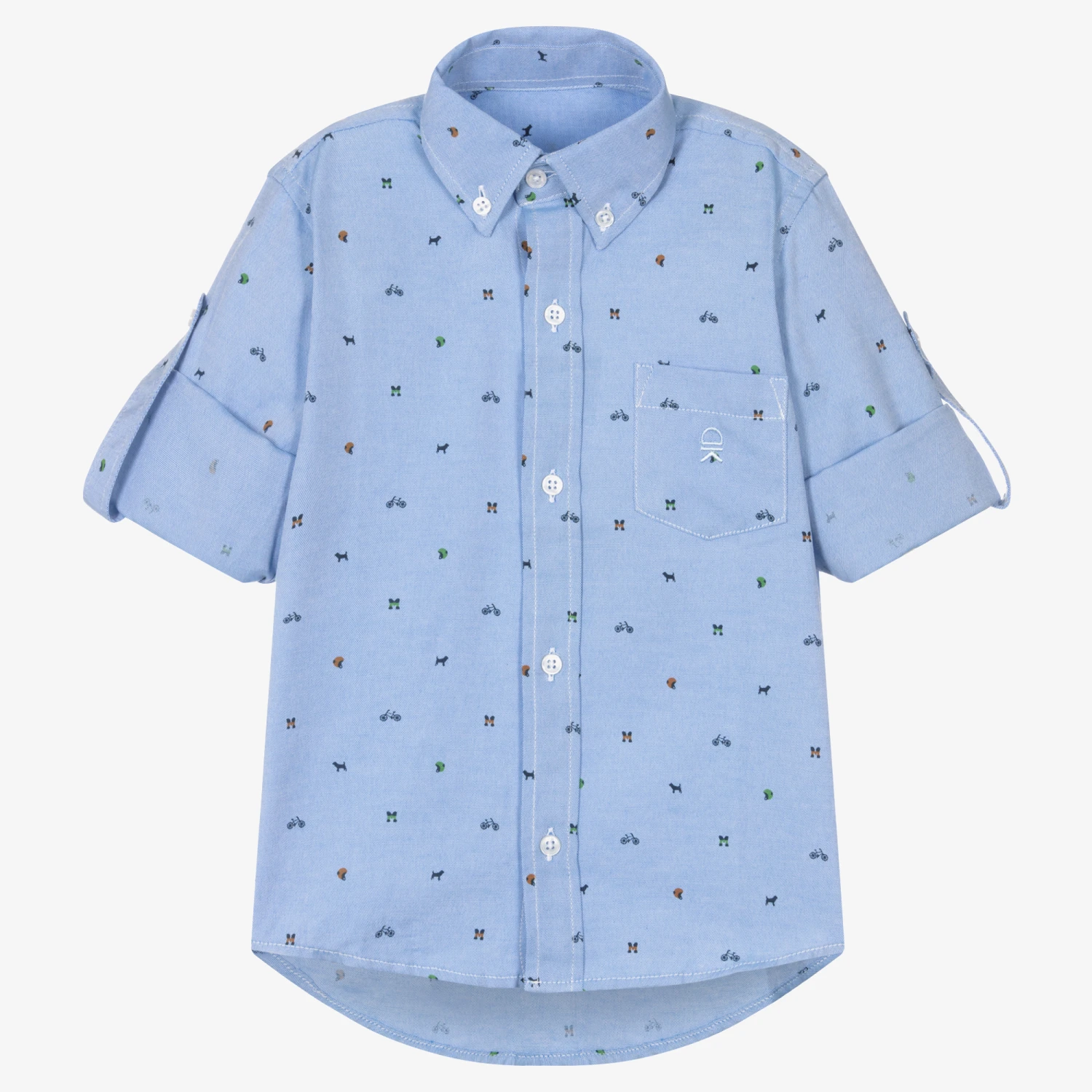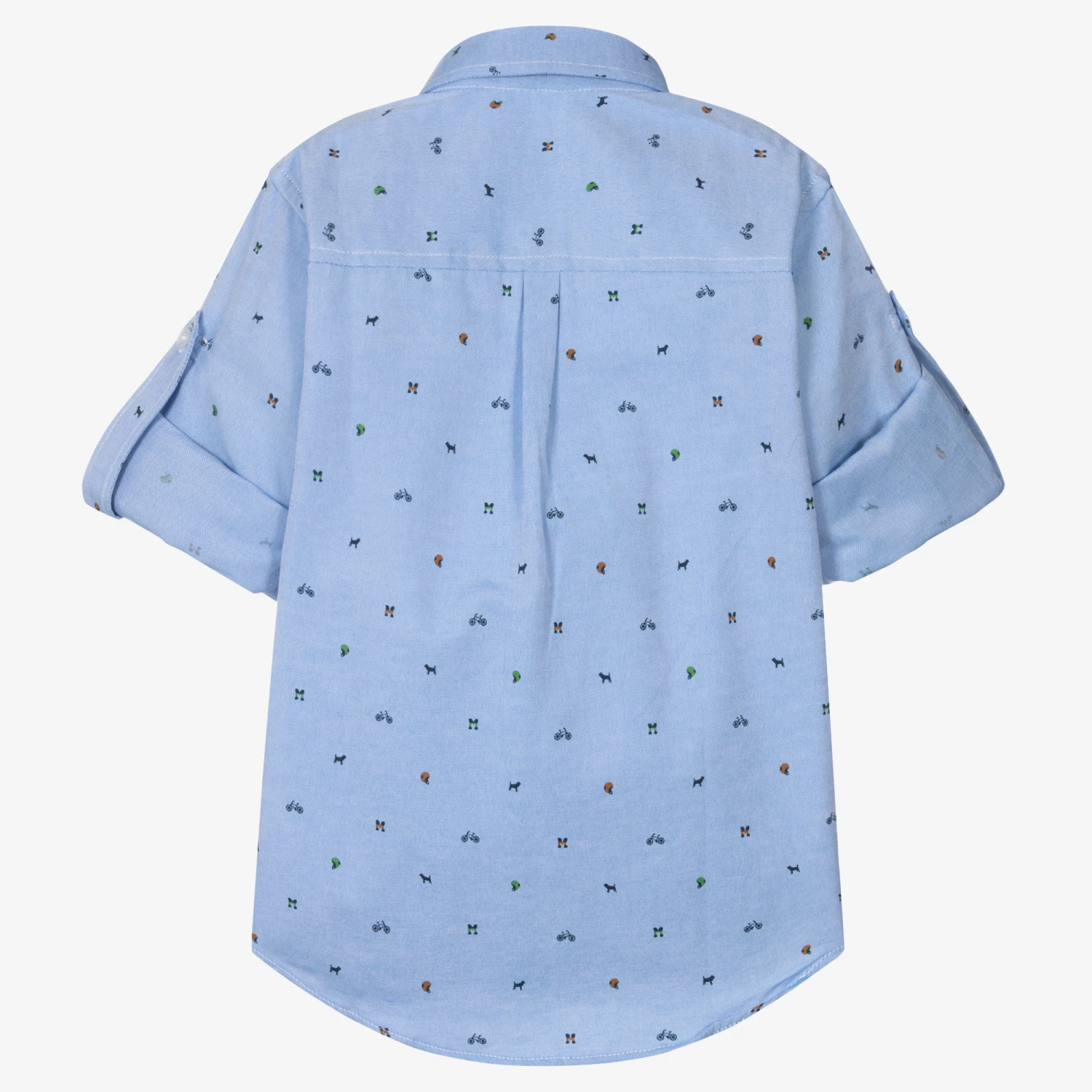 Blue shirt for boys by Dr. Kid, made in soft and lightweight cotton. This smart, casual shirt is patterned in a sports theme print. It has a smart button-down collar and fastens with buttons down the front and on the cuffs. For a more casual look, the sleeves can be rolled up and secured with a button. A blue tonal embroidered logo on the chest pocket gives it a subtle designer finish.