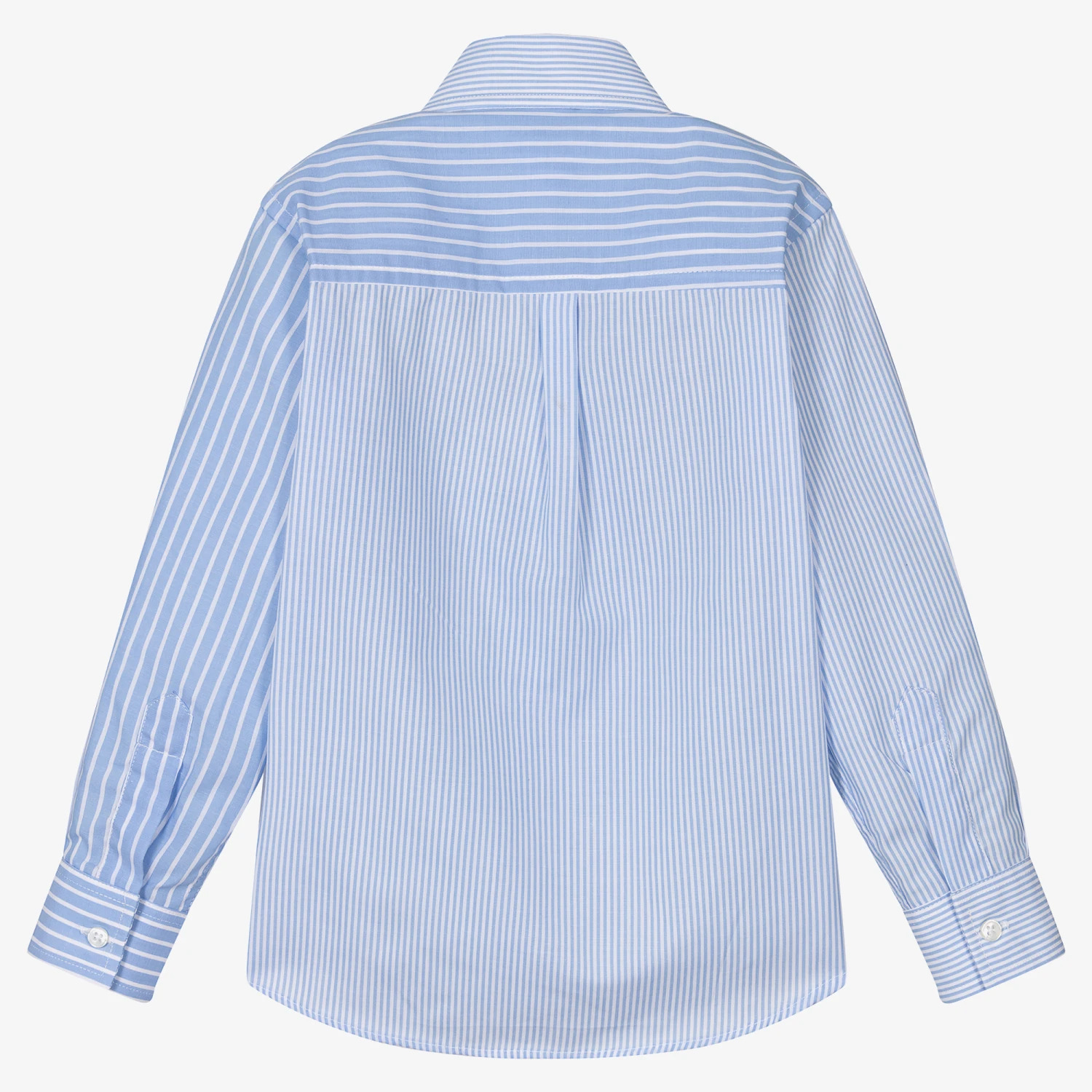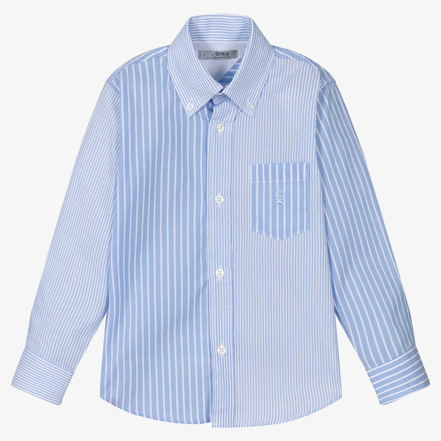 Blue and white stripe shirt for boys by Dr. Kid, made in a soft and lightweight cotton poplin. Comfortable to wear, it has blocks of different sized stripes, with button fasteners down the front and on the cuffs. For a subtle designer touch, there is a tonal blue embroidered logo on the chest pocket
