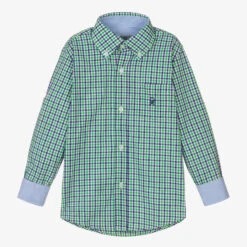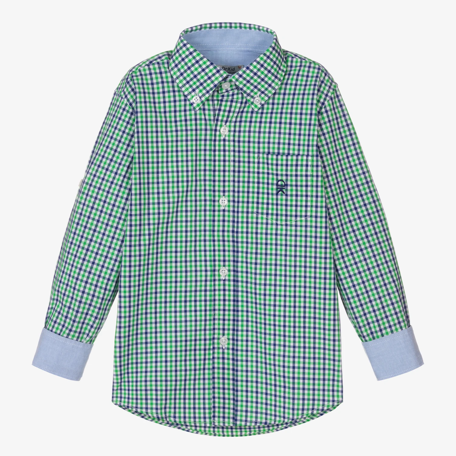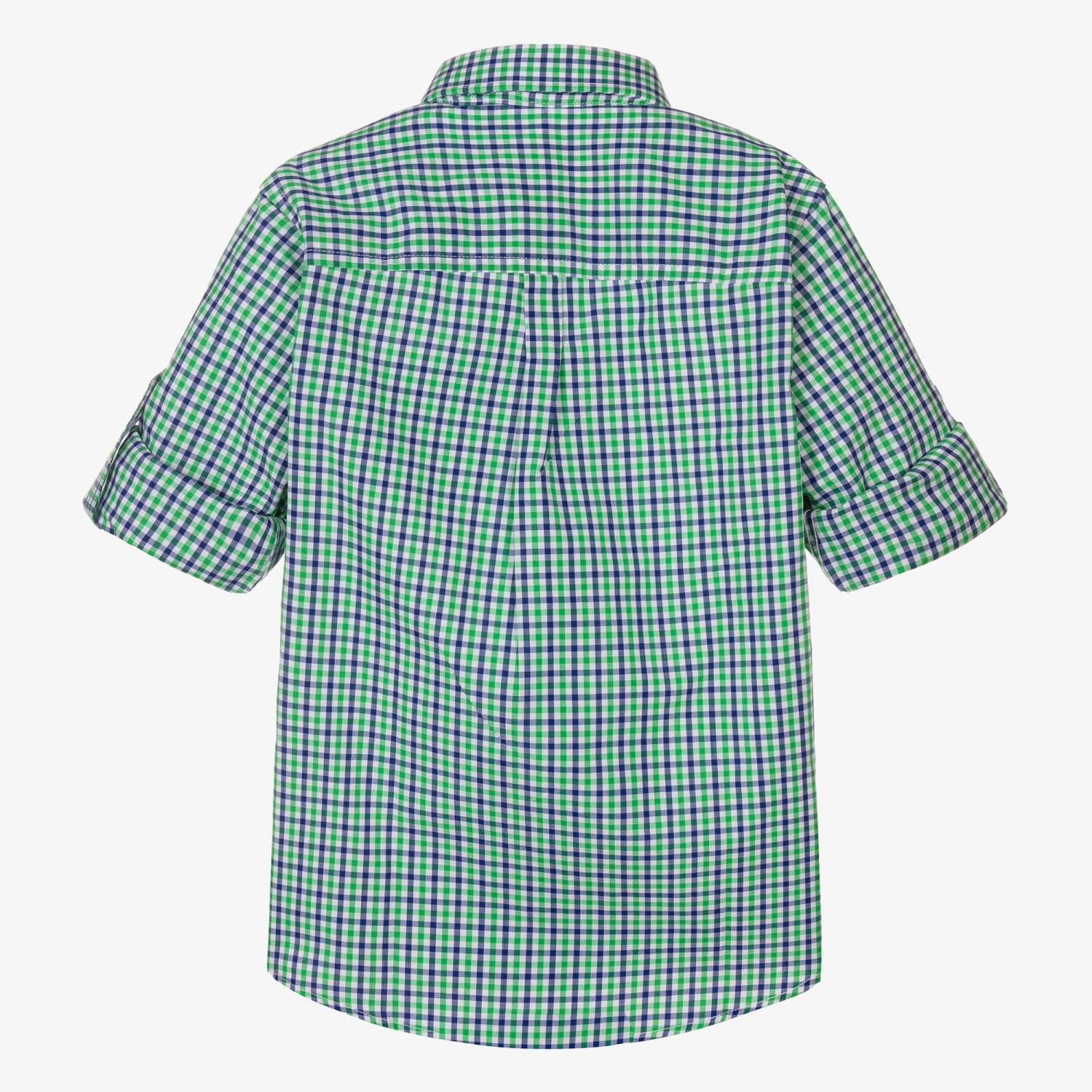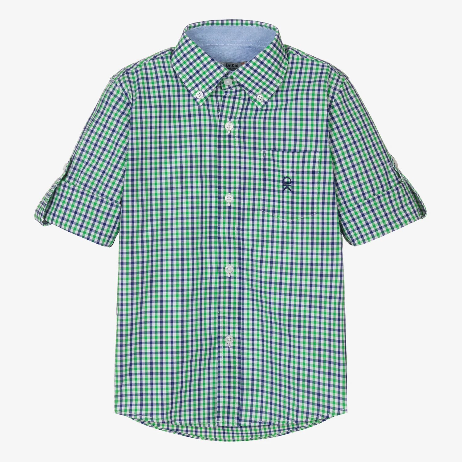 Green, blue and white check shirt for boys by Dr. Kid, made in a soft and lightweight cotton poplin. This smart, casual shirt has a button-down collar and a contrast chambray trim on the inside of the cuffs. For an alternative look, the sleeves can be rolled up and secured with a button. Front button fastening, there is an embroidered logo on the chest pocket for a subtle designer touch.