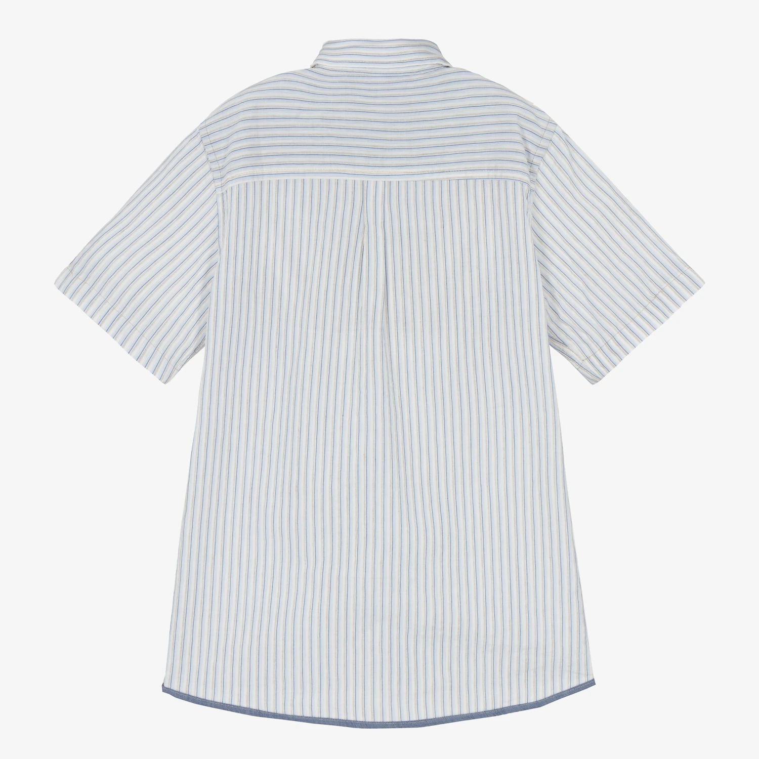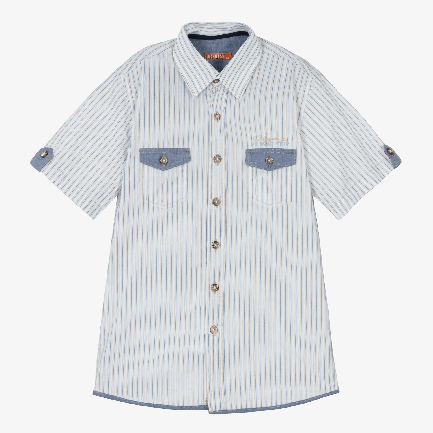 A white, blue and beige stripe shirt for boys by Dr. Kid, made from a lightweight cotton and linen blend. Casual and relaxed, this short-sleeved shirt has ‘Shopping DK Boat Trip’ embroidered on the chest, with button-down pockets. It fastens easily with buttons on the front and has decorative blue panels on the sleeves.