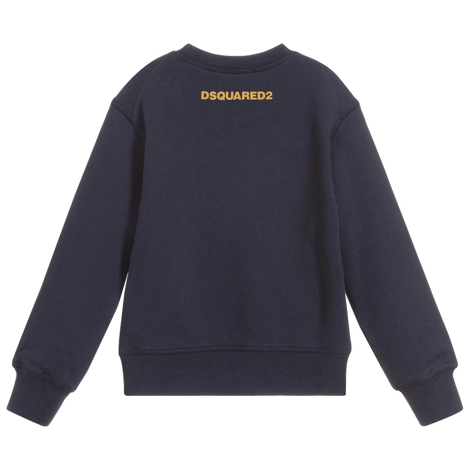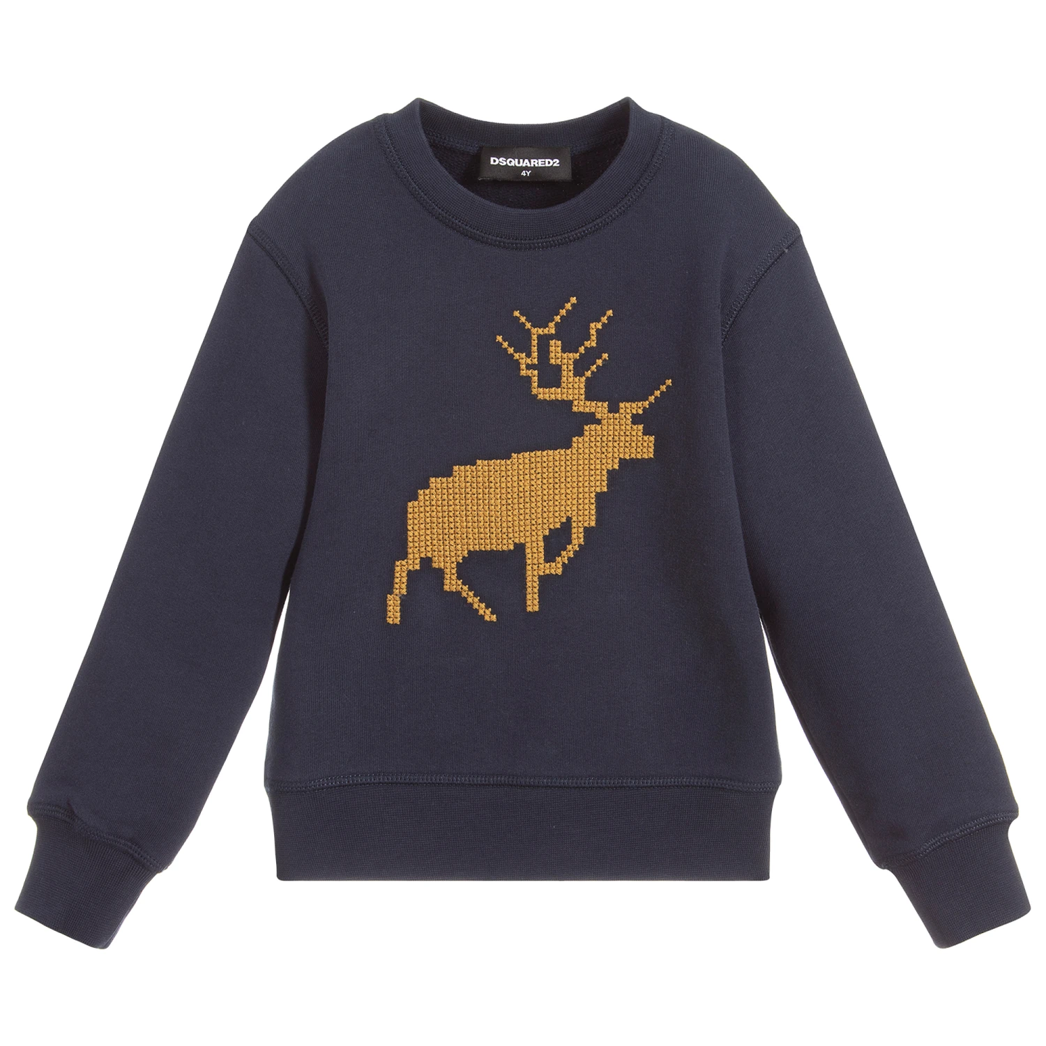 Navy blue cotton jersey sweatshirt for boys by Dsquared2. It has a brown embroidered reindeer on the front.