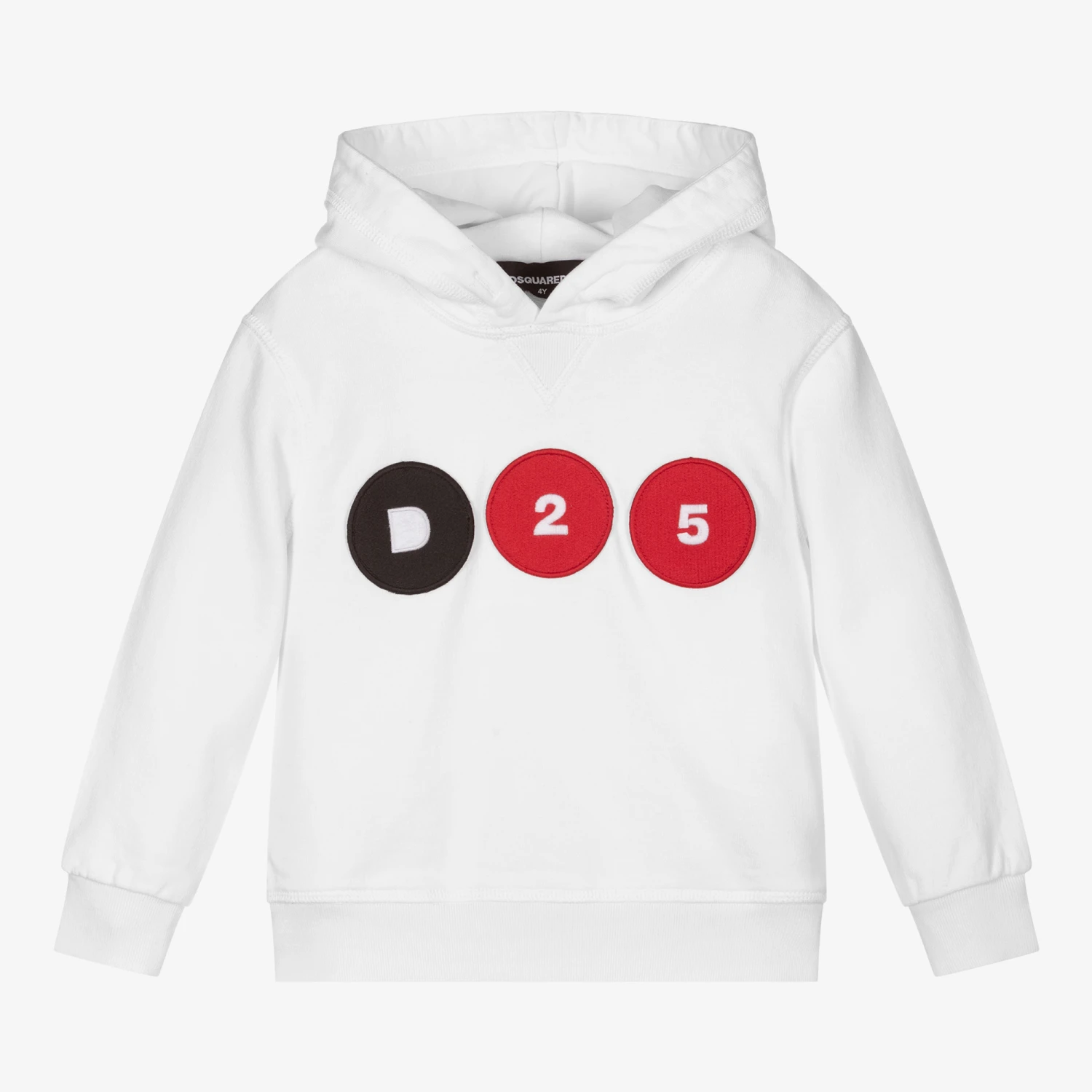 White hooded sweatshirt for boys and girls by Dsquared2, made in soft cotton jersey. The front has red and black logo appliqués, with white embroidery detailing.