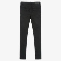 Mid-blue jeans for boys by Emporio Armani, made with an elasticated, jacquard logo insert on the waist. Made in soft, comfortable, stretchy denim, they have a washed and worn look, with distressed cuffs and five-pocket styling. They fasten with a branded popper and zip and are finished with an Eagle metal logo plate on the back for extra designer style.