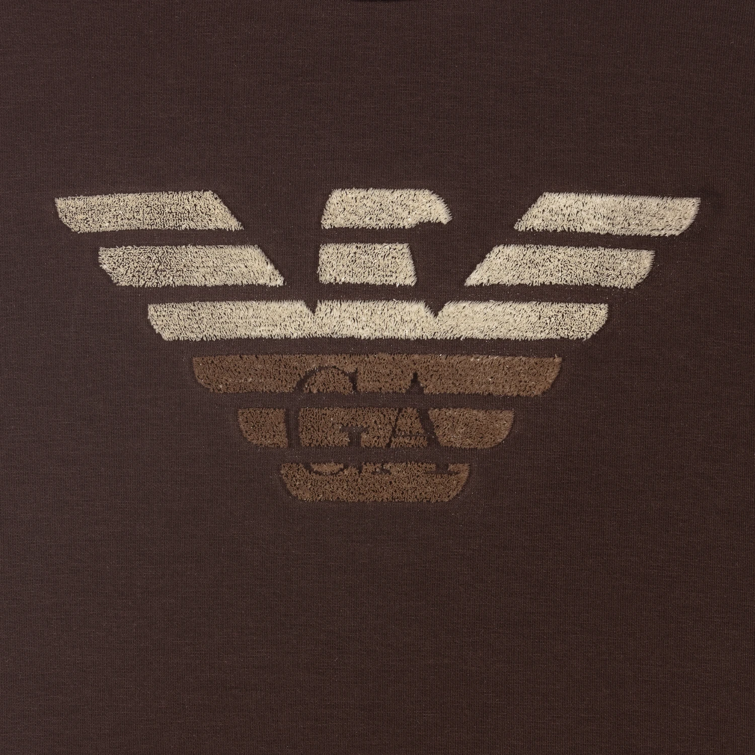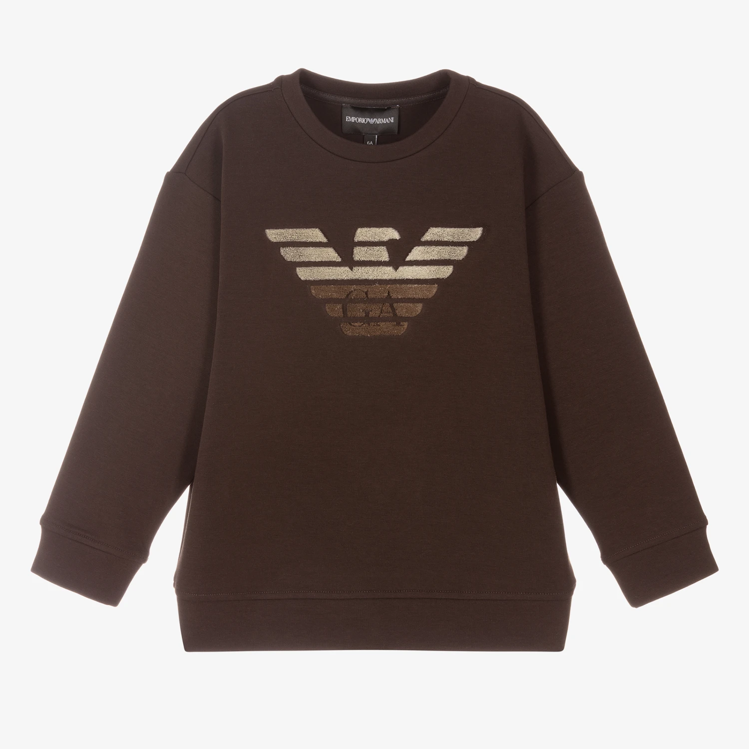 Boys dark brown sweatshirt by luxury brand Emporio Armani, made in a soft and stretchy cotton-blend jersey. It has a raised soft-textured Eagle logo across the chest in a stylish beige and brown design. Oversized and easy to pull on, it has gently ribbed trims for added comfort.