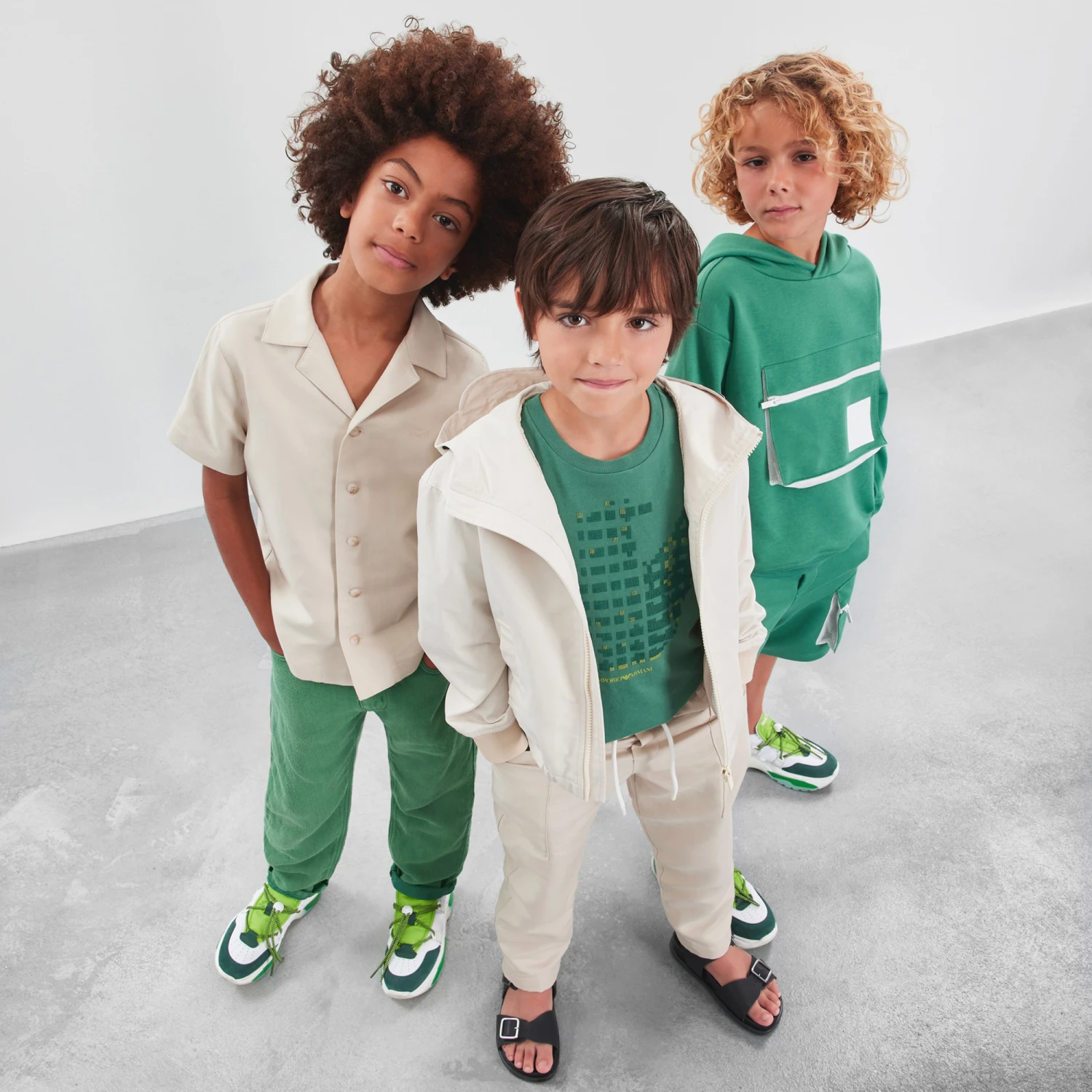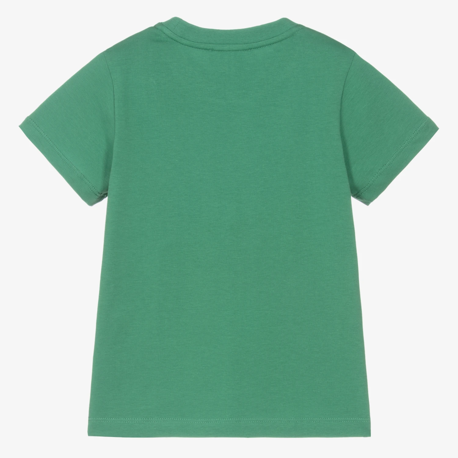 Cool green T-shirt for boys by Emporio Armani, made in soft cotton jersey for comfort. It has a large modern digital pixel Eagle logo print on the front. The T-shirt contains recycled and organic fibres.