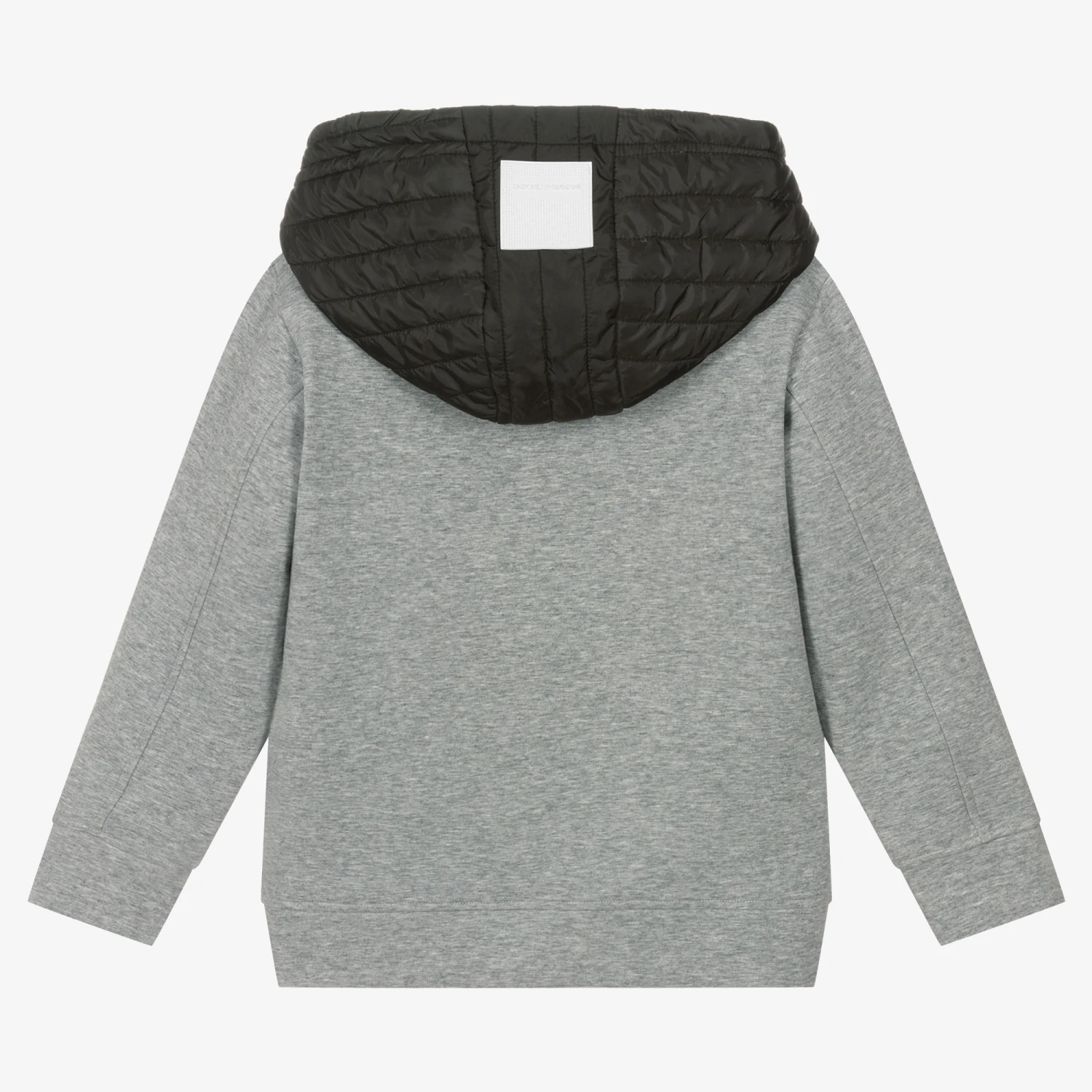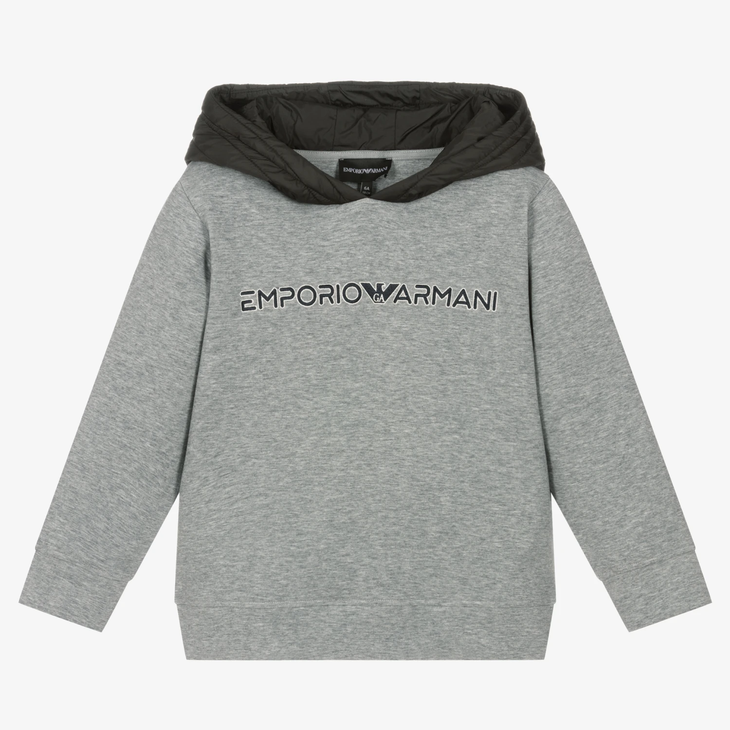 Grey marl hooded top for boys by Emporio Armani, with an embroidered black and white logo across the front. A stylish design, it has a silky black quilted hood with a white rubber logo patch, and is made in luxuriously soft double jersey.
