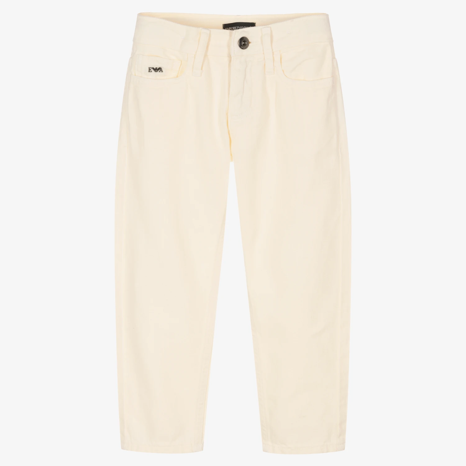 Ivory jeans for boys by Italian designer Emporio Armani, made in soft denim. They have a metallic Emporio Armani logo on the coin pocket and an Eagle logo on one of the back pockets. Comfortable to wear and with a relaxed fit, they have a useful adjustable waistband.