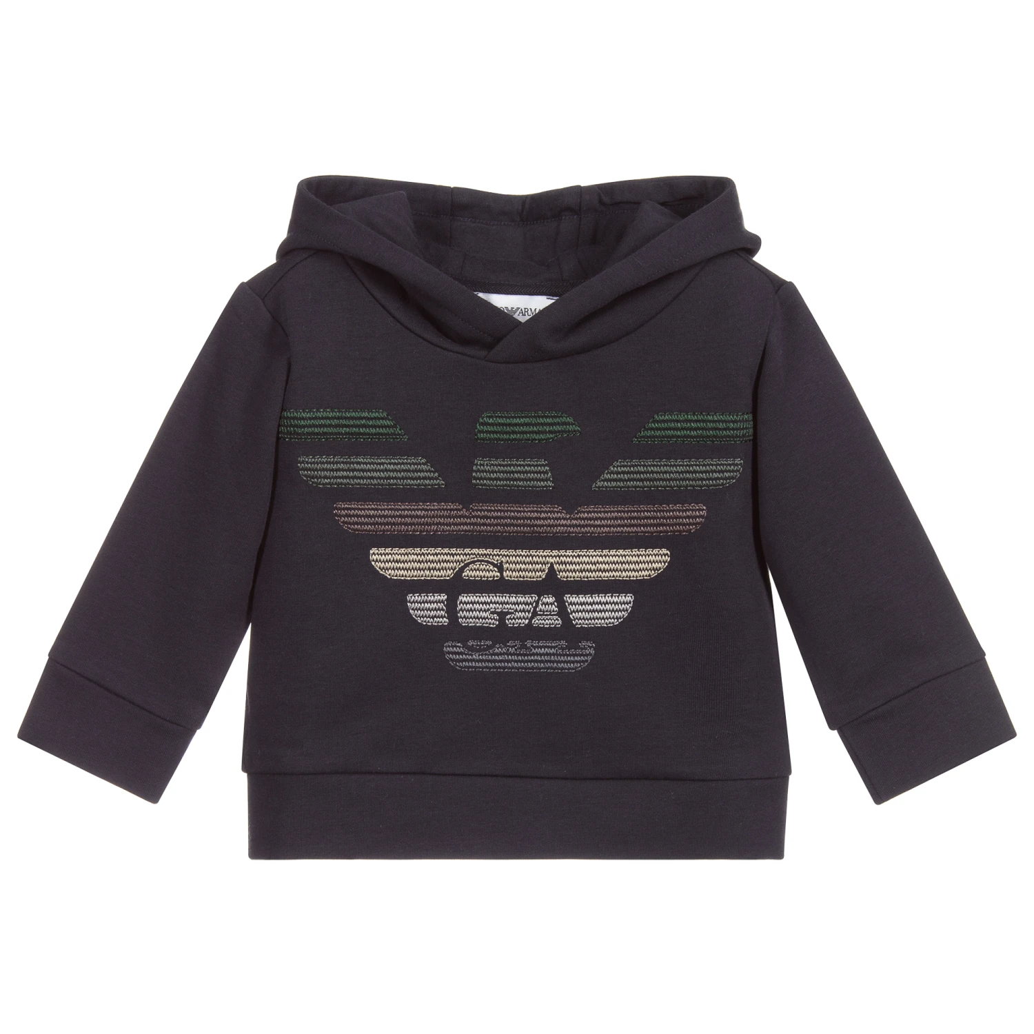 A navy blue hoodie for little boys by Emporio Armani. Made of stretchy, mid-weight cotton jersey, it has a soft fleecy interior. There is a large logo embroidered on the front in shades of green, brown, beige and grey. The hood is lined in lightweight cotton jersey.