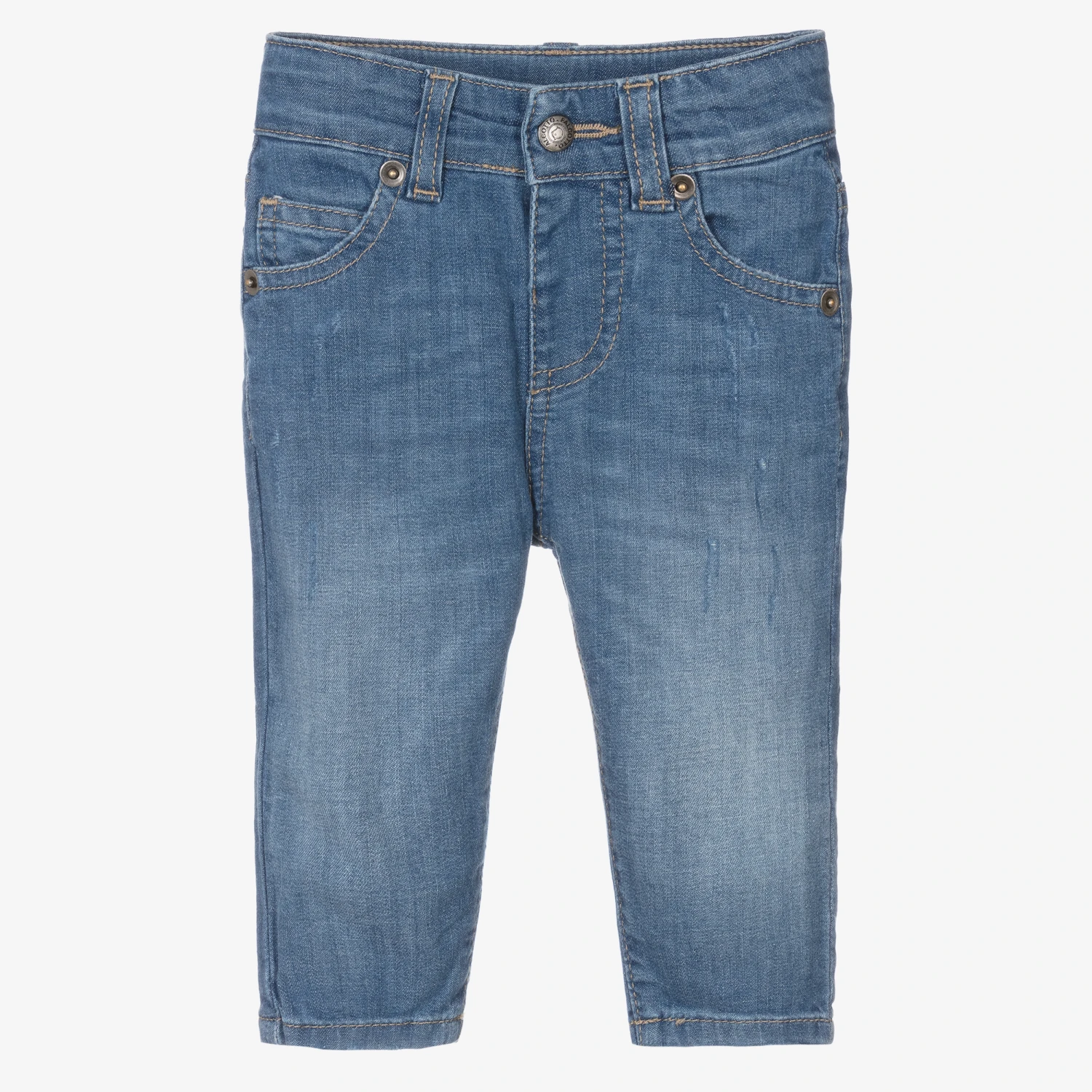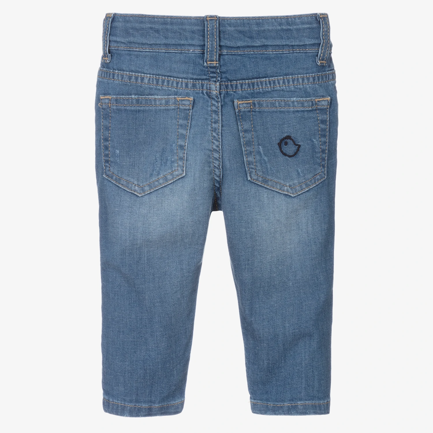 Mid-wash blue jeans for little boys from Falcotto by Naturino, with cool distressed and faded patches. Made in lightweight cotton denim, they are styled with five pockets, a branded popper fastening and metal rivets for a classic denim look. The waistband is adjustable for a comfortable fit and the Italian designer’s Chick logo is embroidered on the back pocket.