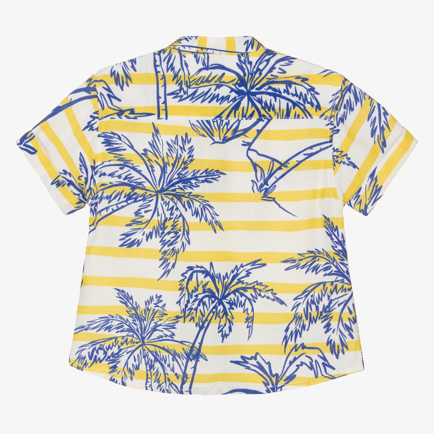 Smart casual ivory shirt for little boys from Italian brand Falcotto by Naturino, with yellow stripes and a blue palm tree pattern. This collarless, short-sleeved shirt is made in lightweight viscose for cool and comfortable wear. It has turn-ups on the cuffs and button fastenings on the front.