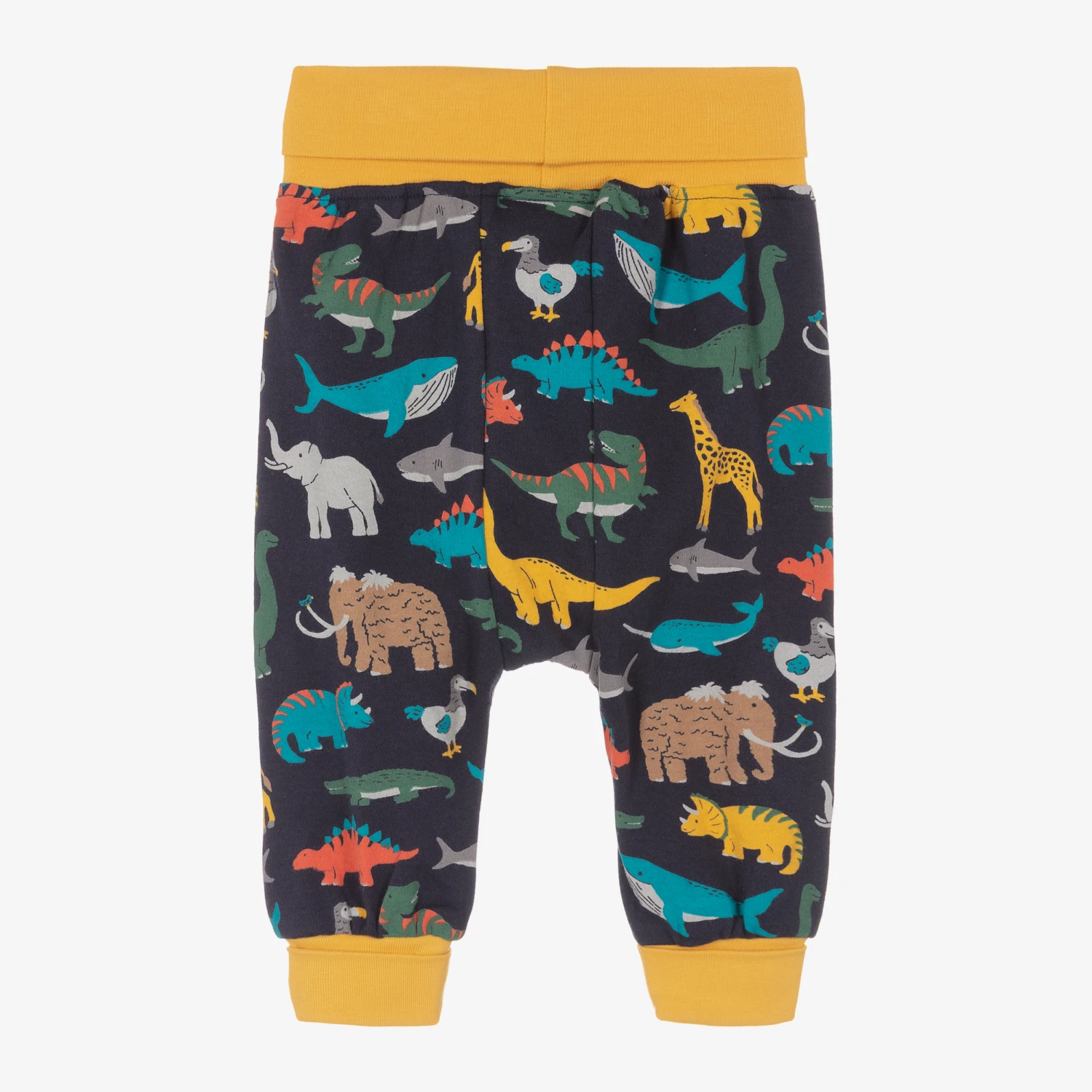 Comfortable navy blue joggers for little boys and girls by British brand Frugi, with fun dinosaur and animal prints. Made in soft organic cotton jersey that is gentle on delicate skin, they are designed with a roomy fit to cover cloth nappies. The contrast yellow fold-over waistband and cuffs can be extended to allow for growth spurts.