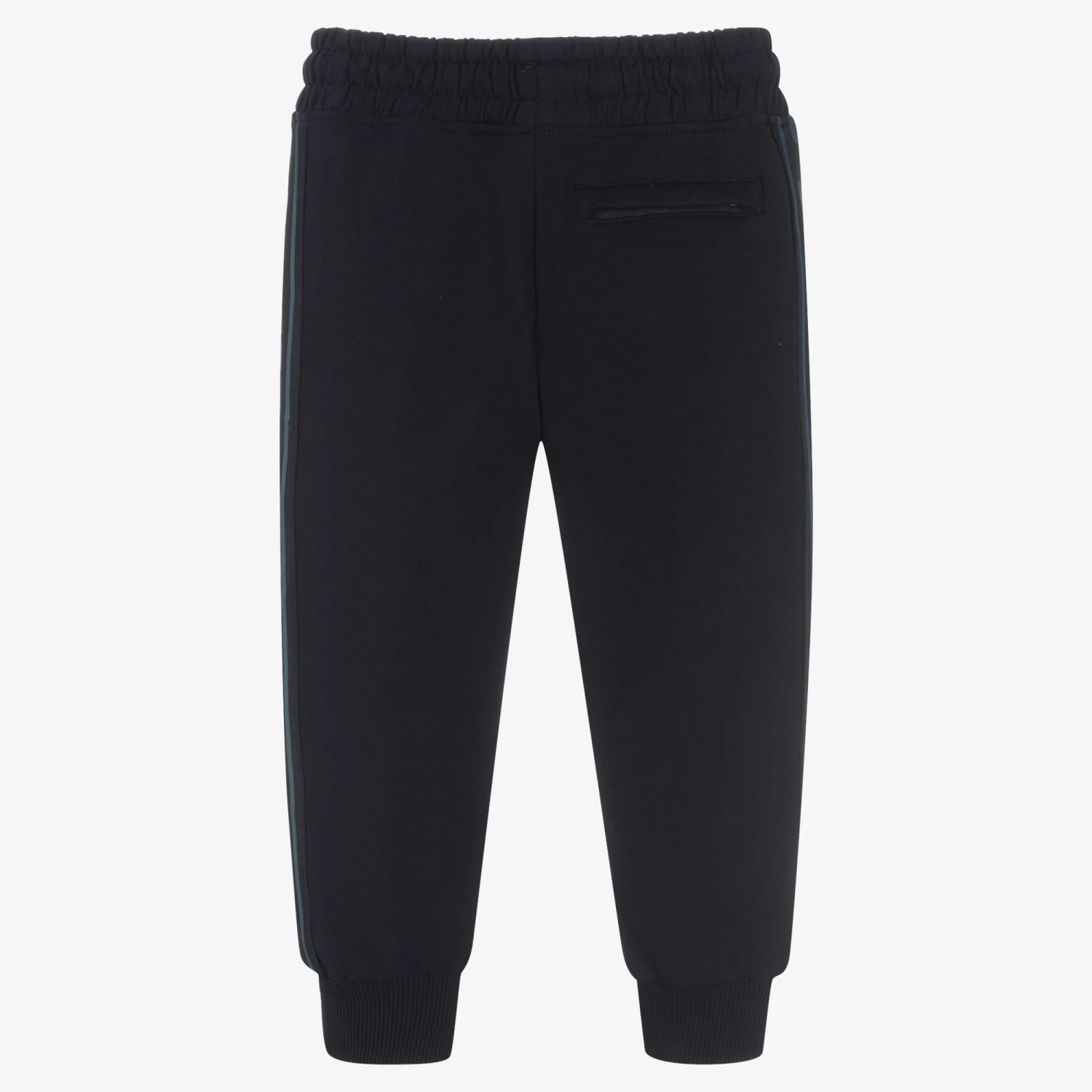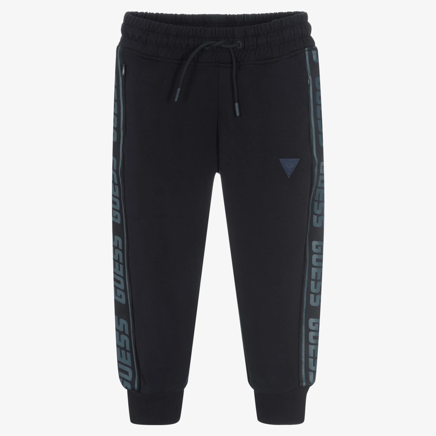 Sporty navy blue joggers for boys by Guess, made in easy wearing cotton jersey with some organic fibres. Soft and mid-weight, they have logo tape down the sides of the legs and a rubber Triangle logo patch on the front. With a drawstring waist, they also have three zipped pockets, ideal for keeping belongings secure.