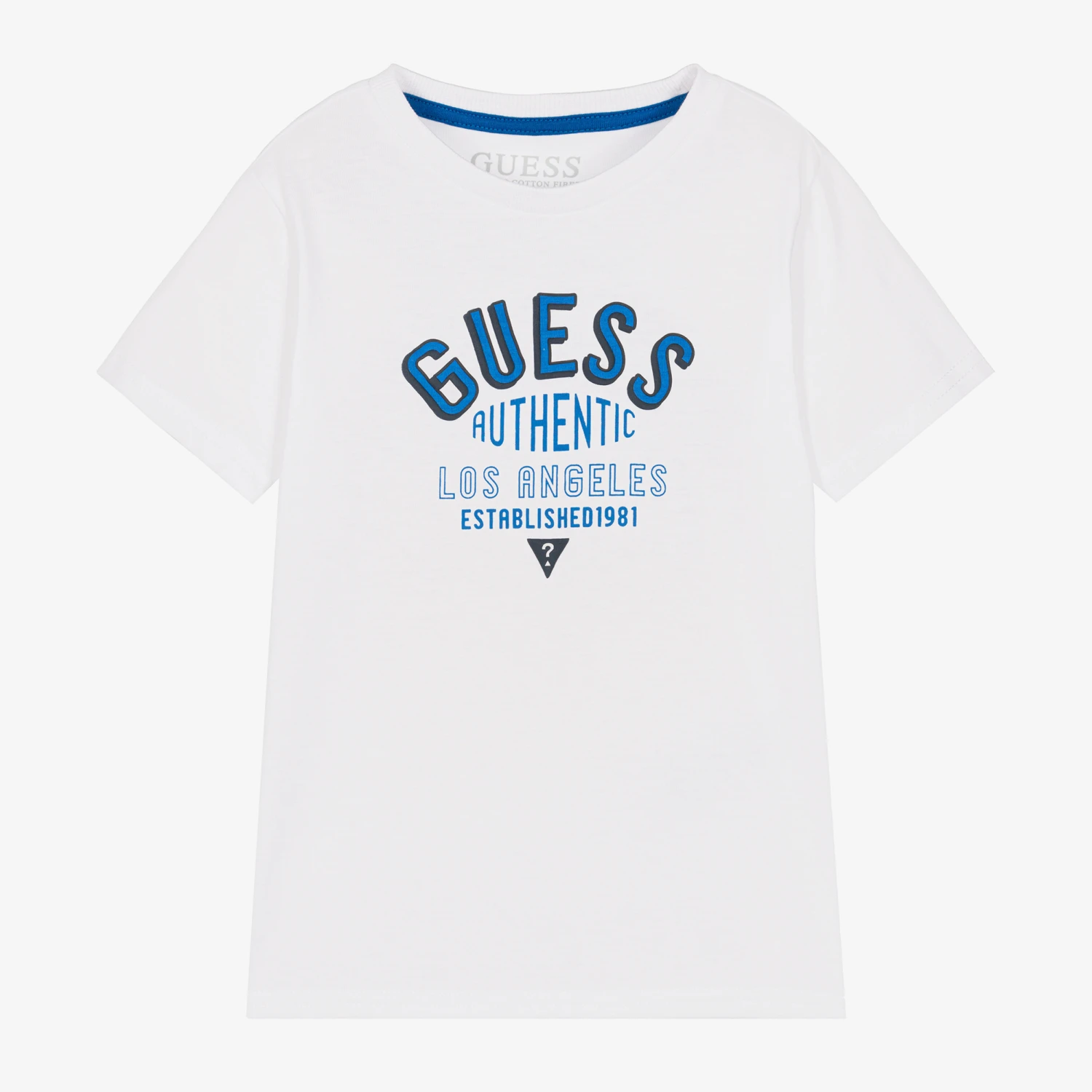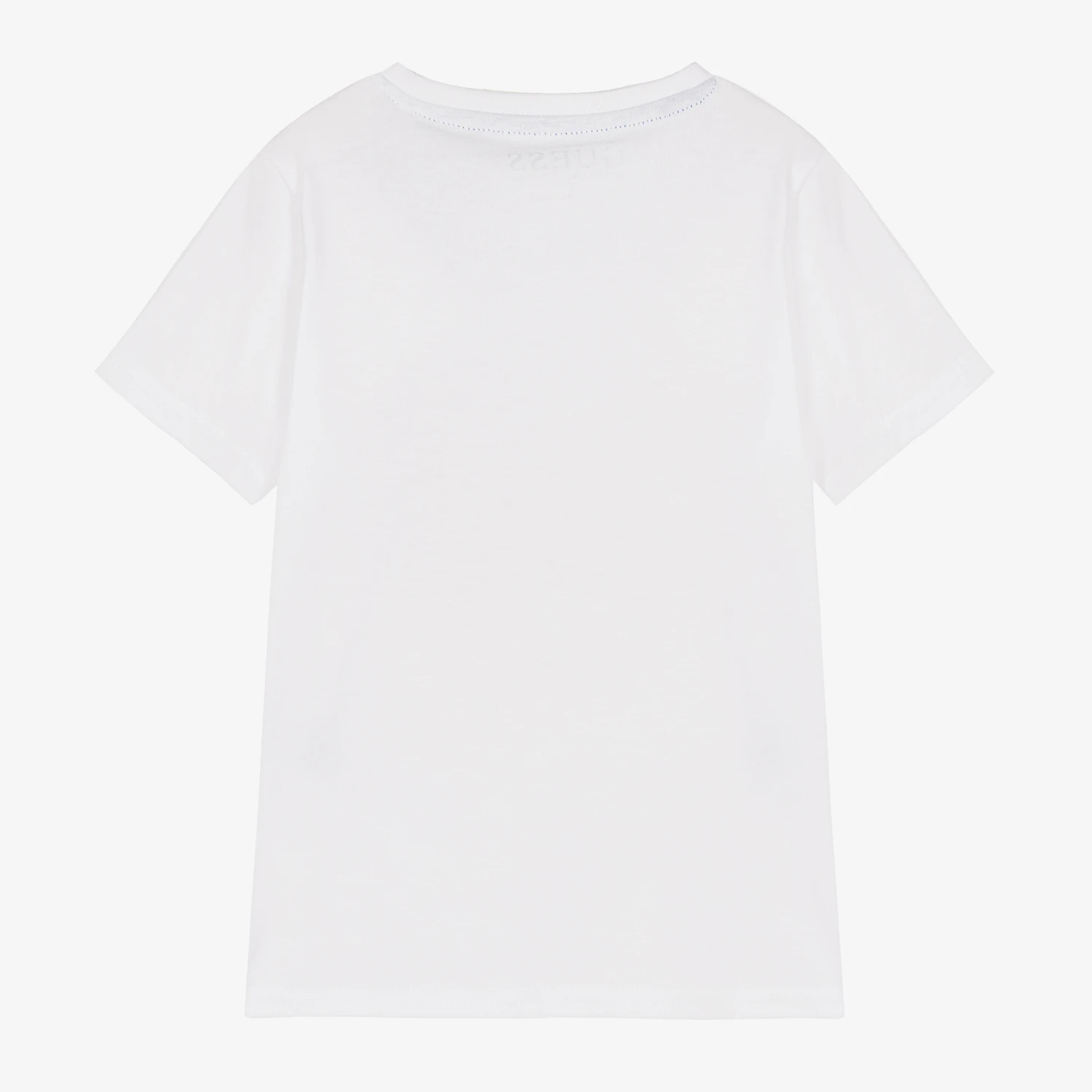 White cotton T-shirt for boys from Guess. Soft, stretchy and lightweight, this comfortable top has the American brand’s logo stamped on the front in shades of blue, with a Triangle logo detail beneath. It contains organic cotton fibres.