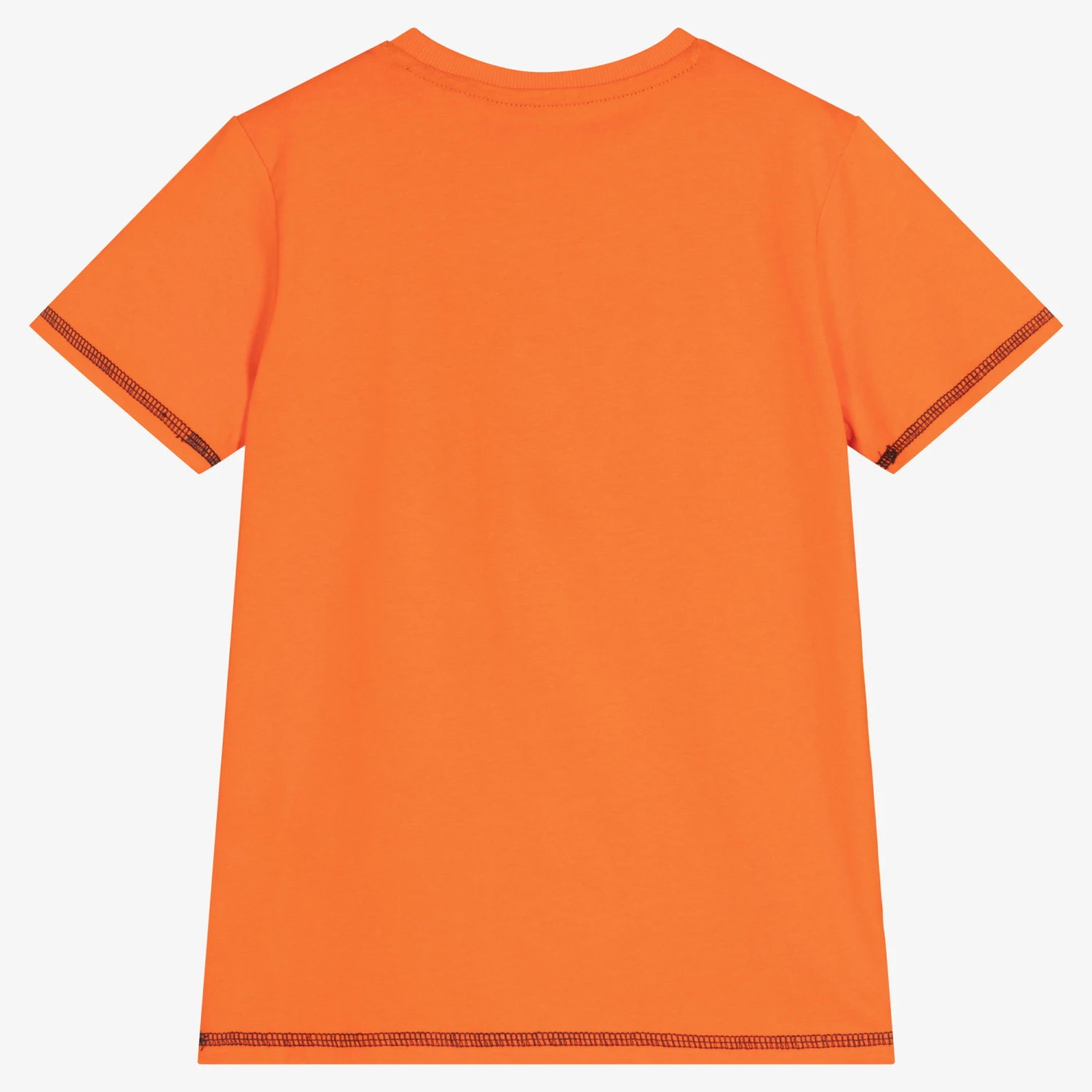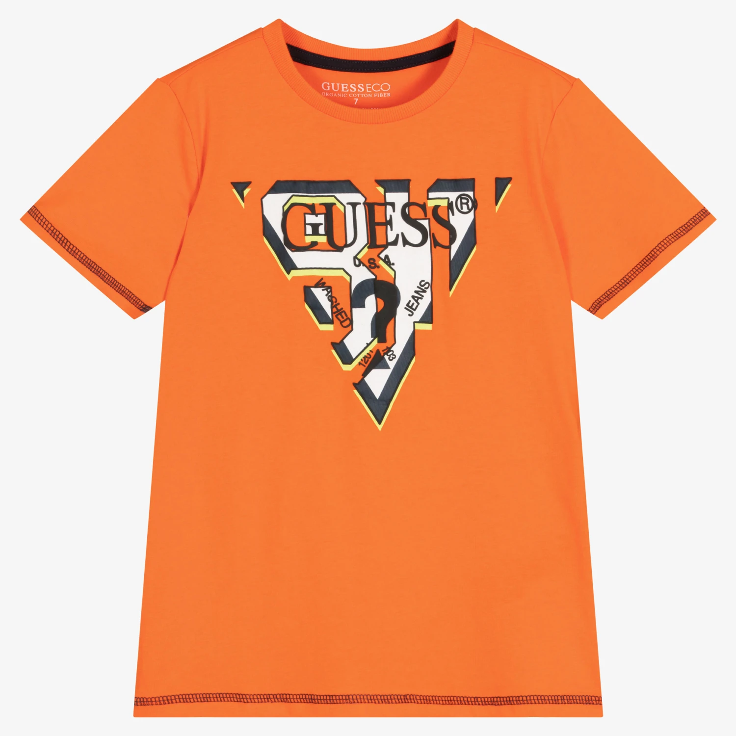 Orange cotton T-shirt for junior boys by American brand Guess, made in all-day comfortable jersey. It has the designer’s signature Triangle logo on the front, in rubberised blue, white and lime green. There is dark blue overstitching on the cuffs and hemline. This T-shirt contains organic cotton fibre.