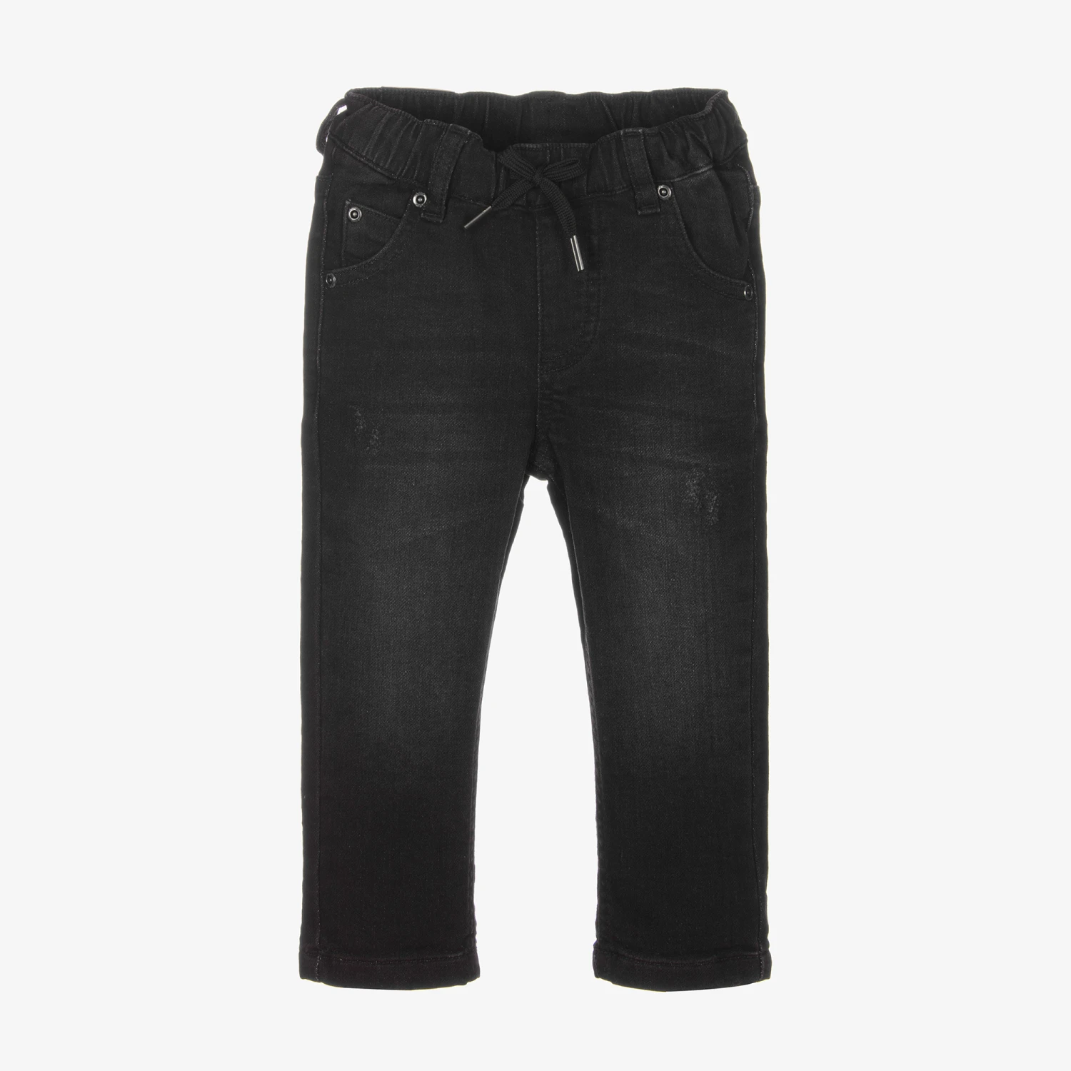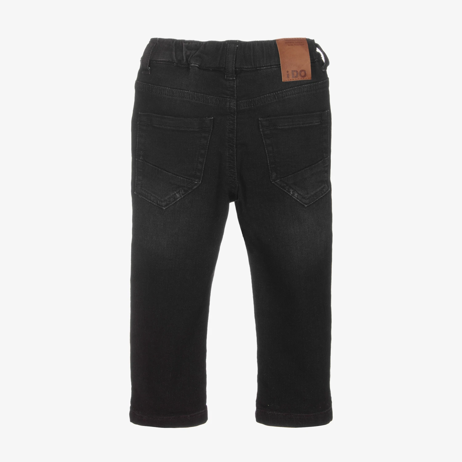 Stylish washed black jeans for boys by iDO Baby, made in soft cotton denim. In a classic five pocket style, there are cool distressed details on the front and a brown logo patch on the back. They have an elasticated and adjustable drawstring waist for comfort and fit.