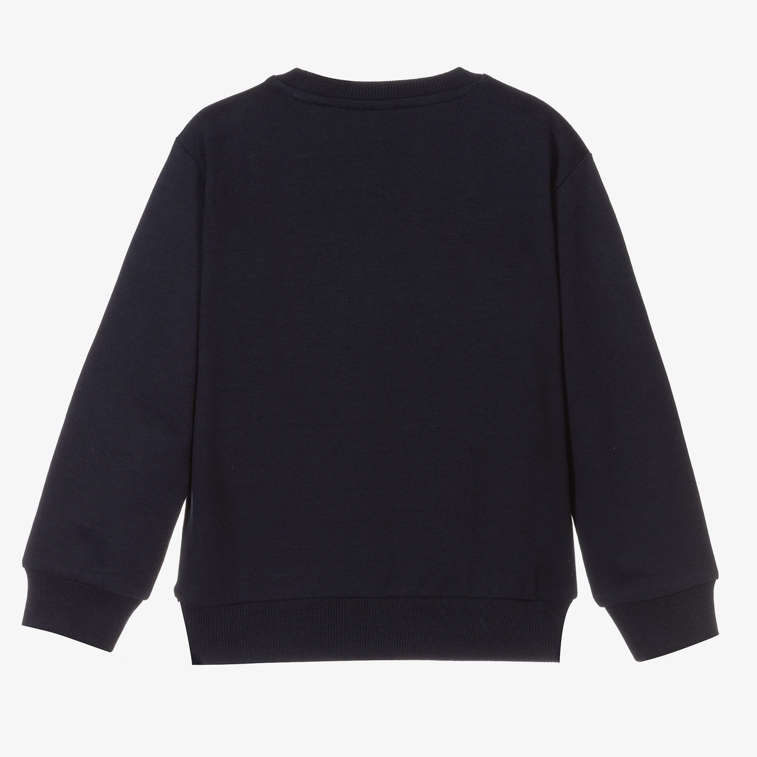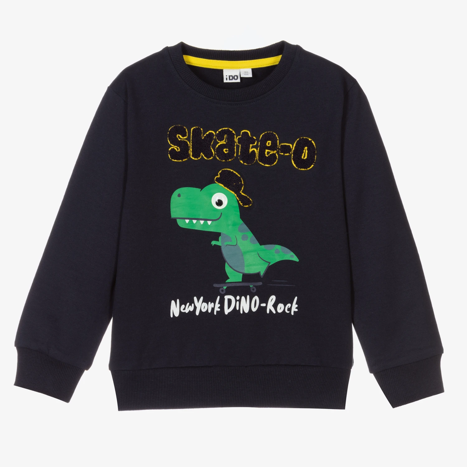 Boys navy blue sweatshirt from iDo Junior, made in mid-weight cotton jersey. It has a green dinosaur print and the words ‘skate-o’ in blue and yellow looped embroidery on the chest. There are ribbed trims and a fun 3D movable eye.