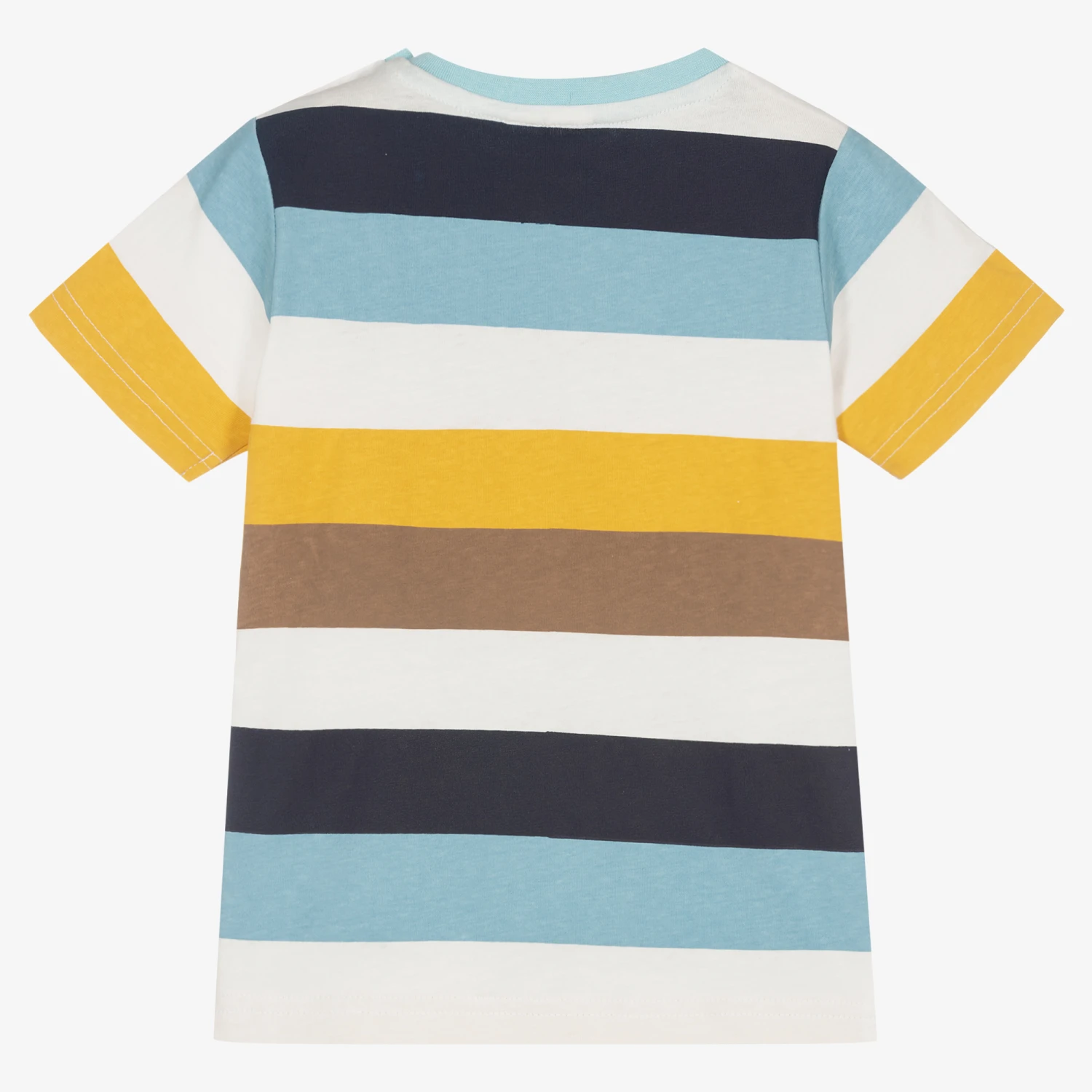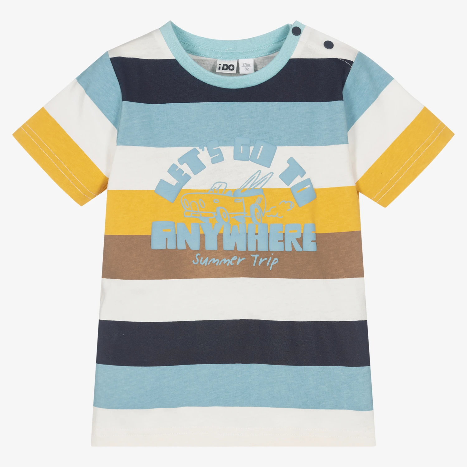 Casual blue, yellow and white striped T-shirt for boys is by iDO Baby. Made in soft and comfy cotton jersey, it has a fun slogan print on the front, with easy-fastening shoulder poppers on the smaller sizes.