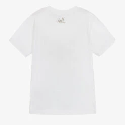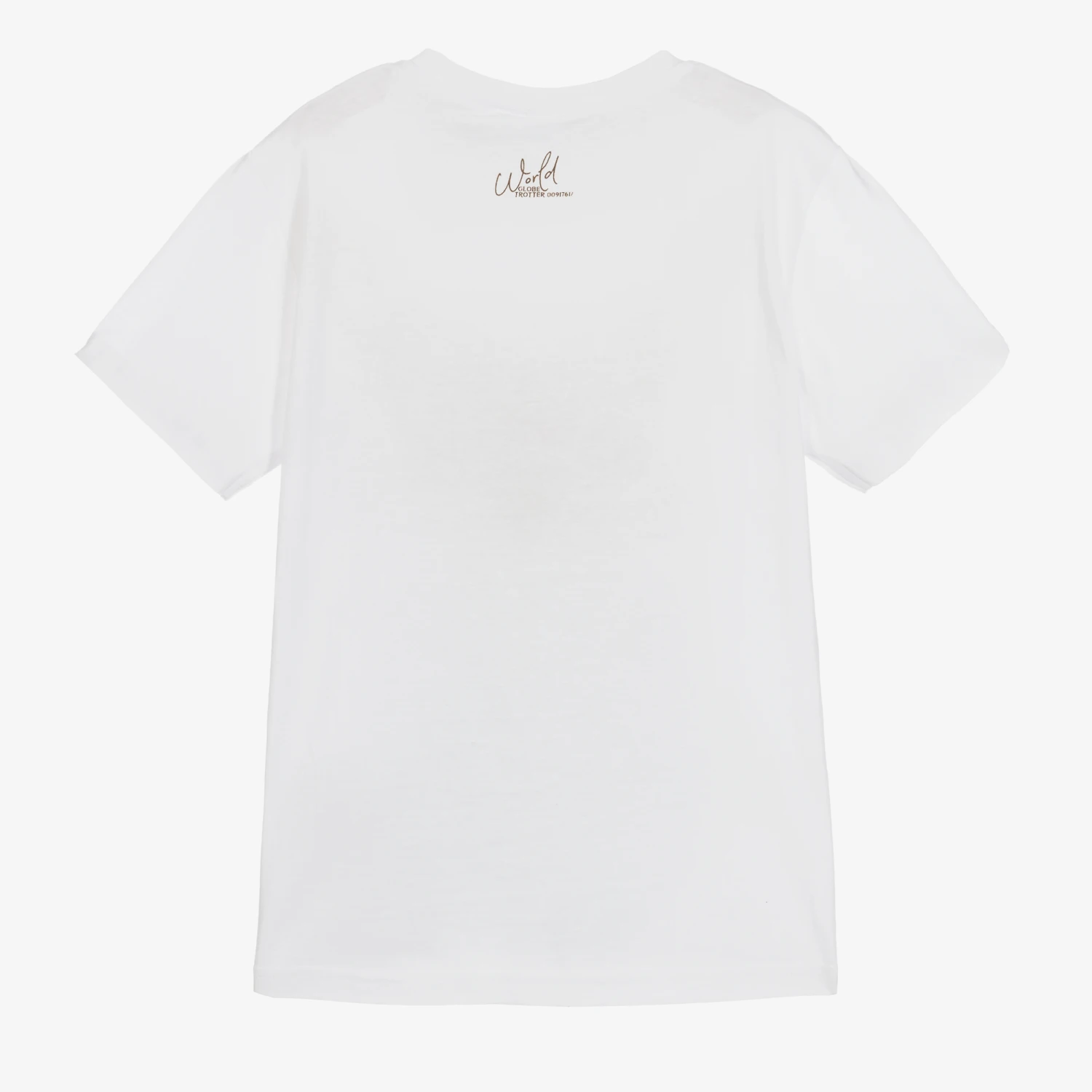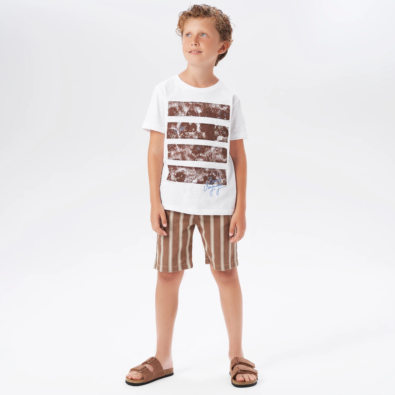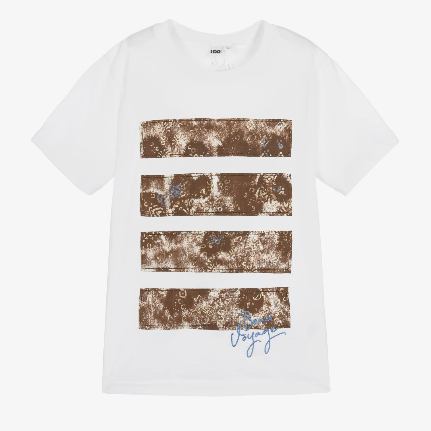 A white and brown T-shirt for boys from Italian brand iDO Junior. Appliquéd on the front are distressed-effect stripes, with ivory and blue geometric details and ‘Nice Trip’ embroidered in French. A travel-themed message is printed on the back to complete the look.