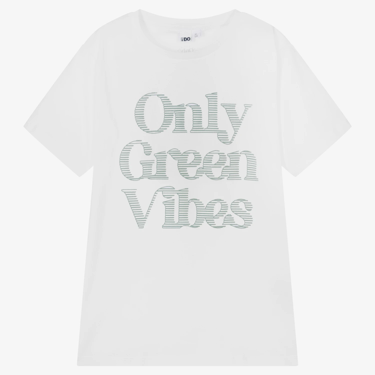 White T-shirt for boys and girls by iDO Junior, made in soft and stretchy cotton jersey. Cool and comfortable, with a classic crew neck, it has a green rubberised ‘Only Green Vibes’ slogan on the front.