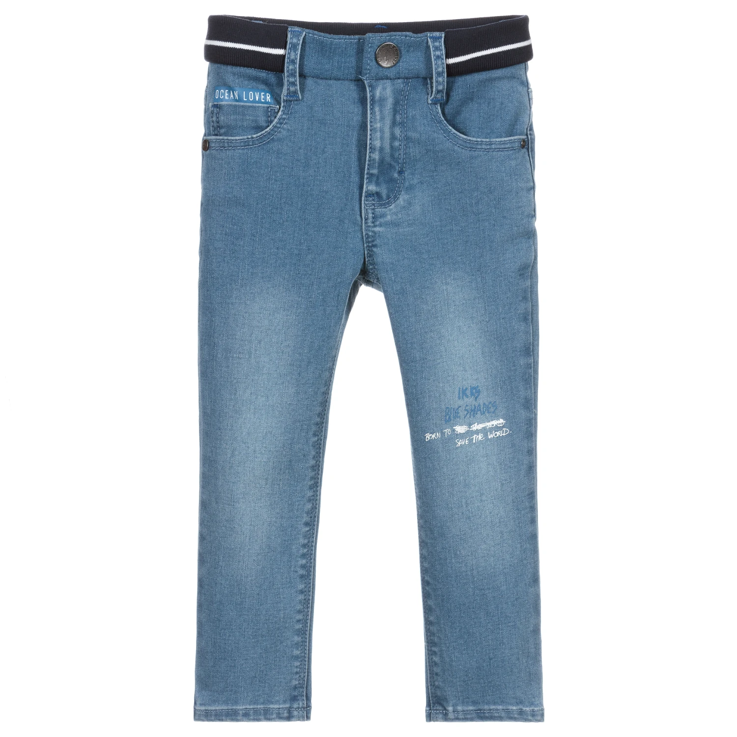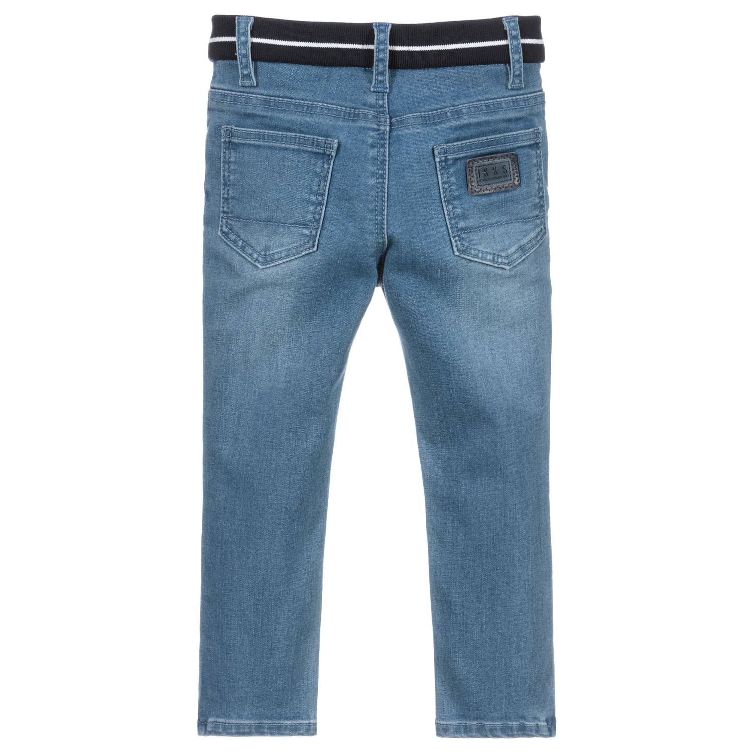 Mid-blue jeans for little boys by IKKS, made in soft stretch denim. Eco friendly, they have been partially designed using recycled plastic bottles. The elasticated ribbed waistband is navy blue with a white stripe.