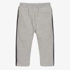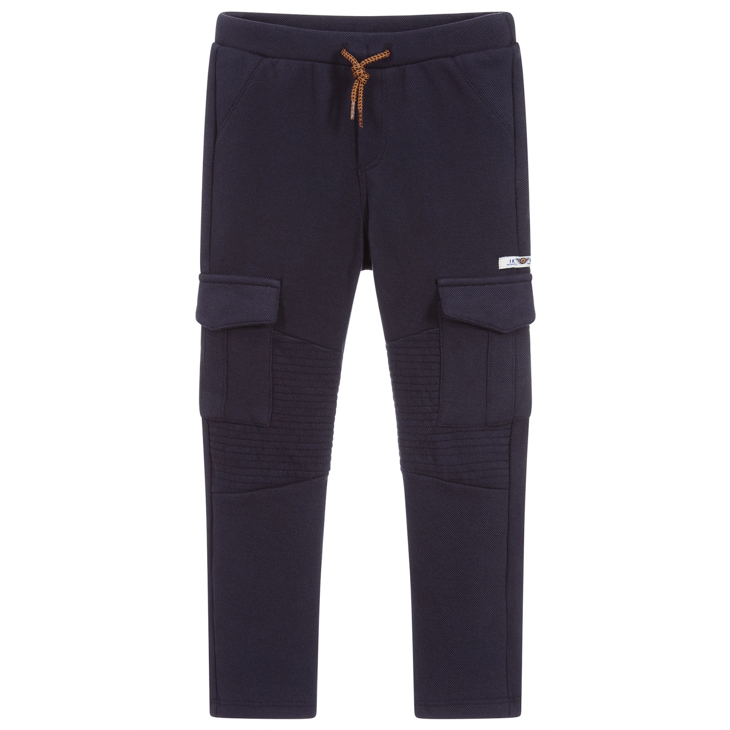 Boys navy blue cotton piqué trousers, with cargo style pockets, by IKKS. Soft and stretchy, they are lined in soft cotton jersey and have an elasticated waistband with a decorative waistband.