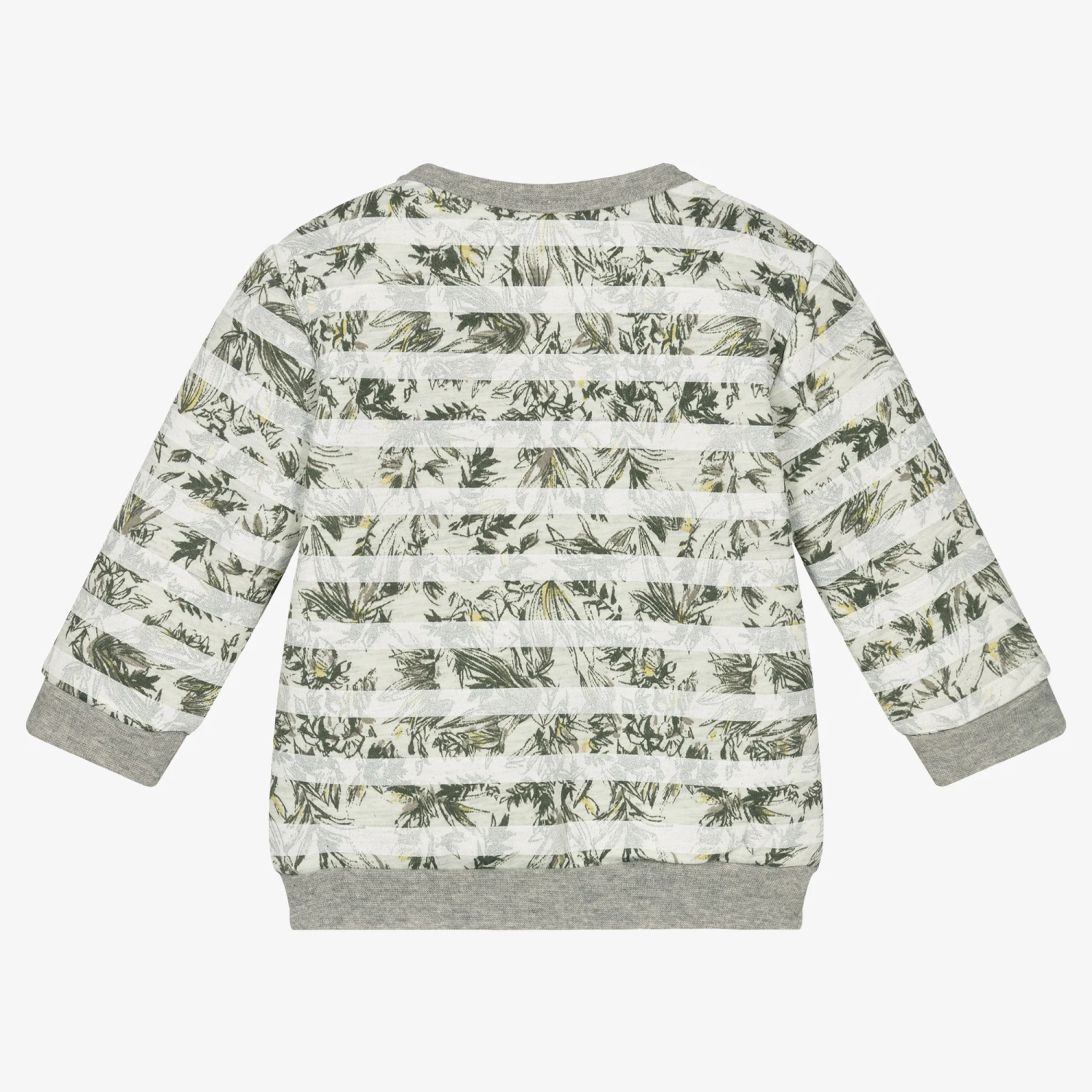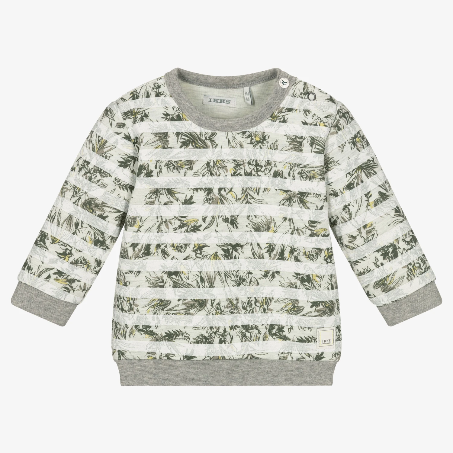 Grey sweatshirt for little boys by IKKS, with a green botanical and white striped print. Casual and comfy, it is made in a double-sided viscose jersey, with ribbed trims. It has popper fastenings on one shoulder to help with dressing.