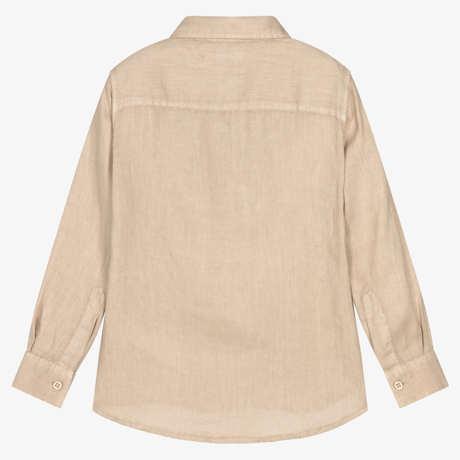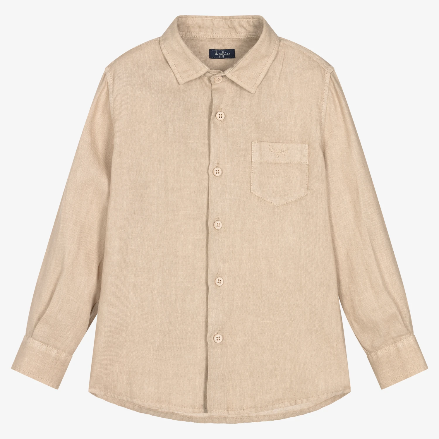 From luxury Italian brand Il Gufo, a beige shirt for boys, made in lightweight linen. It fastens with buttons on the front and there is a chest pocket embroidered with the brand’s logo for a subtle designer touch.