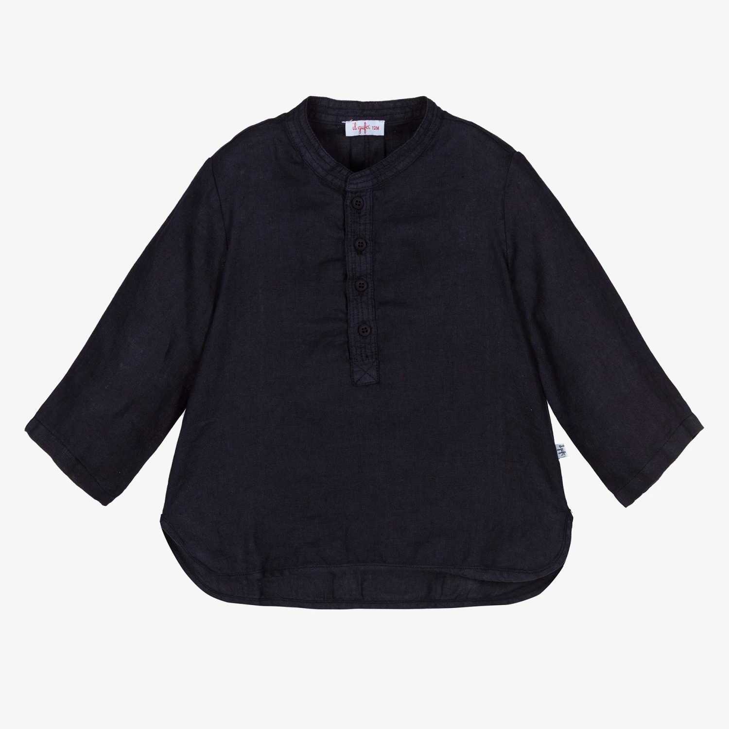Casual navy blue shirt for boys by luxury Italian designer Il Gufo, made in lightweight linen. There is stitching detail around the neckline and placket, and the curved hem is slightly longer around the back than the front. The brand’s fabric logo tab is on one side seam.