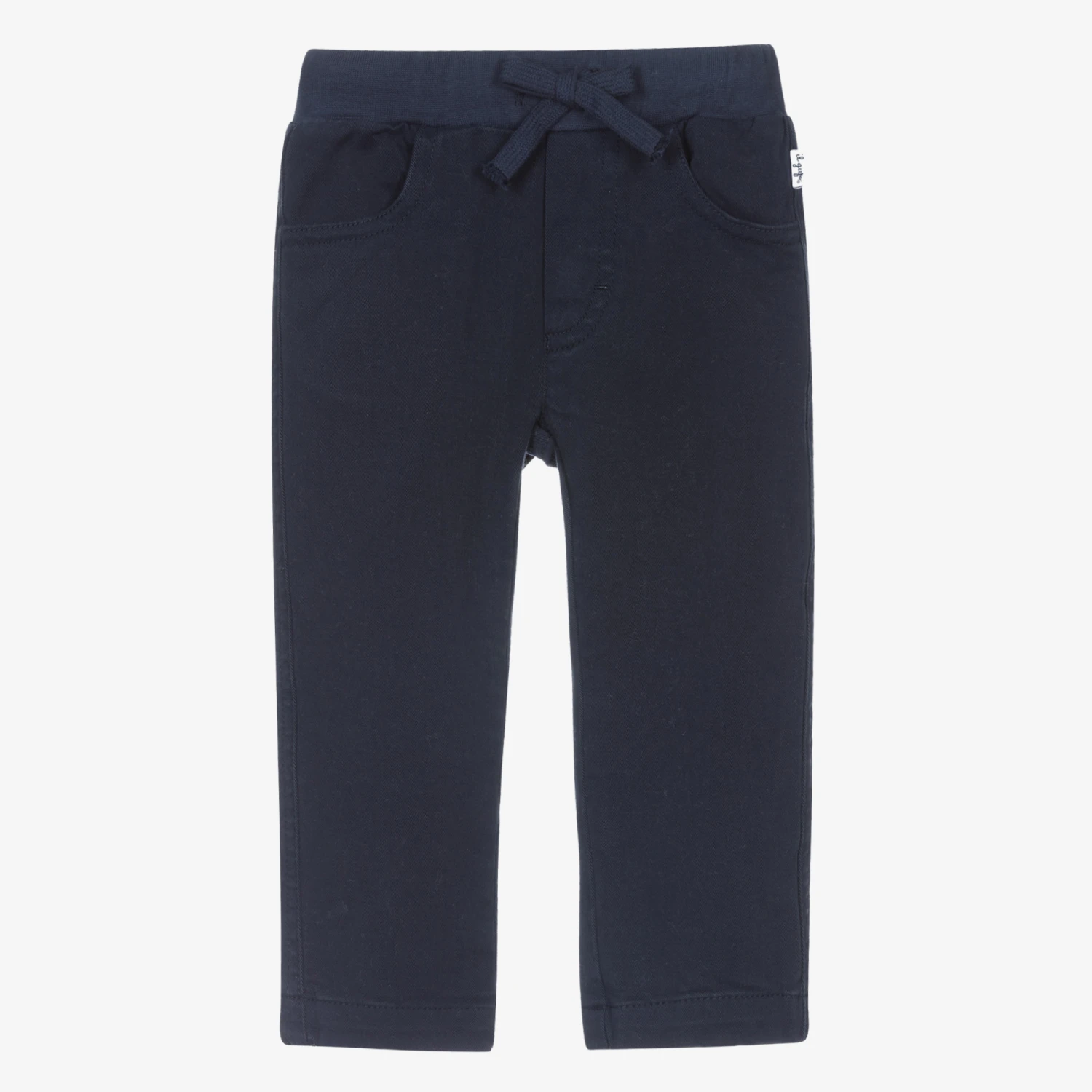 Little boys navy blue cotton twill trousers by luxury Italian brand, Il Gufo. In a jeans style, they have added elastane for stretch, an adjustable drawstring waist and pockets on the front and back.