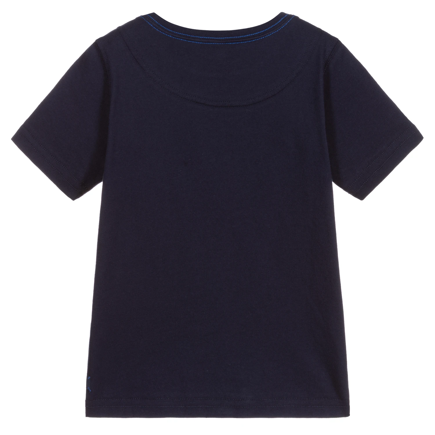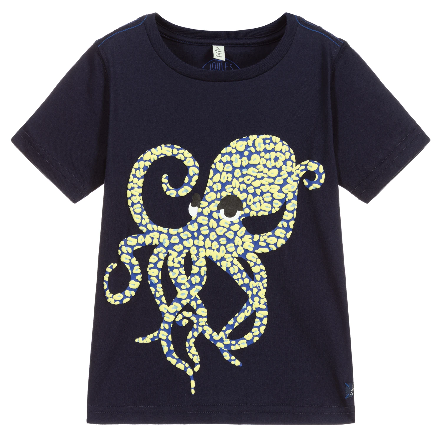 Boys navy blue cotton jersey T-shirt by Joules. Super soft and comfortable, it has a fun yellow and blue foam puff print octopus on the front. There is a navy blue logo patch stitched to the side seam.