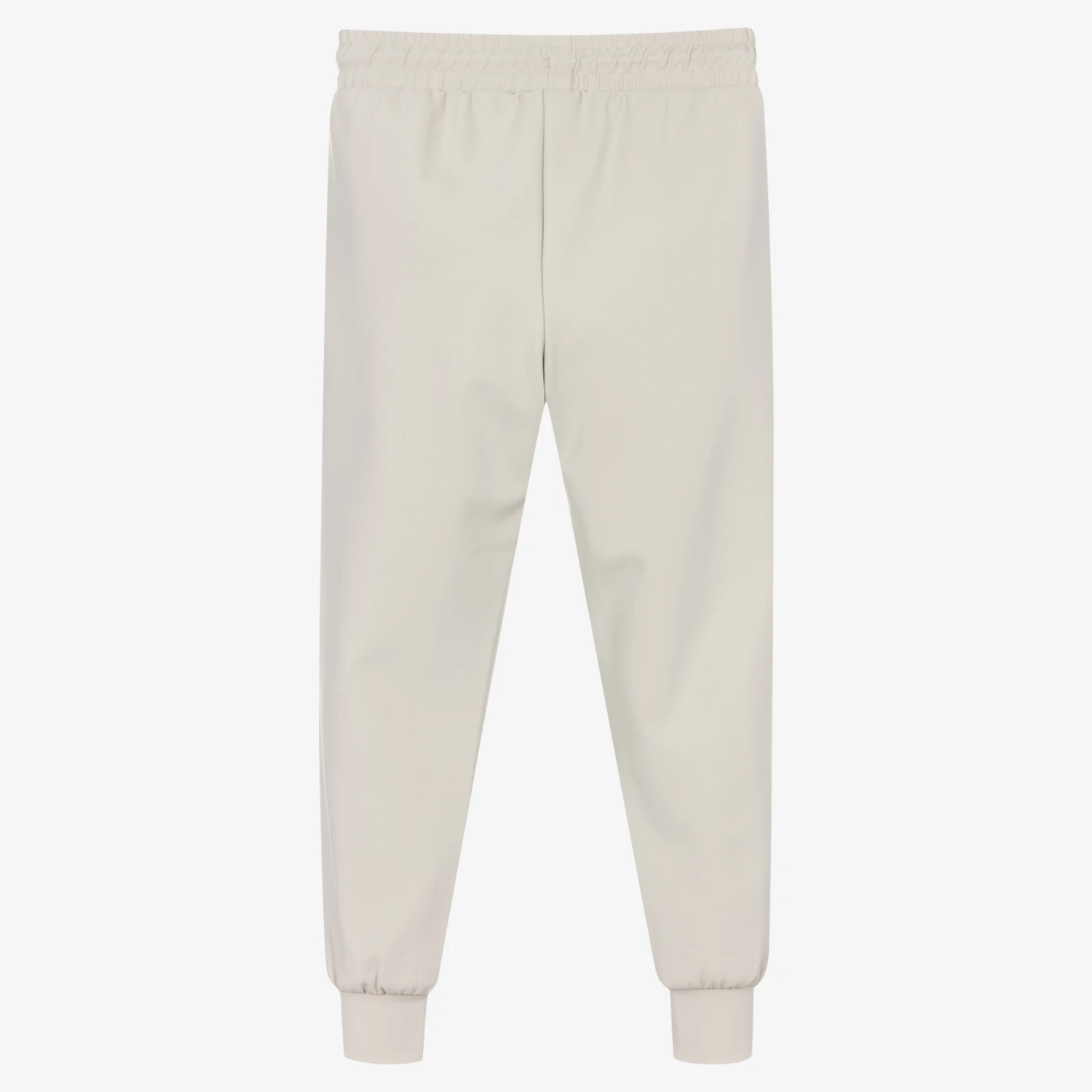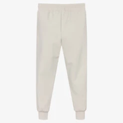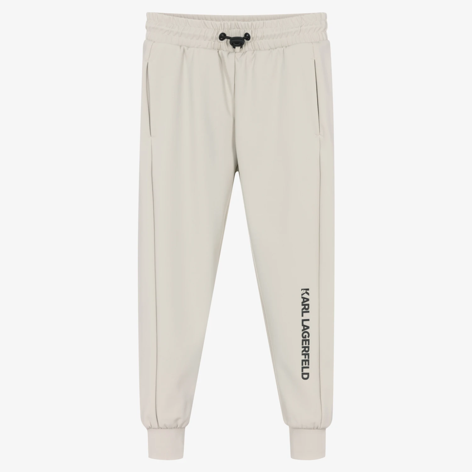 Sporty pale grey joggers for boys by KARL LAGERFELD KIDS, with a black logo print on one leg. Made in silky smooth, lightweight jersey, they have concealed side seam pockets with a breathable mesh lining and a drawstring waist with a plastic toggle for a good fit.