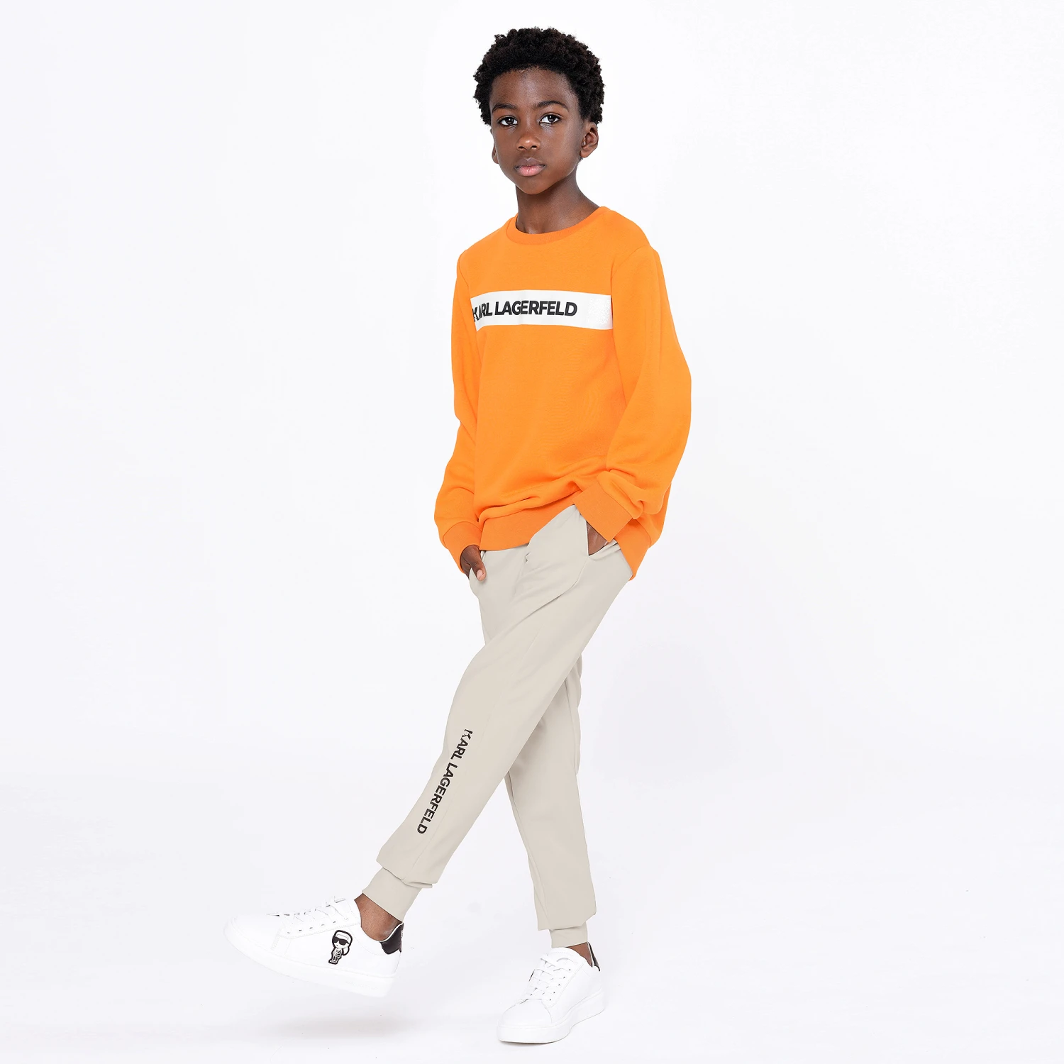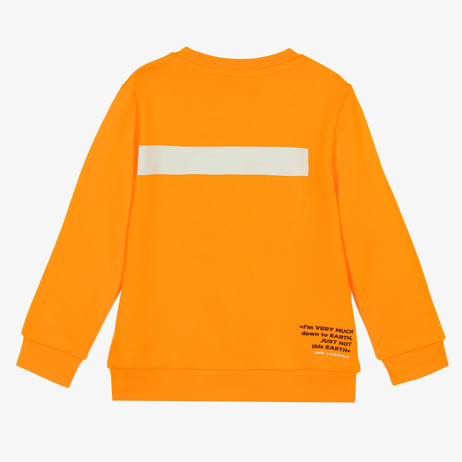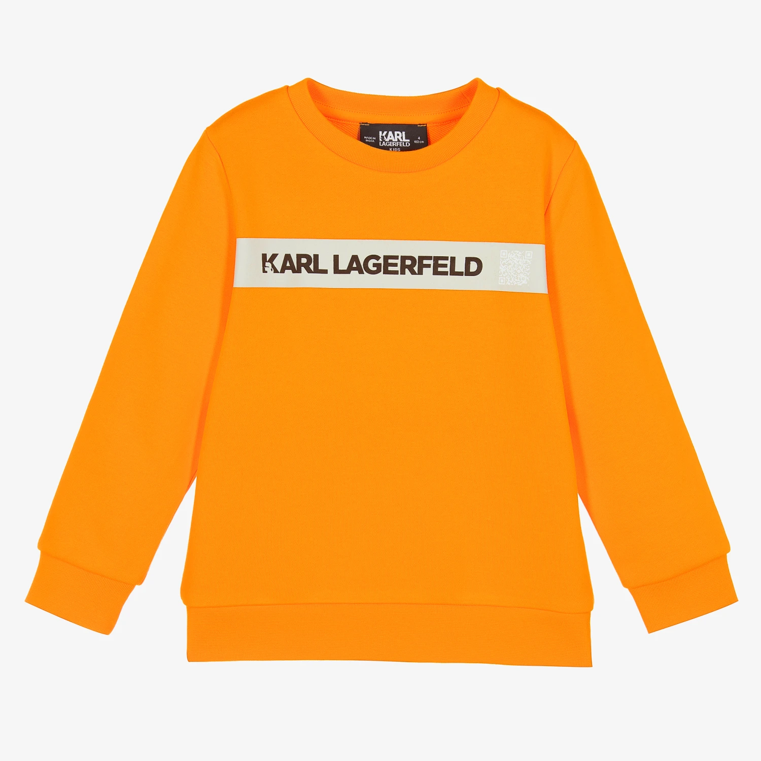 A orange sweatshirt for boys by KARL LAGERFELD KIDS, made in the softest organic cotton jersey. Cool with a futuristic feel, a grey panel is printed on both sides, with the brand’s signature black logo and a QR code. Inspired by Karl’s own words, a positive slogan is printed on the hem in raised letters.