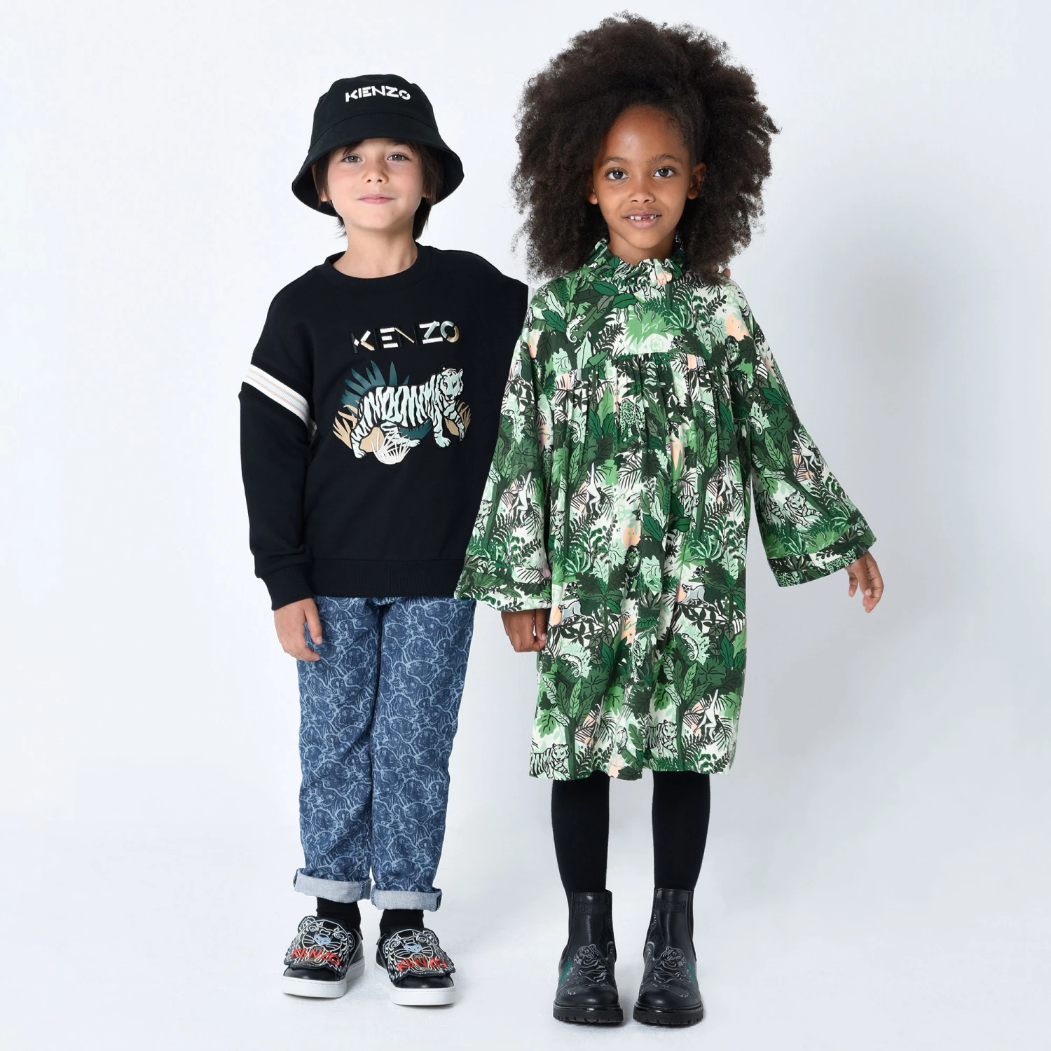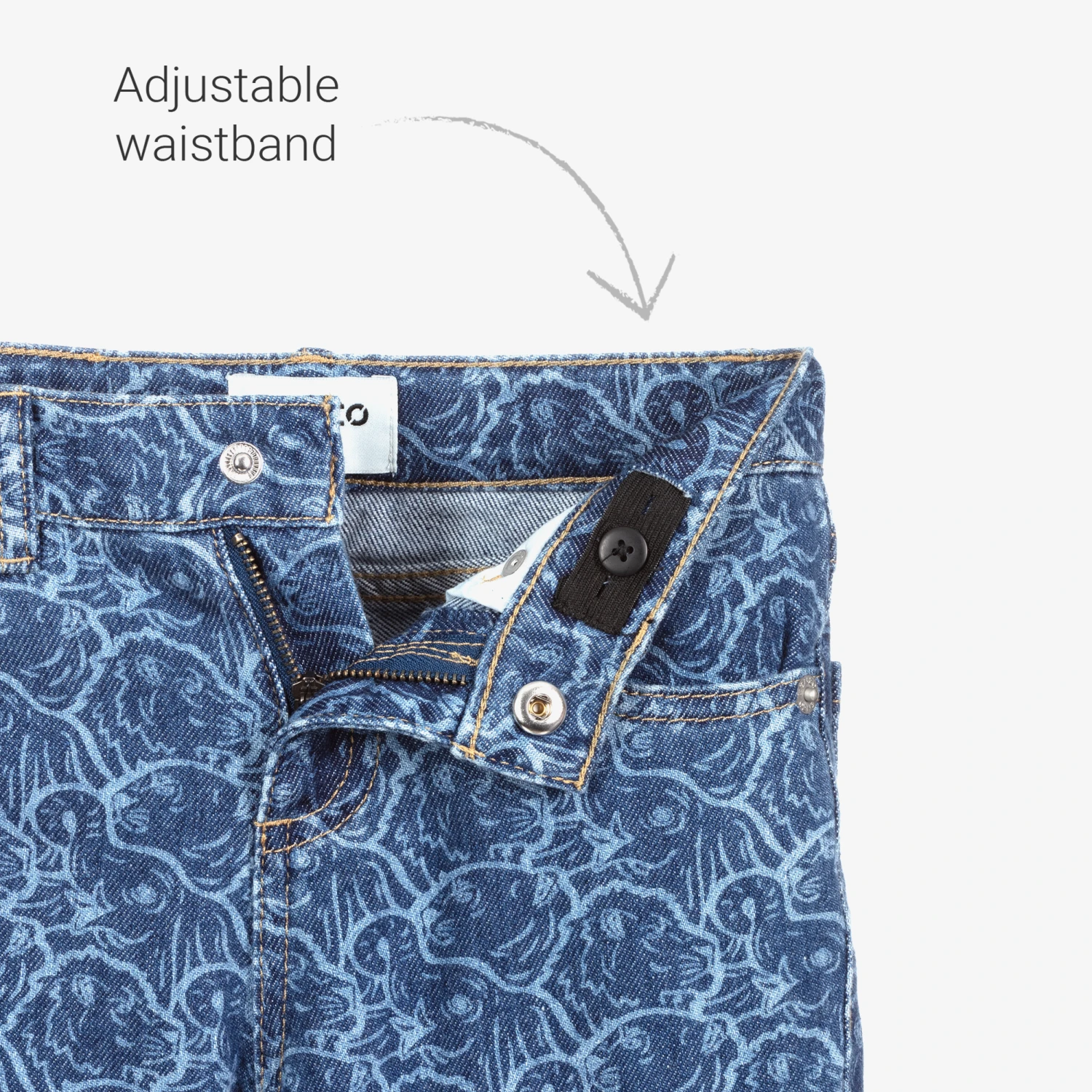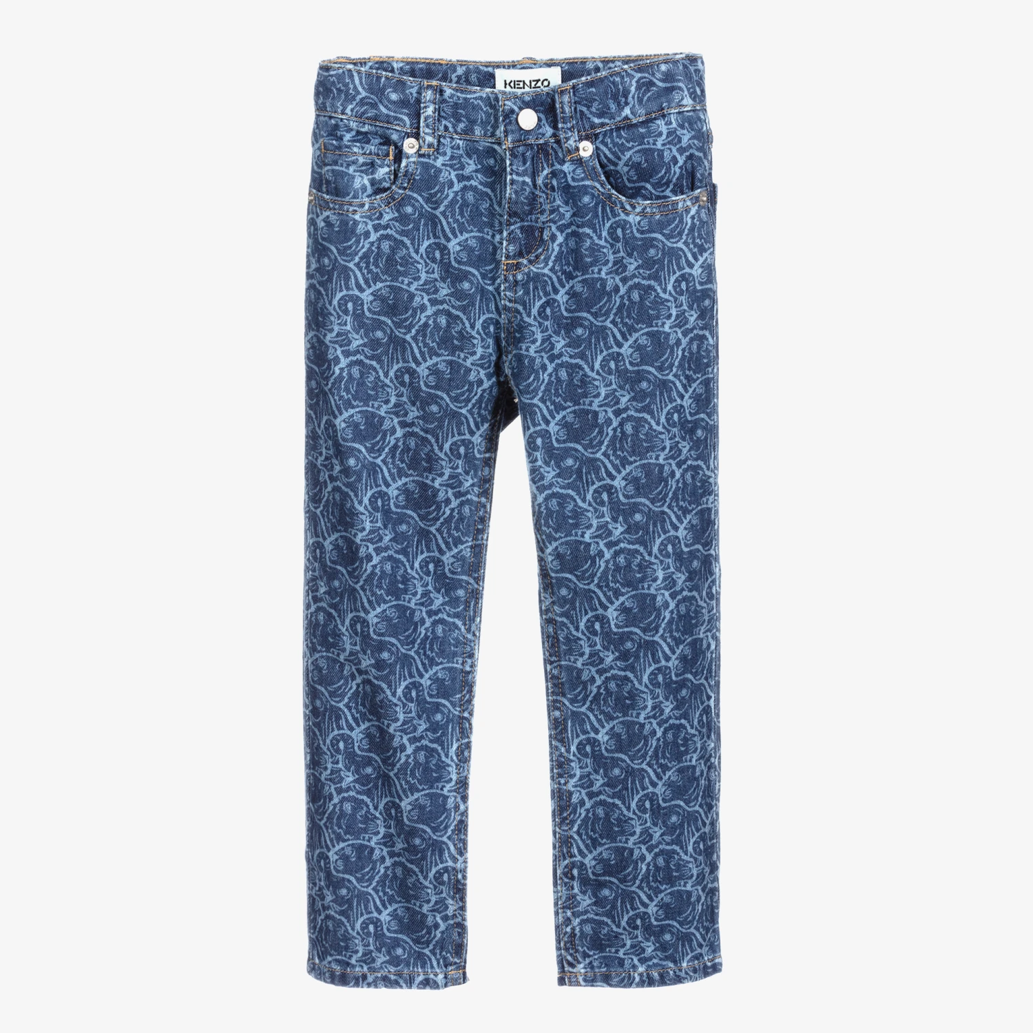 Boy mid-blue slim fit jeans by KENZO KIDS, made in soft, lightweight denim. They are patterned with a wildlife-inspired camo design that features the brand’s Tiger & Friends logo. In a classic five pocket design, they have an adjustable waistband, with a zip and popper fastening.