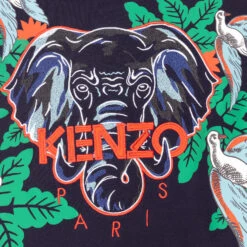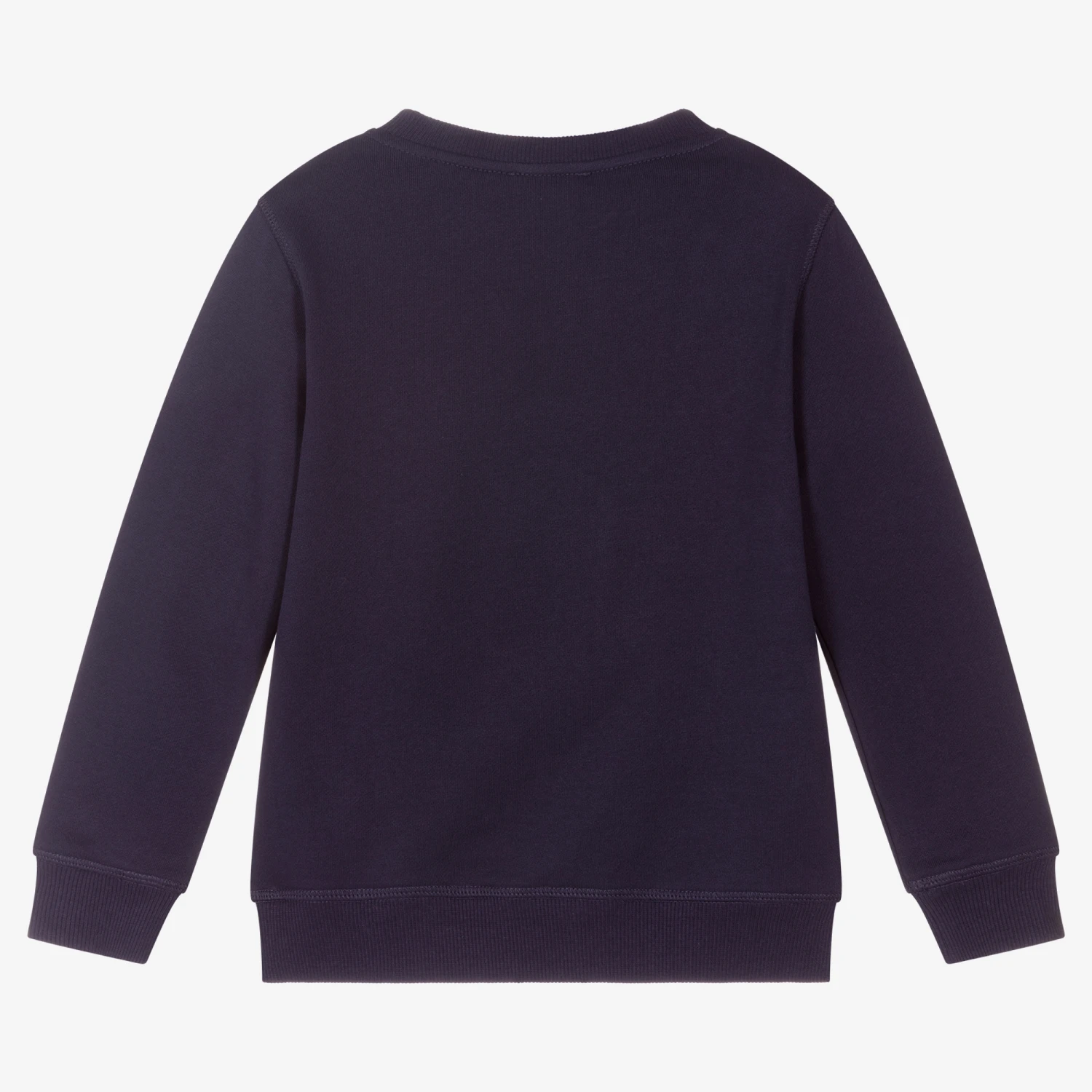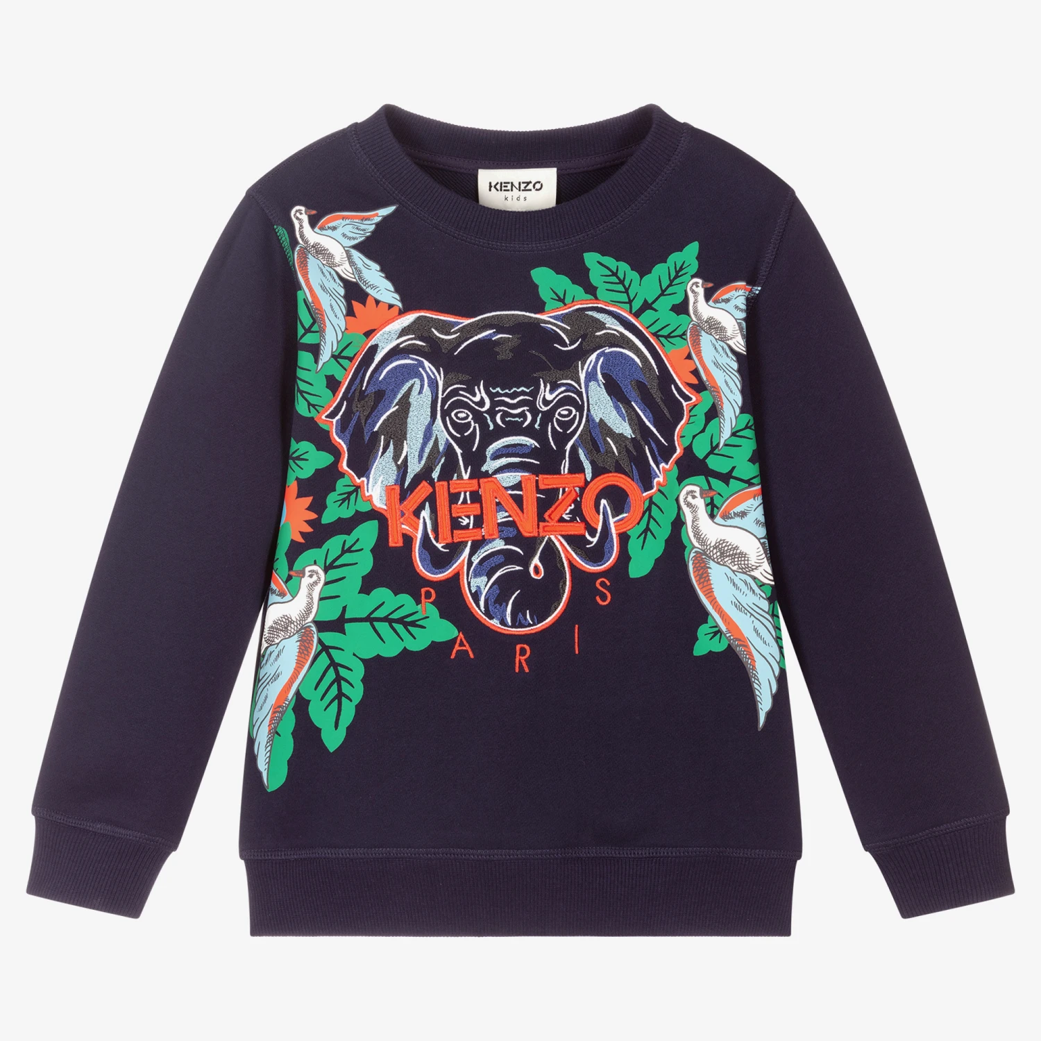 Navy blue sweatshirt for boys by KENZO KIDS, made in soft cotton jersey. The front is embroidered with a blue elephant motif, with the designer’s logo stitched below in bright orange.